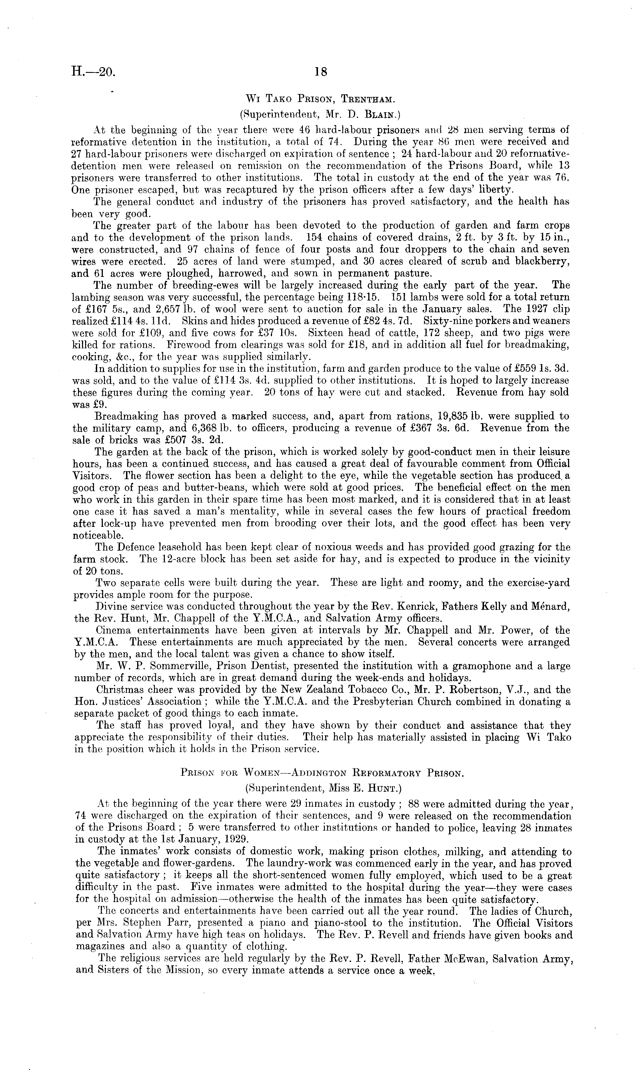 Wi Tako Prison, Teentham. (Superintendent, Mr. D. Blain.) At the beginning of the year there were 46 hard-labour prisoners and 28 men serving terms of reformative detention in the institution, a total of 74. During the year 86 men were received and 27 hard-labour prisoners were discharged on expiration of sentence ; 24 hard-labour and 20 reformativedetention men were released on remission on the recommendation of the Prisons Board, while 13 prisoners were transferred to other institutions. The total in custody at the end of the year was 76. One prisoner escaped, but was recaptured by the prison officers after a few days' liberty. The general conduct and industry of the prisoners has proved satisfactory, and the health has been very good. The greater part of the labour has been devoted to the production of garden and farm crops and to the development of the prison lands. 154 chains of covered drains, 2 ft. by 3 ft. by 15 in., were constructed, and 97 chains of fence of four posts and four droppers to the chain and seven wires were erected. 25 acres of land were stumped, and 30 acres cleared of scrub and blackberry, and 61 acres were ploughed, harrowed, and sown in permanent pasture. The number of breeding-ewes will be largely increased during the early part of the year. The lambing season was very successful, the percentage being 118-15. 151 lambs were sold for a total return of £167 55., and 2,657 lb. of wool were sent to auction for sale in the January sales. The 1927 clip realized £114 4s. lid. Skins and hides produced a revenue of £82 4s. 7d. Sixty-nine porkers and weaners were sold for £109, and five cows for £37 10s. Sixteen head of cattle, 172 sheep, and two pigs were killed for rations. Firewood from clearings was sold for £18, and in addition all fuel for breadmaking, cooking, &c., for the year was supplied similarly. In addition to supplies for use in the institution, farm and garden produce to the value of £559 Is. 3d. was sold, and to the value of £114 3s. 4d. supplied to other institutions. It is hoped to largely increase these figures during the coming year. 20 tons of hay were cut and stacked. Revenue from hay sold was £9. Breadmaking has proved a marked success, and, apart from rations, 19,835 lb. were supplied to the military camp, and 6,368 lb. to officers, producing a revenue of £367 3s. 6d. Revenue from the sale of bricks was £507 3s. 2d. The garden at the back of the prison, which is worked solely by good-conduct men in their leisure hours, has been a continued success, and has caused a great deal of favourable comment from Official Visitors. The flower section has been a delight to the eye, while the vegetable section has produced a good crop of peas and butter-beans, which were sold at good prices. The beneficial effect on the men who work in this garden in their spare time has been most marked, and it is considered that in at least one case it has saved a man's mentality, while in several cases the few hours of practical freedom after lock-up have prevented men from brooding over their lots, and the good effect has been very noticeable. The Defence leasehold has been kept clear of noxious weeds and has provided good grazing for the farm stock. The 12-acre block has been set aside for hay, and is expected to produce in the vicinity of 20 tons. Two separate cells were built during the year. These are light and roomy, and the exercise-yard provides ample room for the purpose. Divine service was conducted throughout the year by the Rev. Kenrick, Fathers Kelly and Menard, the Rev. Hunt, Mr. Chappell of the Y.M.C.A., and Salvation Army officers. Cinema entertainments have been given at intervals by Mr. Chappell and Mr. Power, of the Y.M.C.A. These entertainments are much appreciated by the men. Several concerts were arranged by the men, and the local talent was given a chance to show itself. Mr. W. P. Sommerville, Prison Dentist, presented the institution with a gramophone and a large number of records, which are in great demand during the week-ends and holidays. Christmas cheer was provided by the New Zealand Tobacco Co., Mr. P. Robertson, V.J., and the Hon. Justices' Association ; while the Y.M.C.A. and the Presbyterian Church combined in donating a separate packet of good things to each inmate. The staff has proved loyal, and they have shown by their conduct and assistance that they appreciate the responsibility of their duties. Their help has materially assisted in placing Wi Tako in the position which it holds in the Prison service. Prison for Women—Adbington Reformatory Prison. (Superintendent, Miss E. Hunt.) At the beginning of the year there were 29 inmates in custody ; 88 were admitted during the year, 74 were discharged on the expiration of their sentences, and 9 were released on the recommendation of the Prisons Board ; 5 were transferred to other institutions or handed to police, leaving 28 inmates in custody at the Ist January, 1929. The inmates' work consists of domestic work, making prison clothes, milking, and attending to the vegetable and flower-gardens. The laundry-work was commenced early in the year, and has proved quite satisfactory ; it keeps all the short-sentenced women fully employed, which used to be a great difficulty in the past. Five inmates were admitted to the hospital during the year —they were cases for the hospital on admission—otherwise the health of the inmates has been quite satisfactory. The concerts and entertainments have been carried out all the year round. The ladies of Church, per Mrs. Stephen Parr, presented a piano and piano-stool to the institution. The Official Visitors and Salvation Army have high teas on holidays. The Rev. P. Revell and friends have given books and magazines and also a quantity of clothing. The religious services are held regularly by the Rev. P. Revell, Father McEwan, Salvation Army, and Sisters of the Mission, so every inmate attends a service once a week.