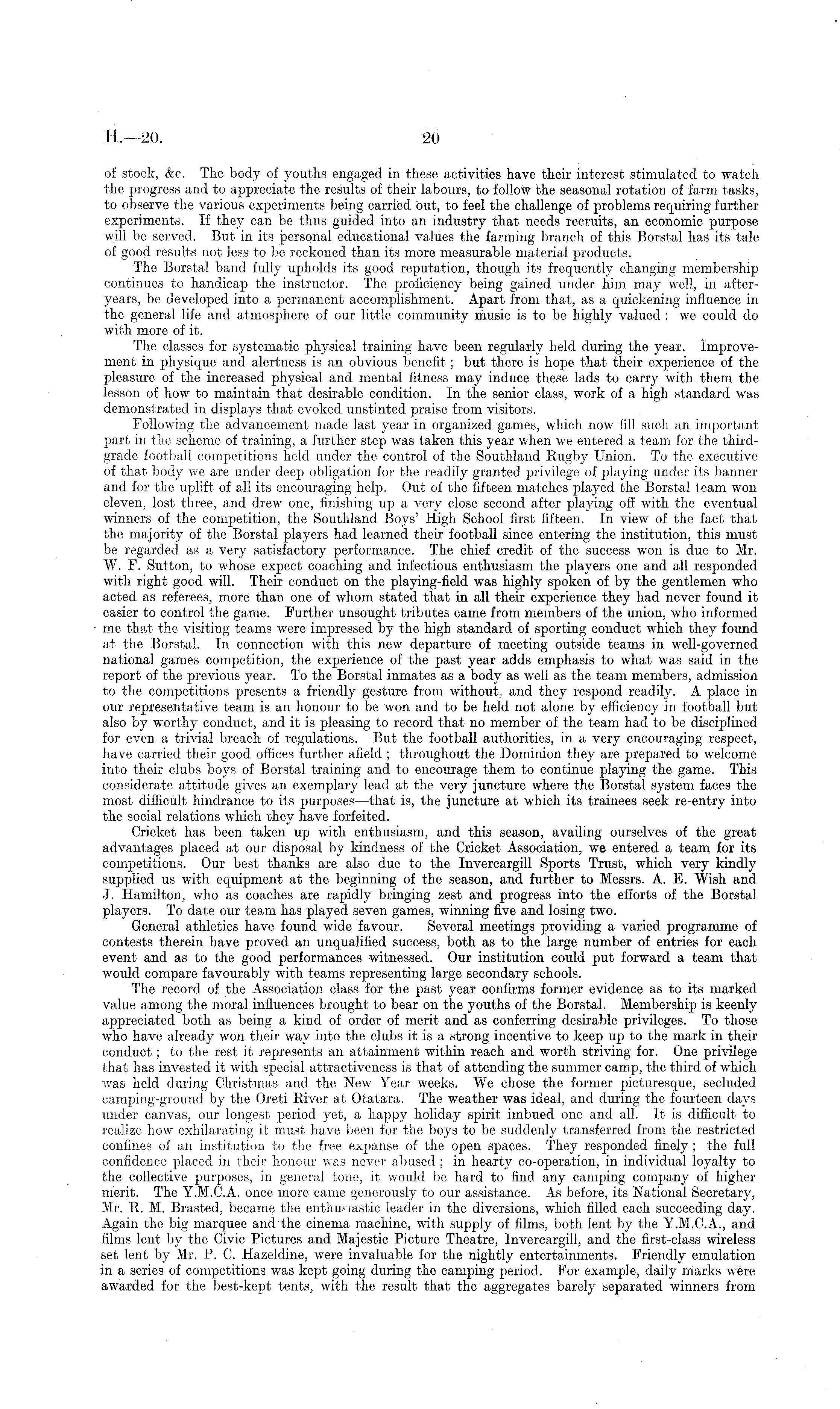 of stock, &c. The body of youths engaged in these activities have their interest stimulated to watch the progress and to appreciate the results of their labours, to follow the seasonal rotation of farm tasks, to observe the various experiments being carried "out, to feel the challenge of problems requiring further experiments. If they can be thus guided into an industry that needs recruits, an economic purpose will be served. But in its personal educational values the farming branch of this Borstal has its tale of good results not less to be reckoned than its more measurable material products. The Borstal band fully upholds its good reputation, though its frequently changing membership continues to handicap the instructor. The proficiency being gained under him may well, in afteryears, be developed into a permanent accomplishment. Apart from that, as a quickening influence in the general life and atmosphere of our little community music is to be highly valued : we could do with more of it. The classes for systematic physical training have been regularly held during the year. Improvement in physique and alertness is an obvious benefit; but there is hope that their experience of the pleasure of the increased physical and mental fitness may induce these lads to carry with them the lesson of how to maintain that desirable condition. In the senior class, work of a high standard was demonstrated in displays that evoked unstinted praise from visitors. Following the advancement made last year in organized games, which now fill such an important part in the scheme of training, a further step was taken this year when we entered a team for the thirdgrade football competitions held under the control of the Southland Rugby Union. To the executive of that body we are under deep obligation for the readily granted privilege of playing under its banner and for the uplift of all its encouraging help. Out of the fifteen matches played the Borstal team won eleven, lost three, and drew one, finishing up a very close second after playing off with the eventual winners of the competition, the Southland Boys' High School first fifteen. In view of the fact that the majority of the Borstal players had learned their football since entering the institution, this must be regarded as a very satisfactory performance. The chief credit of the success won is due to Mr. W. F. Sutton, to whose expect coaching and infectious enthusiasm the players one and all responded with right good will. Their conduct on the playing-field was highly spoken of by the gentlemen who acted as referees, more than one of whom stated that in all their experience they had never found iteasier to control the game. Further unsought tributes came from members of the union, who informed me that the visiting teams were impressed by the high standard of sporting conduct which they found at the Borstal. In connection with this new departure of meeting outside teams in well-governed national games competition, the experience of the past year adds emphasis to what was said in the report of the previous year. To the Borstal inmates as a body as well as the team members, admission to the competitions presents a friendly gesture from without, and they respond readily. A place in our representative team is an honour to be won and to be held not alone by efficiency in football but also by worthy conduct, and it is pleasing to record that no member of the team had to be disciplined for even a trivial breach of regulations. But the football authorities, in a very encouraging respect, have carried their good offices further afield ; throughout the Dominion they are prepared to welcome into their clubs boys of Borstal training and to encourage them to continue playing the game. This considerate attitude gives an exemplary lead at the very juncture where the Borstal system faces the most difficult hindrance to its purposes —that is, the juncture at which its trainees seek re-entry into the social relations which, they have forfeited. Cricket has been taken up with enthusiasm, and this season, availing ourselves of the great advantages placed at our disposal by kindness of the Cricket Association, we entered a team for its competitions. Our best thanks are also due to the Invercargill Sports Trust, which very kindly supplied us with equipment at the beginning of the season, and further to Messrs. A. E. Wish and J. Hamilton, who as coaches are rapidly bringing zest and progress into the efforts of the Borstal players. To date our team has played seven games, winning five and losing two. General athletics have found wide favour. Several meetings providing a varied programme of contests therein have proved an unqualified success, both as to the large number of entries for each event and as to the good performances witnessed. Our institution could put forward a team that would compare favourably with teams representing large secondary schools. The record of the Association class for the past year confirms former evidence as to its marked value among the moral influences brought to bear on the youths of the Borstal. Membership is keenly appreciated both as being a kind of order of merit and as conferring desirable privileges. To those who have already won their way into the clubs it is a strong incentive to keep up to the mark in their conduct; to the rest it represents an attainment within reach and worth striving for. One privilege that has invested it with special attractiveness is that of attending the summer camp, the third of which was held during Christmas and the New Year weeks. We chose the former picturesque, secluded camping-ground by the Oreti River at Otatara. The weather was ideal, and during the fourteen days under canvas, our longest period yet, a happy holiday spirit imbued one and all. It is difficult to realize how exhilarating it must have been for the boys to be suddenly transferred from the restricted confines of an institution to the free expanse