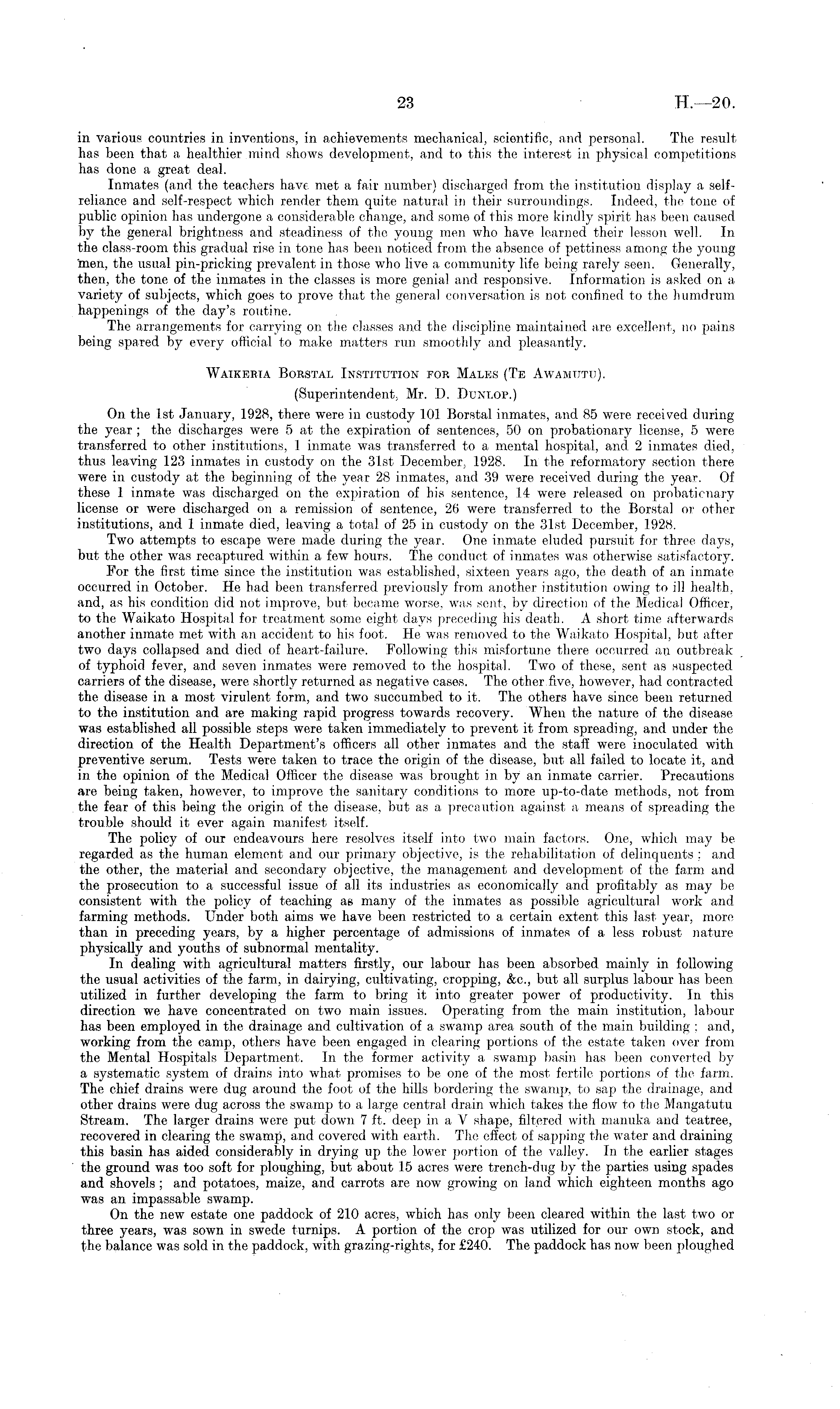 in various countries in inventions, in achievements mechanical, scientific, and personal. The resulthas been that a healthier mind shows development, and to this the interest in physical competitions has done a great deal. Inmates (and the teachers have met a fair number) discharged from the institution display a selfreliance and self-respect which render them quite natural in their surroundings. Indeed, the tone of public opinion has undergone a considerable change, and some of this more kindly spirit has been caused by the general brightness and steadiness of the young men who have learned their lesson well. In the class-room this gradual rise in tone has been noticed from the absence of pettiness among the young 'men, the usual pin-pricking prevalent in those who live a community life being rarely seen. Generally, then, the tone of the inmates in the classes is more genial and responsive. Information is asked on a variety of subjects, which goes to prove that the general conversation is not confined to the humdrum happenings of the day's routine. The arrangements for carrying on the classes and the discipline maintained are excellent, no pains being spared by every official to make matters run smoothly and pleasantly. Waikeria Borstal Institution for Males (Te Awamutu). (Superintendent, Mr. D. Dunlop.) On the Ist January, 1928, there were in custody 101 Borstal inmates, and 85 were received during the year ; the discharges were 5 at the expiration of sentences, 50 on probationary license, 5 were transferred to other institutions, ] inmate was transferred to a mental hospital, and 2 inmates died, thus leaving 123 inmates in custody on the 31st December, 1928. In the reformatory section there were in custody at the beginning of the year 28 inmates, and 39 were received during the year. Of these 1 inmate was discharged on the expiration of his sentence, 14 were released on probationary license or were discharged on a remission of sentence, 26 were transferred to the Borstal or other institutions, and 1 inmate died, leaving a total of 25 in custody on the 31st December, 1928. Two attempts to escape were made during the year. One inmate eluded pursuit for three days, but the other was recaptured within a few hours. The conduct of inmates was otherwise satisfactory. For the first time since the institution was established, sixteen years ago, the death of an inmate occurred in October. He had been transferred previously from another institution owing to ill health, and, as his condition did not improve, but became worse, was sent, by direction of the Medical Officer, to the Waikato Hospital for treatment some eight days preceding his death. A short time afterwards another inmate met with an accident to his foot. He was removed to the Waikato Hospital, but after two days collapsed and died of heart-failure. Following this misfortune there occurred an outbreak of typhoid fever, and seven inmates were removed to the hospital. Two of these, sent as suspected carriers of the disease, were shortly returned as negative cases. The other five, however, had contracted the disease in a most virulent form, and two succumbed to it. The others have since been returned to the institution and are making rapid progress towards recovery. When the nature of the disease was established all possible steps were taken immediately to prevent it from spreading, and under the direction of the Health Department's officers all other inmates and the staff were inoculated with preventive serum. Tests were taken to trace the origin of the disease, but all failed to locate it, and in the opinion of the Medical Officer the disease was brought in by an inmate carrier. Precautions are being taken, however, to improve the sanitary conditions to more up-to-date methods, not from the fear of this being the origin of the disease, but as a precaution against a means of spreading the trouble should it ever again manifest itself. The policy of our endeavours here resolves itself into two main factors. One, which may be regarded as the human element and our primary objective, is the rehabilitation of delinquents : and the other, the material and secondary objective, the management and development of the farm and the prosecution to a successful issue of all its industries as economically and profitably as may be consistent with the policy of teaching as many of the inmates as possible agricultural work and farming methods. Under both aims we have been restricted to a certain extent this last year, more than in preceding years, by a higher percentage of admissions of inmates of a less robust nature physically and youths of subnormal mentality. In dealing with agricultural matters firstly, our labour has been absorbed mainly in following the usual activities of the farm, in dairying, cultivating, cropping, &c., but all surplus labour has been utilized in further developing the farm to bring it into greater power of productivity. In this direction we have concentrated on two main issues. Operating from the main institution, labour has been employed in the drainage and cultivation of a swamp area south of the main building ; and, working from the camp, others have been engaged in clearing portions of the estate taken over from the Mental Hospitals Department. In the former activity a swamp basin has been converted by a systematic system of drains into what promises to be one of the most fertile portions of the farm. The chief drains were dug around the foot of the hills bordering the swamp, to sap the drainage, and other drains were dug across the swamp to a large central drain which takes the flow to the Mangatut/u Stream. The larger drains were put down 7 ft. deep in a V shape, filtered with manuka and teatree, recovered in clearing the swamp, and covered with earth. The effect of sapping the water and draining this basin has aided considerably in drying lip the lower portion of the valley. In the earlier stages the ground was too soft 