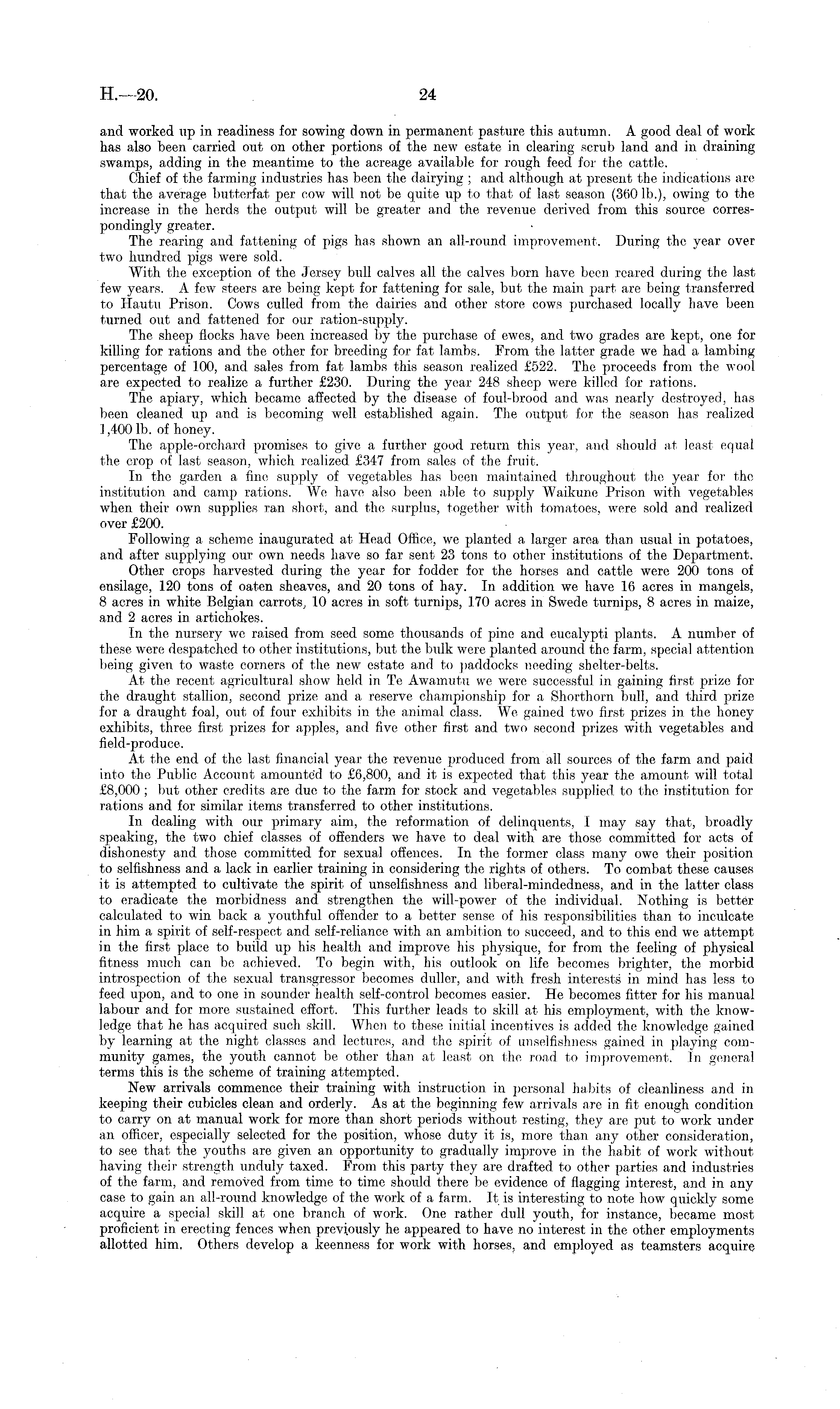 and worked up in readiness for sowing down in permanent pasture this autumn. A good deal of work has also been carried out on other portions of the new estate in clearing scrub land and in draining swamps, adding in the meantime to the acreage available for rough feed for the cattle. Chief of the farming industries has been the dairying ; and although at present the indications are that the average butterfat per cow will not be quite up to that of last season (360 lb.), owing to the increase in the herds the output will be greater and the revenue derived from this source correspondingly greater. The rearing and fattening of pigs has shown an all-round improvement. During the year over two hundred pigs were sold. With the exception of the Jersey bull calves all the calves born have been reared during the last few years. A few steers are being kept for fattening for sale, but the main part are being transferred to Hautu Prison. Cows culled from the dairies and other store cows purchased locally have been turned out and fattened for our ration-supply. The sheep flocks have been increased by the purchase of ewes, and two grades are kept, one for killing for rations and the other for breeding for fat lambs. From the latter grade we had a lambing percentage of 100, and sales from fat lambs this season realized £522. The proceeds from the wool are expected to realize a further £230. During the year 248 sheep were killed for rations. The apiary, which became affected by the disease of foul-brood and was nearly destroyed, has been cleaned up and is becoming well established again. The output for the season has realized 1,400 lb. of honey. The apple-orchard promises to give a further good return this year, and should at least equal the crop of last season, which realized £347 from sales of the fruit. In the garden a fine supply of vegetables has been maintained throughout the year for the institution and camp rations. We have also been able to supply Waikune Prison with vegetables when their own supplies ran short, and the surplus, together with tomatoes, were sold and realized over £200. Following a scheme inaugurated at. Head Office, we planted a larger area than usual in potatoes, and after supplying our own needs have so far sent 23 tons to other institutions of the Department. Other crops harvested during the year for fodder for the horses and cattle were 200 tons of ensilage, 120 tons of oaten sheaves, and 20 tons of hay. In addition we have 16 acres in mangels, 8 acres in white Belgian carrots, 10 acres in soft turnips, 170 acres in Swede turnips, 8 acres in maize, and 2 acres in artichokes. In the nursery we raised from seed some thousands of pine and eucalypti plants. A number of these were despatched to other institutions, but the bulk were planted around the farm, special attention being given to waste comers of the new estate and to paddocks needing shelter-belts. At the recent agricultural show held in Te Awamutu we were successful in gaining first prize for the draught stallion, second prize and a reserve championship for a Shorthorn bull, and third prize for a draught foal, out of four exhibits in the animal class. We gained two first prizes in the honey exhibits, three first prizes for apples, and five other first and two second prizes with vegetables and field-produce. At the end of the last financial year the revenue produced from all sources of the farm and paid into the Public Account amounted to £6,800, and it is expected that this year the amount will total £8,000 ; but other credits are due to the farm for stock and vegetables supplied to the institution for rations and for similar items transferred to other institutions. In dealing with our primary aim, the reformation of delinquents, I may say that, broadly speaking, the two chief classes of offenders we have to deal with are those committed for acts of dishonesty and those committed for sexual offences. In the former class many owe their position to selfishness and a lack in earlier training in considering the rights of others. To combat these causes it is attempted to cultivate the spirit of unselfishness and liberal-mindedness, and in the latter class to eradicate the morbidness and strengthen the will-power of the individual. Nothing is better calculated to win back a youthful offender to a better sense of his responsibilities than to inculcate in him a spirit of self-respect and self-reliance with an ambition to succeed, and to this end we attempt in the first place to build up his health and improve his physique, for from the feeling of physical fitness much can be achieved. To begin with, his outlook on life becomes brighter, the morbid introspection of the sexual transgressor becomes duller, and with fresh interests in mind has less to feed upon, and to one in sounder health self-control becomes easier. He becomes fitter for his manual labour and for more sustained effort. This further leads to skill at his employment, with the knowledge that he has acquired such skill. When to these initial incentives is added the knowledge gained by learning at the night classes and lectures, and the spirit of unselfishness gained in playing community games, the youth cannot be other than at least on the road to improvement. Tn general terms this is the scheme of training attempted. New arrivals commence their training with instruction in jiersonal habits of cleanliness and in keeping their cubicles clean and orderly. As at the beginning few arrivals are in fit enough condition to carry on at manual work for more than short periods without resting, they are put to work under an officer, especially selected for the position, whose duty it is, more than any other consideration, to see that the youths are given an opportunity to gradually improve in the habit of work without having their strength unduly taxed. From this party they are drafted to other parties and industries of the farm, and removed from time to time should the