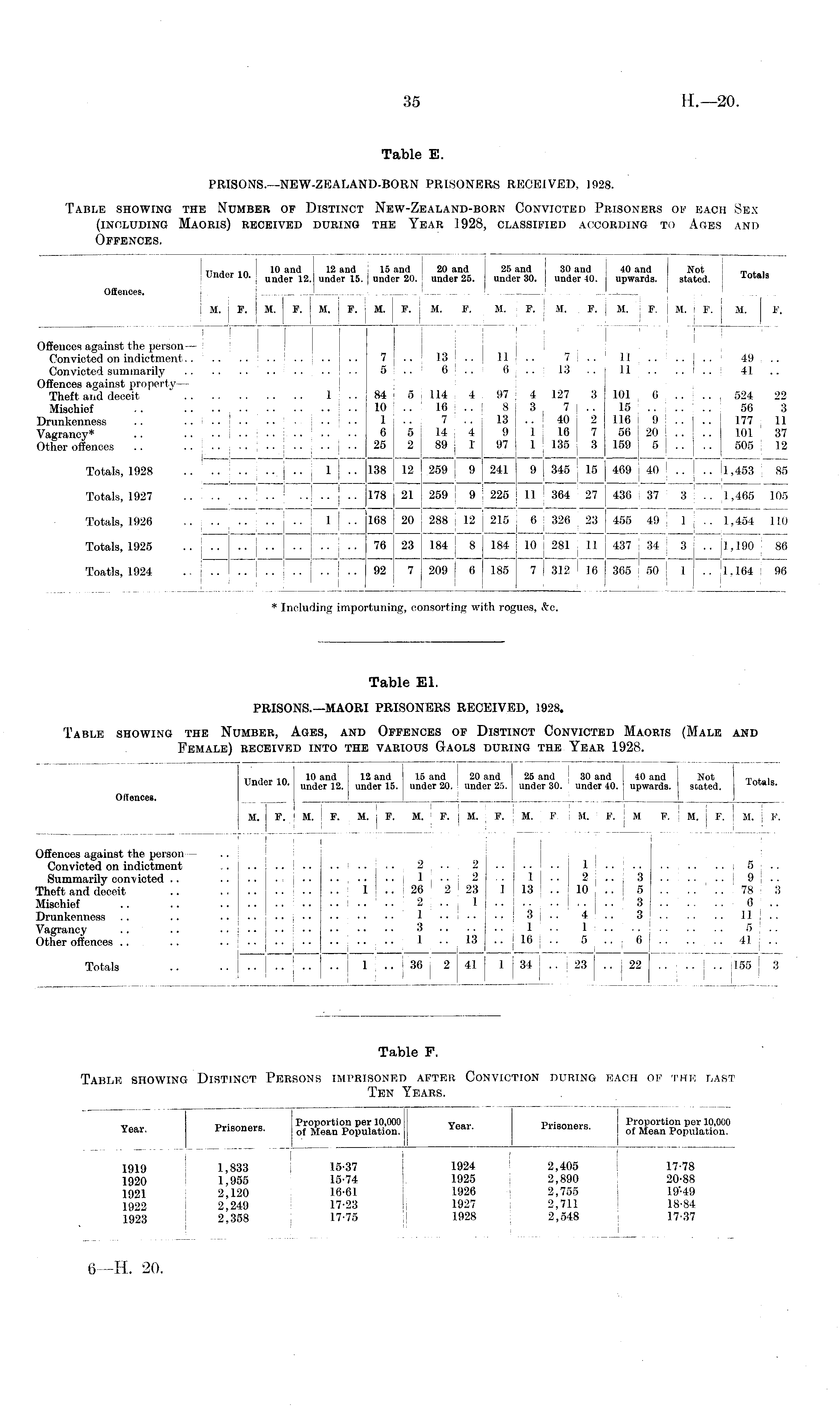 Table E1. PRISONS.—MAORI PRISONERS RECEIVED, 1928. Table showing the Number, Ages, and Offences of Distinct Convicted Maoris (Male and Female) received into the various Gaols during the Year 1928.