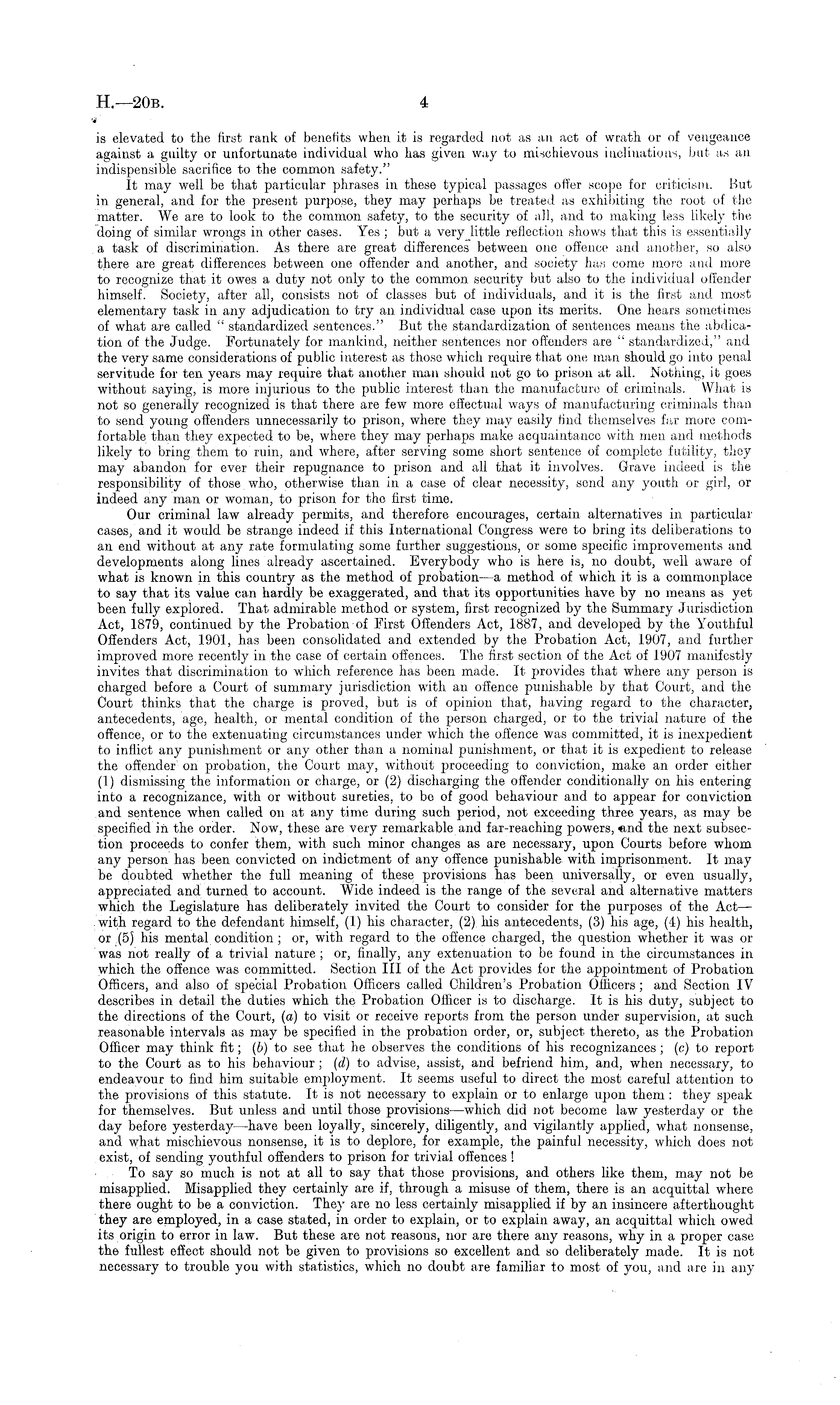 is elevated to the first rank of benefits when it is regarded not as an act of wrath or of vengeance against a guilty or unfortunate individual who has given way to mischievous inclinations, but as an indispensible sacrifice to the common safety." It may well be that particular phrases in these typical passages offer scope for criticism. But in general, and for the present purpose, they may perhaps be treated as exhibiting the root of the matter. We are to look to the common safety, to the security of all, and to making less likely the doing of similar wrongs in other cases. Yes ; but a very little reflection shows that this is essentially a task of discrimination. As there are great differences between one offence and another, so also there are great differences between one offender and another, and society has come more and more to recognize that it owes a duty not only to the common security but also to the individual offender himself. Society, after all, consists not of classes but of individuals, and it is the first and most elementary task in any adjudication to try an individual case upon its merits. One hears sometimes of what are called " standardized sentences." But the standardization of sentences means the abdication of the Judge. Fortunately for mankind, neither sentences nor offenders are " standardized," and the very same considerations of public interest as those which require that one man should go into penal servitude for ten years may require that another man should not go to prison at all. Nothing, it goes without saying, is more injurious to the public interest than the manufacture of criminals. What is not so generally recognized is that there are few more effectual ways of manufacturing criminals than to send young offenders unnecessarily to prison, where they may easily find themselves far more comfortable, than they expected to be, where they may perhaps make acquaintance with men and methods likely to bring them to ruin, and where, after serving some short sentence of complete futility, they may abandon for ever their repugnance to prison and all that it involves. Grave indeed is the responsibility of those who, otherwise than in a case of clear necessity, send any youth or girl, or indeed any man or woman, to prison for the first time. Our criminal law already permits, and therefore encourages, certain alternatives in particular cases, and it would be strange indeed if this International Congress were to bring its deliberations to an end without at any rate formulating some further suggestions, or some specific improvements and developments along lines already ascertained. Everybody who is here is, no doubt, well aware of what is known in this country as the method of probation—a method of which it is a commonplace to say that its value can hardly be exaggerated, and that its opportunities have by no means as yet been fully explored. That admirable method or system, first recognized by the Summary Jurisdiction Act, 1879, continued by the Probation of First Offenders Act, 1887, and developed by the Youthful Offenders Act, 1901, has been consolidated and extended by the Probation Act, 1907, and further improved more recently in the case of certain offences. The first section of the Act of 1907 manifestly invites that discrimination to which reference has been made. It provides that where any person is charged before a Court of summary jurisdiction with an offence punishable by that Court, and the Court thinks that the charge is proved, but is of opinion that, having regard to the character, antecedents, age, health, or mental condition of the person charged, or to the trivial nature of the offence, or to the extenuating circumstances under which the offence was committed, it is inexpedient to inflict any punishment or any other than a nominal punishment, or that it is expedient to release the offender on probation, the Court may, without proceeding to conviction, make an order either (1) dismissing the information or charge, or (2) discharging the offender conditionally on his entering into a recognizance, with or without sureties, to be of good behaviour and to appear for conviction and sentence when called on at any time during such period, not exceeding three years, as may be specified in the order. Now, these are very remarkable and far-reaching powers, «nd the next subsection proceeds to confer them, with such minor changes as are necessary, upon Courts before whom any person has been convicted on indictment of any offence punishable with imprisonment. It may be doubted whether the full meaning of these provisions has been universally, or even usually, appreciated and turned to account. Wide indeed is the range of the several and alternative matters which the Legislature has deliberately invited the Court to consider for the purposes of the Act — with regard to the defendant himself, (1) his character, (2) his antecedents, (3) his age, (4) his health, or (5) his mental condition ; or, with regard to the offence charged, the question whether it was or was not really of a trivial nature ; or, finally, any extenuation to be found in the circumstances in which the offence was committed. Section 111 of the Act provides for the appointment of Probation Officers, and also of special Probation Officers called Children's Probation Officers; and Section IY describes in detail the duties which the Probation Officer is to discharge. It is his duty, subject to the directions of the Court, (a) to visit or receive reports from the person under supervision, at such reasonable intervals as may be specified in the probation order, or, subject thereto, as the Probation Officer may think fit; (b) to see that he observes the conditions of his recognizances; (c) to report to the Court as to his behaviour; (d) to advise, assist, and befriend him, and, when necessary, to endeavour to find him suitable employment. It seems useful to direct the most careful attention to the prov