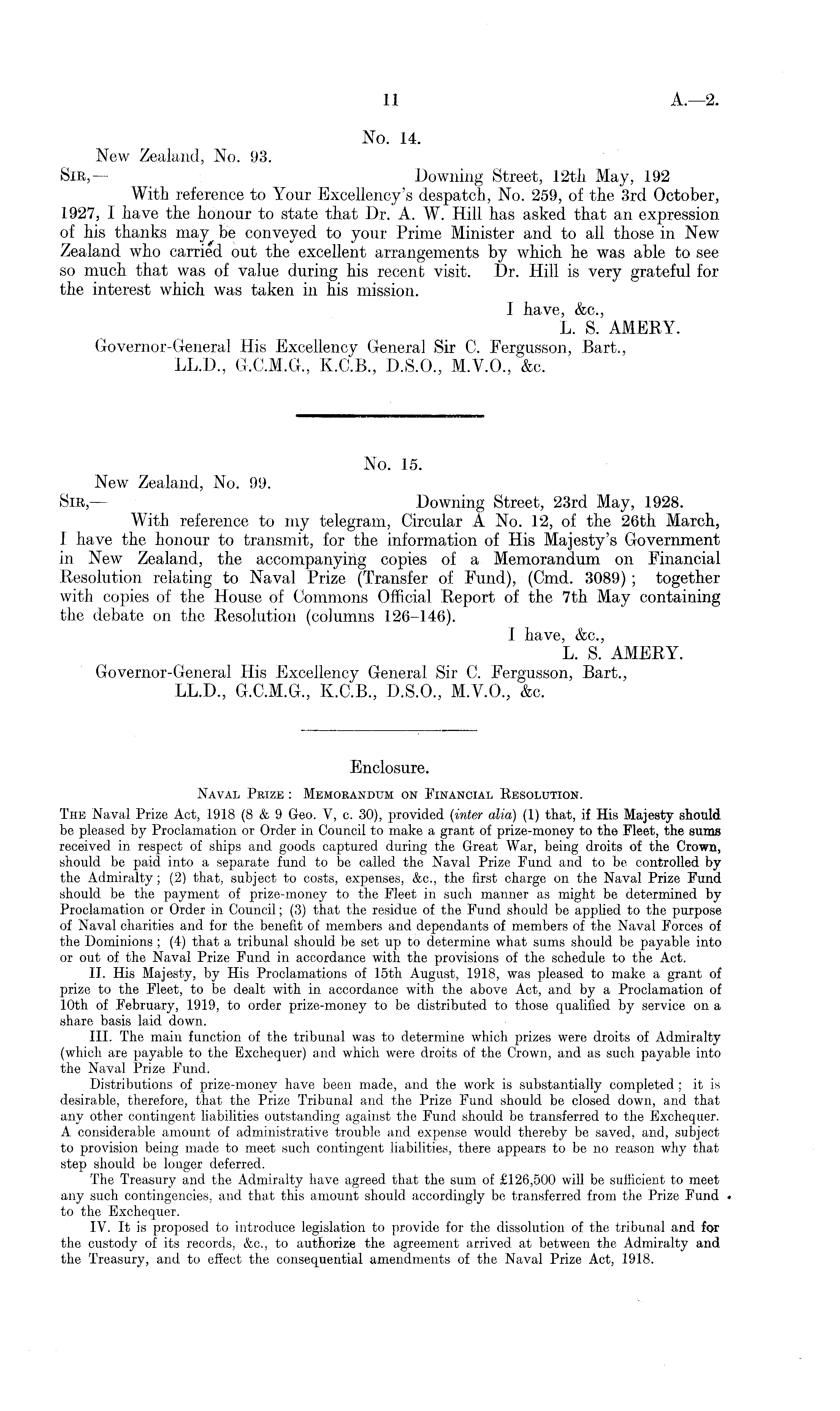 No. 15. New Zealand, No. 99. Sir, — Downing Street, 23rd May, 1928. With reference to my telegram, Circular A No. 12, of the 26th March, I have the honour to transmit, for the information of His Majesty's Government in New Zealand, the accompanying copies of a Memorandum on Financial Resolution relating to Naval Prize (Transfer of Fund), (Cmd. 3089) ; together with copies of the House of Commons Official Report of the 7th May containing the debate on the Resolution (columns 126-146). I have, &c., L. S. AMERY. Governor-General His Excellency General Sir C. Fergusson, Bart., LL.D., G.C.M.G., K.C.8., D.5.0., M.V.0., &c.