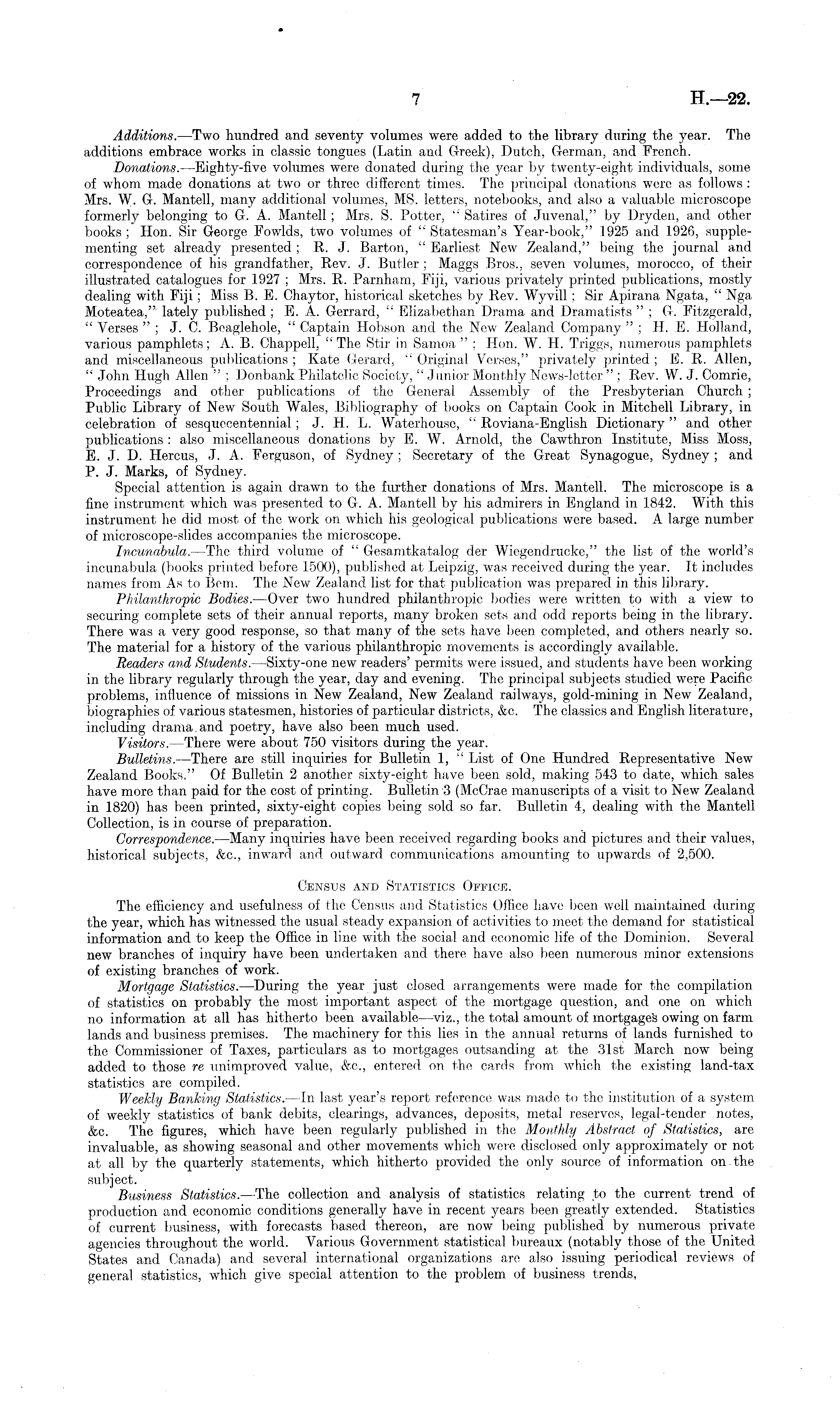 Additions. —Two hundred and seventy volumes were added to the library during the year. The additions embrace works in classic tongues (Latin and Greek), Dutch, German, and French. Donations.—Eighty-five volumes were donated during the year by twenty-eight individuals, some of whom made donations at two or three different times. The principal donations were as follows : Mrs. W. G. Mantell, many additional volumes, MS. letters, notebooks, and also a valuable microscope formerly belonging to G. A. Mantell; Mrs. S. Potter, " Satires of Juvenal," by Dryden, and other books ; Hon. Sir George Fowlds, two volumes of " Statesman's Year-book," 1925 and 1926, supplementing set already presented ; R. J. Barton, " Earliest New Zealand," being the journal and correspondence of his grandfather, Rev. J. Butler ; Maggs Bros., seven volumes, morocco, of their illustrated catalogues for 1927 ; Mrs. R. Parnham, Fiji, various privately printed publications, mostly dealing with Fiji; Miss B. E. Chaytor, historical sketches by Rev. Wyvill ; Sir Apirana Ngata, " Nga Moteatea,' v lately published ; E. A. Gerrard, " Elizabethan Drama and Dramatists " ; G. Fitzgerald, " Verses " ; J. C. Beaglehole, " Captain Hobson and the New Zealand Company " ; H. E. Holland, various pamphlets; A. B. Chappell, " The Stir in Samoa " ; Hon. W. H. Triggs, numerous pamphlets and miscellaneous publications ; Kate Gerard, " Original Verses," privately printed ; E. R. Allen, " John Hugh Allen " ; Donbank Philatelic Society, " Junior Monthly News-letter " ; Rev. W. J. Comrie, Proceedings and other publications of the General Assembly of the Presbyterian Church ; Public Library of New South Wales, Bibliography of books on Captain Cook in Mitchell Library, in celebration of sesquecentennial; J. H. L. Waterhouse, " Roviana-English Dictionary " and other publications : also miscellaneous donations by E. W. Arnold, the Cawthron Institute, Miss Moss, E. J. D. Hercus, J. A. Ferguson, of Sydney ; Secretary of the Great Synagogue, Sydney ; and P. J. Marks, of Sydney. Special attention is again drawn to the further donations of Mrs. Mantell. The microscope is a fine instrument which was presented to G. A. Mantell by his admirers in England in 1842. With this instrument he did most of the work on which his geological publications were based. A large number of microscope-slides accompanies the microscope. Incunabula. —The third volume of " Gesamtkatalog der Wiegendrucke," the list of the world's incunabula (books printed before 1500), published at Leipzig, was received during the year. It includes names from As to Bern. The New Zealand list for that publication was prepared in this library. Philanthropic Bodies.—Over two hundred philanthropic bodies were written to with a view to securing complete sets of their annual reports, many broken sets and odd reports being in the library. There was a very good response, so that many of the sets have been completed, and others nearly so. The material for a history of the various philanthropic movements is accordingly available. Readers and Students. —Sixty-one new readers' permits were issued, and students have been working in the library regularly through the year, day and evening. The principal subjects studied were Pacific problems, influence of missions in New Zealand, New Zealand railways, gold-mining in New Zealand, biographies of various statesmen, histories of particular districts, &c. The classics and English literature, including drama, and poetry, have also been much used. Visitors. —There were about 750 visitors during the year. Bulletins.—There are still inquiries for Bulletin 1, " List of One Hundred Representative New Zealand Books." Of Bulletin 2 another sixty-eight have been sold, making 543 to date, which sales have more than paid for the cost of printing. Bulletin 3 (McCrae manuscripts of a visit to New Zealand in 1820) has been printed, sixty-eight copies being sold so far. Bulletin 4, dealing with the Mantell Collection, is in course of preparation. Correspondence. —Many inquiries have been received regarding books and pictures and their values, historical subjects, &c., inward and outward communications amounting to upwards of 2,500. Census and Statistics Office. The efficiency and usefulness of the Census and Statistics Office have been well maintained during the year, which has witnessed the usual steady expansion of activities to meet the demand for statistical information and to keep the Office in line with the social and economic life of the Dominion. Several new branches of inquiry have been undertaken and there have also been numerous minor extensions of existing branches of work. Mortgage Statistics. —During the year just closed arrangements were made for the compilation of statistics on probably the most important aspect of the mortgage question, and one on which no information at all has hitherto been available—viz., the total amount of mortgages owing on farm lands and business premises. The machinery for this lies in the annual returns of lands furnished to the Commissioner of Taxes, particulars as to mortgages outsanding at the 31st March now being added to those re unimproved value, &c., entered on the cards from which the existing land-tax statistics are compiled. Weekly Banking Statistics. —In last year's report reference was made to the institution of a system of weekly statistics of bank debits, clearings, advances, deposits, metal reserves, legal-tender notes, &c. The figures, which have been regularly published in the Monthly Abstract of Statistics, are invaluable, as showing seasonal and other movements which were disclosed only approximately or not at all by the quarterly statements, which hitherto provided the only source of information on the subject. Business Statistics. —The collection and analysis of statistics relating to the current trend of production and economic conditions generally have in recent years been greatly extended. Stat