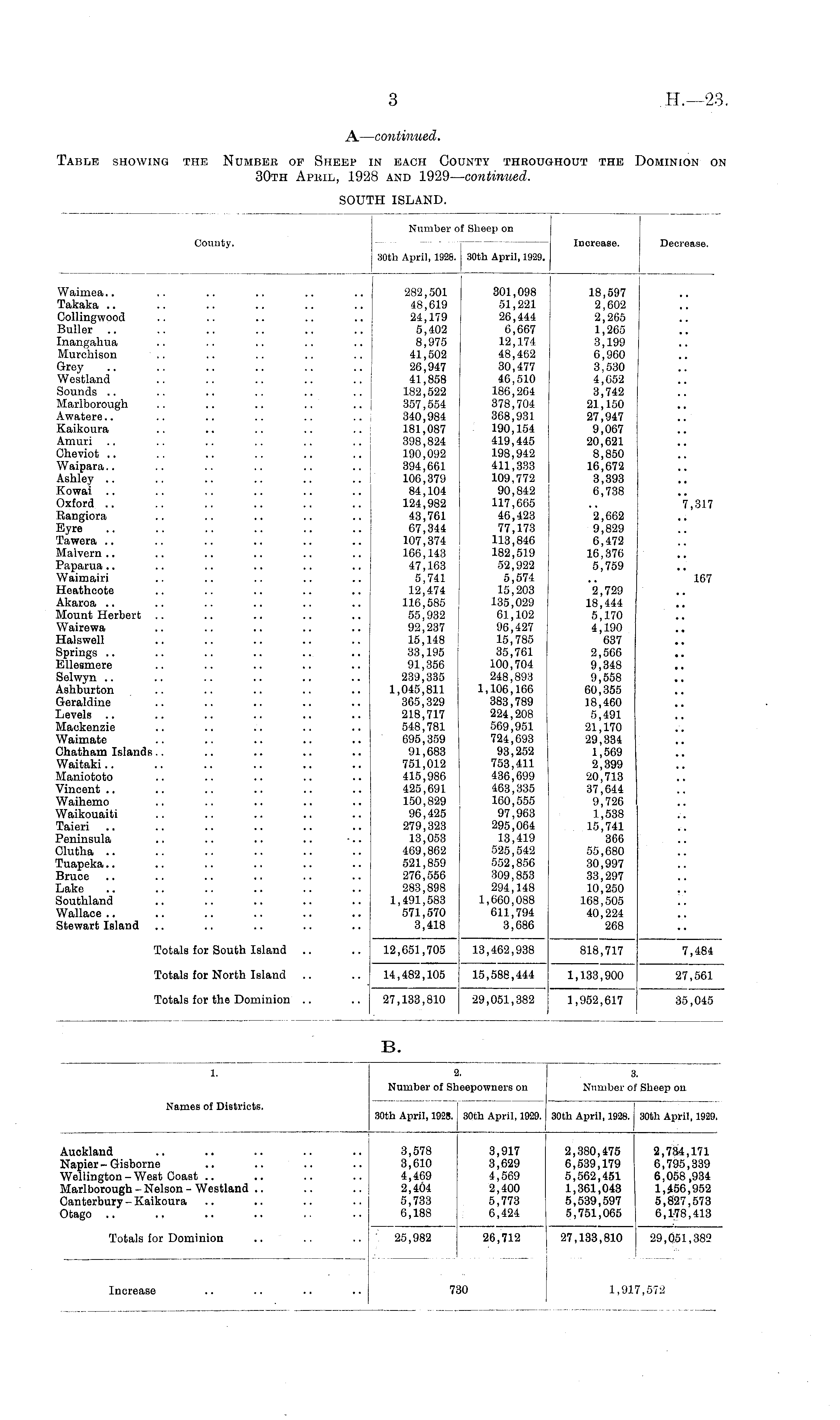 Number of Sheep on County. Increase. Decrease. 30th April, 1926. 30th April, 1929. Waimea.. .. .. .. .. .. 282,501 301,098 18,597 Takaka .. .. .. .. .. .. 48,619 51,221 2,602 Collingwood .. .. .. .. .. 24,179 26,444 2,265 Buller .. .. .. .. .. .. 5,402 6,667 1,265 Inangahua .. .. .. .. .. 8,975 12,174 3,199 Murchison .. .. .. .. .. 41,502 48,462 6,960 Grey .. .. .. .. .. .. 26,947 30,477 3,530 Westland .. .. .. .. .. 41,858 46,510 4,652 Sounds .. .. .. .. .. .. 182,522 186,264 3,742 Marlborough .. .. .. .. .. 357,554 378,704 21,150 Awatere.. .. .. .. .. .. 340,984 368,931 27,947 Kaikoura .. .. .. .. .. 181,087 190,154 9,067 Amuri .. .. .. .. .. .. 398,824 419,445 20,621 Cheviot .. .. .. .. .. | 190,092 198,942 8,850 Waipara.. .. .. .. .. .. 394,661 411,333 16,672 Ashley .. .. .. .. .. .. 106,379 109,772 3,393 Kowai .. .. .. .. .. 84,104 90,842 6,738 Oxford .. .. .. .. .. .. 124,982 117,665 .. 7,317 Rangiora .. .. .. .. .. 43,761 46,423 2,662 Eyre .. .. .. .. .. .. 67,344 77,173 9,829 Tawera .. .. .. .. .. .. 107,374 113,846 6,472 Malvern.. .. .. .. .. .. 166,143 182,519 16,376 Paparua.. .. .. .. .. .. 47,163 52,922 5,759 Waimairi .. .. .. .. .. 5,741 5,574 .. 167 Heathcofce .. .. .. .. .. 12,474 15,203 2,729 Akaroa .. .. .. .. .. .. 116,585 135,029 18,444 Mount Herbert .. .. .. .. .. 55,932 61,102 5,170 Wairewa .. .. .. .. .. 92,237 96,427 4,190 Halswell .. .. .. .. .. 15,148 15,785 637 Springs .. .. .. .. .. .. 33,195 35,761 2,566 Ellesmere .. .. .. .. .. 91,356 100,704 9,348 .. Selwyn .. .. .. .. .. .. 239,335 248,893 9,558 Ashburton .. .. .. .. .. 1,045,811 1,106,166 60,355 Geraldine .. .. .. .. .. 365,329 383,789 18,460 Levels .. .. .. .. .. .. 218,717 224,208 5,491 Mackenzie .. .. .. .. .. 548,781 569,951 21,170 Waimate .. .. .. .. .. 695,359 724,693 29,334 Chatham Islands.. .. .. .. .. 91,683 93,252 1,569 Waitaki.. .. .. .. .. .. 751,012 753,411 2,399 Maniototo .. .. .. .. .. 415,986 436,699 20,713 Vincent.. .. .. .. .. .. 425,691 463,335 37,644 Waihemo .. .. .. .. .. 150,829 160,555 9,726 Waikouaiti .. .. .. .. .. 96,425 97,963 1,538 Taieri .. .. .. .. .. .. 279,323 295,064 15,741 Peninsula .. .. .. .. •.. 13,053 13,419 366 Clutha .. .. .. .. .. .. 469,862 525,542 55,680 Tuapeka.. .. .. .. .. .. 521,859 552,856 30,997 Bruce .. .. .. .. .. .. 276,556 309,853 33,297 Lake .. .. .. .. .. .. 283,898 294,148 10,250 Southland .. .. .. .. .. 1,491,583 1,660,088 168,505 Wallace.. .. .. .. .. .. 571,570 611,794 40,224 Stewart Island .. .. .. .. .. 3,418 3,686 268 Totals for South Island .. .. 12,651,705 13,462,938 818,717 7,484 Totals for North Island .. .. 14,482,105 15,588,444 1,133,900 27,561 Totals for the Dominion .. .. 27,133,810 29,051,382 1,952,617 35,045