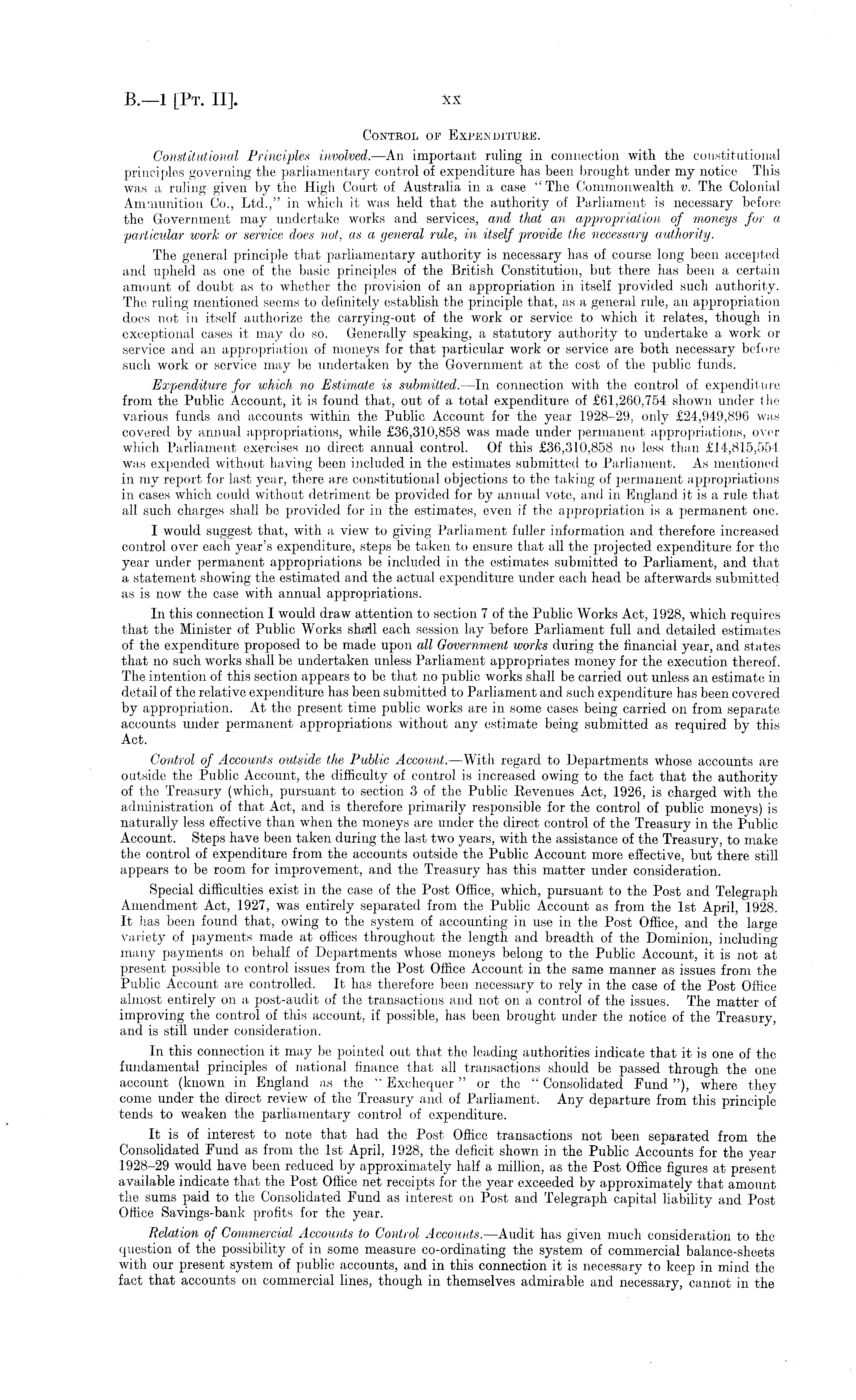 Control op Expenditure. Constitutional Principles involved. —An important ruling in connection with the constitutional principles governing the parliamentary control of expenditure has been brought under my notice This was a ruling given by the High Court of Australia in a case " The Commonwealth v. The Colonial Ammunition Co., Ltd.," in which it was held that the authority of Parliament is necessary before the Government may undertake works and services, and that an appropriation of moneys for a particular work or service does not, as a general rule, in itself provide the necessary authority. The general principle that parliamentary authority is necessary has of course long been accepted and upheld as one of the basic principles of the British Constitution, but there has been a certain amount of doubt as to whether the provision of an appropriation in itself provided such authority. The ruling mentioned seems to definitely establish the principle that, as a general rule, an appropriation does not in itself authorize the carrying-out of the work or service to which it relates, though in exceptional cases it may do so. Generally speaking, a statutory authority to undertake a work or service and an appropriation of moneys for that particular work or service are both necessary before such work or service may be undertaken by the Government at the cost of the public funds. Expenditure for which no Estimate is submitted. —In connection with the control of expenditure from the Public Account, it is found that, out of a total expenditure of £61,260,754 shown under the various funds and accounts within the Public Account for the year 1928-29. only £24,94-9,896 was covered by annual appropriations, while £36,310,858 was made under permanent appropriations, over which Parliament exercises no direct annual control. Of this £36,310,858 no less than £14,815,554 was expended without having been included in the estimates submitted to Parliament. As mentioned in my report for last year, there are constitutional objections to the taking of permanent appropriations in cases which could without detriment be provided for by annual vote, and in England it is a rule that all such charges shall be provided for in the estimates, even if the appropriation is a permanent one. I would suggest that, with a view to giving Parliament fuller information and therefore increased control over each year's expenditure, steps be taken to ensure that all the projected expenditure for the year under permanent appropriations be included in the estimates submitted to Parliament, and that a statement showing the estimated and the actual expenditure under each head be afterwards submitted as is now the case with annual appropriations. In this connection I would draw attention to section 7 of the Public Works Act, 1928, which requires that the Minister of Public Works sharil each session lay before Parliament full and detailed estimates of the expenditure proposed to be made upon all Government works during the financial year, and states that no such works shall be undertaken unless Parliament appropriates money for the execution thereof. The intention of this section appears to be that no public works shall be carried out unless an estimate in detail of the relative expenditure has been submitted to Parliament and such expenditure has been covered by appropriation. At the present time public works are in some cases being carried on from separate accounts under permanent appropriations without any estimate being submitted as required by this Act. Control of Accounts outside the Public Account.—With regard to Departments whose accounts are outside the Public Account, the difficulty of control is increased owing to the fact that the authority of the Treasury (which, pursuant to section 3 of the Public Revenues Act, 1926, is charged with the administration of that Act, and is therefore primarily responsible for the control of public moneys) is naturally less effective than when the moneys are under the direct control of the Treasury in the Public Account. Steps have been taken during the last two years, with the assistance of the Treasury, to make the control of expenditure from the accounts outside the Public Account more effective, but there still appears to be room for improvement, and the Treasury has this matter under consideration. Special difficulties exist in the case of the Post Office, which, pursuant to the Post and Telegraph Amendment Act, 1927, was entirely separated from the Public Account as from the Ist April, 1928. It has been found that, owing to the system of accounting in use in the Post Office, and the large variety of payments made at offices throughout the length and breadth of the Dominion, including many payments on behalf of Departments whose moneys belong to the Public Account, it is not at present possible to control issues from the Post Office Account in the same manner as issues from the Public Account are controlled. It has therefore been necessary to rely in the case of the Post Office almost entirely on a post-audit of the transactions and not on a control of the issues. The matter of improving the control of this account, if possible, has been brought under the notice of the Treasury, and is still under consideration. In this connection it may be pointed out that the leading authorities indicate that it is one of the fundamental principles of national finance that all transactions should be passed through the one account (known in England as the " Exchequer" or the " Consolidated Fund "), where they come under the direct review of the Treasury and of Parliament. Any departure from this principle tends to weaken the parliamentary control of expenditure. It is of interest to note that had the Post Office transactions not been separated from the Consolidated Fund as from the Ist April, 1928, the deficit shown in the Public Accounts for the year 1928-29 would have been reduced by approximately