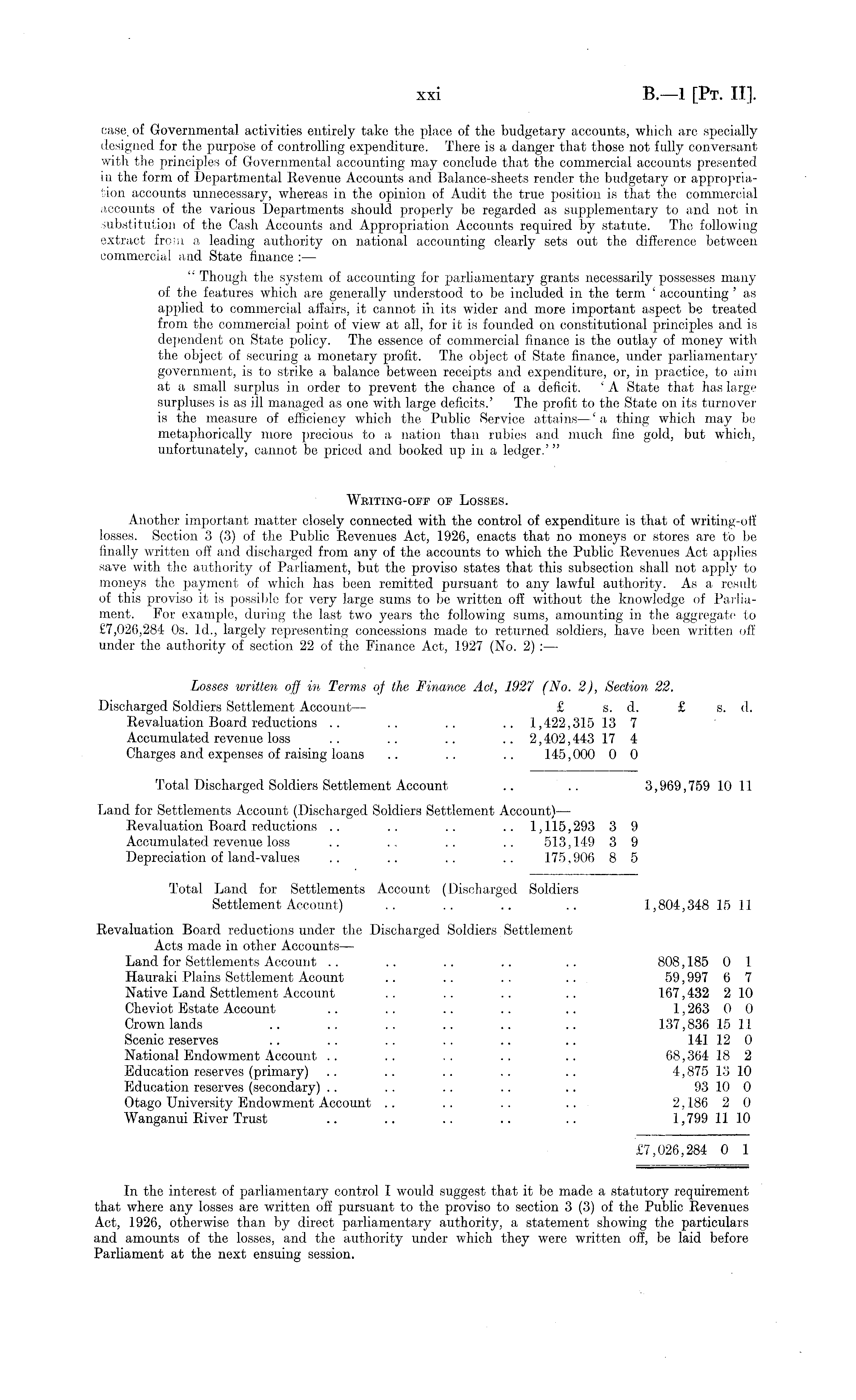 case, of Governmental activities entirely take the place of the budgetary accounts, which are specially designed for the purpose of controlling expenditure. There is a danger that those not fully conversant with the principles of Governmental accounting may conclude that the commercial accounts presented i n the form of Departmental Revenue Accounts and Balance-sheets render the budgetary or appropriation accounts unnecessary, whereas in the opinion of Audit the true position is that the commercial accounts of the various Departments should properly be regarded as supplementary to and not in substitution of the Cash Accounts and Appropriation Accounts required by statute. The following extract from a leading authority on national accounting clearly sets out the difference between commercial and State finance " Though the system of accounting for parliamentary grants necessarily possesses many of the features which are generally understood to be included in the term ' accounting ' as applied to commercial alfairs, it cannot in its wider and more important aspect be treated from the commercial point of view at all, for it is founded on constitutional principles and is dependent on State policy. The essence of commercial finance is the outlay of money with the object of securing a monetary profit. The object of State finance, under parliamentary government, is to strike a balance between receipts and expenditure, or, in practice, to aim at a small surplus in order to prevent the chance of a deficit. ' A State that has large surpluses is as ill managed as one with large deficits.' The profit to the State on its turnover is the measure of efficiency which the Public Service attains —'a thing which may be metaphorically more precious to a nation than rubies and much fine gold, but which, unfortunately, cannot be priced and booked up in a ledger.'" Writing-off of Losses. Another important matter closely connected with the control of expenditure is that of writing-off losses. Section 3 (3) of the Public Revenues Act, .1926, enacts that no moneys or stores are to be finally written off and discharged from any of the accounts to which the Public Revenues Act applies save with the authority of Parliament, but the proviso states that this subsection shall not apply to moneys the payment of which has been remitted pursuant to any lawful authority. As a result of this proviso it is possible for very large sums to be written off without the knowledge of Parliament. For example, during the last two years the following sums, amounting in the aggregate to £7,026,284 os. Id., largely representing concessions made to returned soldiers, have been written off under the authority of section 22 of the Finance Act, 1927 (No. 2) :— Losses written off in Terms of the Finance Act, 1927 (No. 2), Section 22. Discharged Soldiers Settlement Account— £ s. d. £ s. d. Revaluation Board reductions .. .. . . 1,422,315 13 7 Accumulated revenue loss . . .. .. .. 2,402,443 17 4 Charges and expenses of raising loans .. .. .. 145,000 0 0 Total Discharged Soldiers Settlement Account .. .. 3,969,759 10 11 Land for Settlements Account (Discharged Soldiers Settlement Account) —■ Revaluation Board reductions .. .. .. .. 1,115,293 3 9 Accumulated revenue loss .. ~ .. .. 513,149 3 9 Depreciation of land-values .. .. .. .. 175,906 8 5 Total Land for Settlements Account (Discharged Soldiers Settlement Account) .. .. .. .. 1,804,348 15 11 Revaluation Board reductions under the Discharged Soldiers Settlement Acts made in other Accounts— Land for Settlements Account .. .. .. .. .. 808,185 0 1 Hauraki Plains Settlement Acount .. .. . . .. 59,997 6 7 Native Land Settlement Account .. .. .. .. 167,432 2 10 Cheviot Estate Account .. .. .. .. .. 1,263 0 0 Crown lands .. .. .. .. .. .. 137,836 15 11 Scenic reserves .. .. .. . . .. .. 141 12 0 National Endowment Account .. .. .. .. .. 68,364 18 2 Education reserves (primary) .. .. .. .. .. 4,875 13 10 Education reserves (secondary) .. .. .. .. .. 93 10 0 Otago University Endowment Account .. .. .. .. 2,186 2 0 Wanganui River Trust .. .. .. .. .. 1,799 11 10 £7,026,284 0 1 In the interest of parliamentary control I would suggest that it be made a statutory requirement that where any losses are written off pursuant to the proviso to section 3 (3) of the Public Revenues Act, 1926, otherwise than by direct parliamentary authority, a statement showing the particulars and amounts of the losses, and the authority under which they were written off, be laid before Parliament at the next ensuing session.