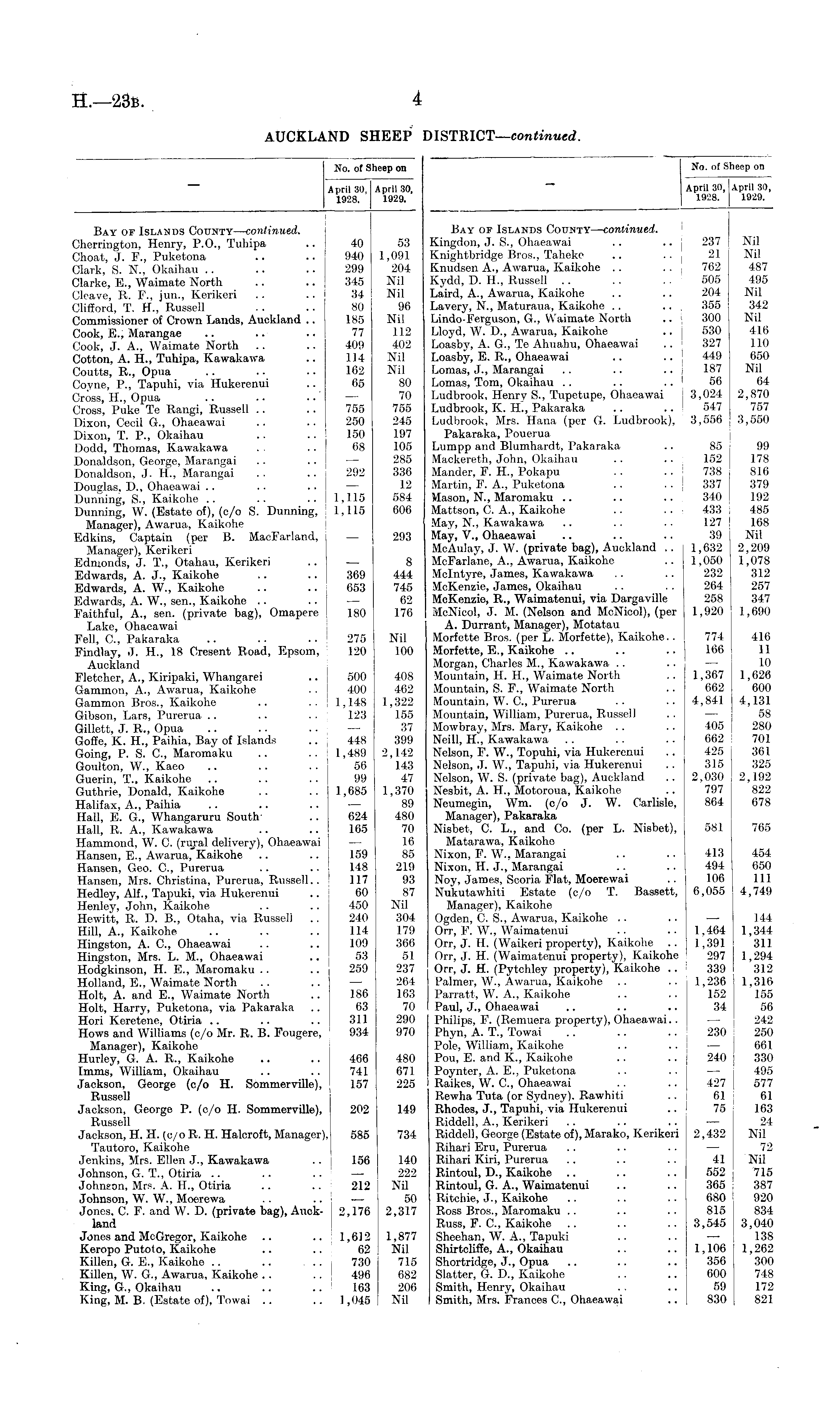 No. of Sheep on April 30, April 30, 1928. 1929. - . - - Bay of Islands County—continued. Kingdon, J. S., Ohaeawai .. .. I 237 Nil Knightbridge Bros., Taheke .. .. I 21 Nil Knudsen A., Awarua, Kaikohe .. .. 762 487 Kydd, D. H., Russell . . .. . . 505 495 Laird, A., Awarua, Kaikohe .. .. 204 Nil Lavery, N., Maturaua, Kaikohe .. .. 355 342 Lindo-Ferguson, G., Waimate North .. 300 Nil Lloyd, W. I)., Awarua, Kaikohe .. , 530 416 Loasbv, A. G., Te Ahuahu, Ohaeawai .. 327 110 Loasby, E. R., Ohaeawai .. .. 449 650 Lomas, J., Marangai .. .. .. 187 Nil Lomas, Tom, Okaihau .. .. .. 56 64 Ludbrook, Henry S., Tupetupe, Ohaeawai 3,024 2,870 Ludbrook, K. H., Pakaraka .. .. 547 757 Ludbrook, Mrs. Hana (per G. Ludbrook), 3,556 3,550 Pakaraka, Pouerua Lumpp and Blumhardt, Pakaraka .. 85 99 Mackereth, John, Okaihau .. .. 152 178 Mander, F. H., Pokapu . . .. 738 816 Martin, F. A., Puketona .. . . 337 379 Mason, N., Maromaku .. .. .. 340 192 Mattson, C. A., Kaikohe .. .. 433 485 May, N., Kawakawa .. .. .. 127 168 May, V., Ohaeawai .. .. .. 39 Nil McAulay, J. W. (private bag), Auckland .. 1,632 2,209 McFarlane, A., Awarua, Kaikohe .. 1,050 1,078 Mclntyre, James, Kawakawa .. .. 232 312 McKenzie, James, Okaihau .. . . 264 257 McKenzie, R., Waimatenui, via Dargaville 258 347 McNicol, J. M. (Nelson and McNicol), (per 1,920 1,690 A. Durrant, Manager), Motatau Morfette Bros, (per L. Morfette), Kaikohe.. 774 416 Morfette, E., Kaikohe .. .. .. 166 11 Morgan, Charles M., Kawakawa .. .. — 10 Mountain, H. H., Waimate North .. 1,367 1,626 Mountain, S. F., Waimate North .. 662 600 Mountain, W. C., Purerua .. .. 4,841 4,131 Mountain, William, Purerua, Russell .. — 58 Mowbray, Mrs. Mary, Kaikohe .. .. 405 280 Neill, H., Kawakawa .. .. .. 662 701 Nelson, F. W., Topuhi, via Hukerenui .. 425 361 Nelson, J. W., Tapuhi, via Hukerenui .. 315 325 Nelson, W. S. (private bag), Auckland .. 2,030 2,192 Nesbit, A. H., Motoroua, Kaikohe .. 797 | 822 Neumegin, Wm. (c/o J. W. Carlisle, 864 678 Manager), Pakaraka Nisbet, C. L., and Co. (per L. Nisbet), 581 765 Matarawa, Kaikohe Nixon, F. W., Marangai .. .. 413 454 Nixon, H. J., Marangai .. .. 494 j 650 Noy, James, Scoria Flat, Moerewai .. [ 106 \ 111 Nukutawhiti Estate (e/o T. Bassett, 6,055 4,749 Manager), Kaikohe Ogden, C. S., Awarua, Kaikohe .. .. — 144 Orr, F. W., Waimatenui .. •• 1,464 1,344 Orr, J. H. (Waikeri property), Kaikohe .. 1,391 311 Orr, J. H. (Waimatenui property), Kaikohe 297 1,294 Orr, J. H. (Pytchley property), Kaikohe .. I 339 312 Palmer, W., Awarua, Kaikohe .. .. 1,236 1,316 Parratt, W. A., Kaikohe .. .. 152 155 Paul, J., Ohaeawai .. .. .. 34 56 Philips, F. (Remuera property), Ohaeawai.. — 242 Phyn, A. T., Towai .. .. .. 230 250 Pole, William, Kaikohe .. .. — 661 Pou, E. and K., Kaikohe .. .. 240 330 Poynter, A. E., Puketona .. .. ■— 495 i Raikes, W. C., Ohaeawai .. .. 427 577 Rewha Tuta (or Sydney), Rawhiti .. 61 61 Rhodes, J., Tapuhi, via Hukerenui .. 75 163 Riddell, A., Kerikeri .. .. .. ■— 24 Riddell, George (Estate of), Marako, Kerikeri 2,432 Nil Rihari Eru, Purerua .. .. .. — 72 Rihari Kiri, Purerua .. .. . . 41 Nil Rintoul, D., Kaikohe .. .. .. 552 '715 Rintoul, G. A., Waimatenui .. .. 365 387 Ritchie, J., Kaikohe .. .. .. 680 920 Ross Bros., Maromaku .. .. . . 815 834 Russ, F. C., Kaikohe .. .. .. 3,545 3,040 Sheehan, W. A., Tapuki .. .. — 138 Shirtcliffe, A., Okaihau .. .. 1,106 1,262 Shortridge, J., Opua .. .. .. 356 300 Slatter, G. D., Kaikohe .. 600 748 Smith, Henry, Okaihau . . .. 59 172 Smith, Mrs. Frances C., Ohaeawai .. 830 821