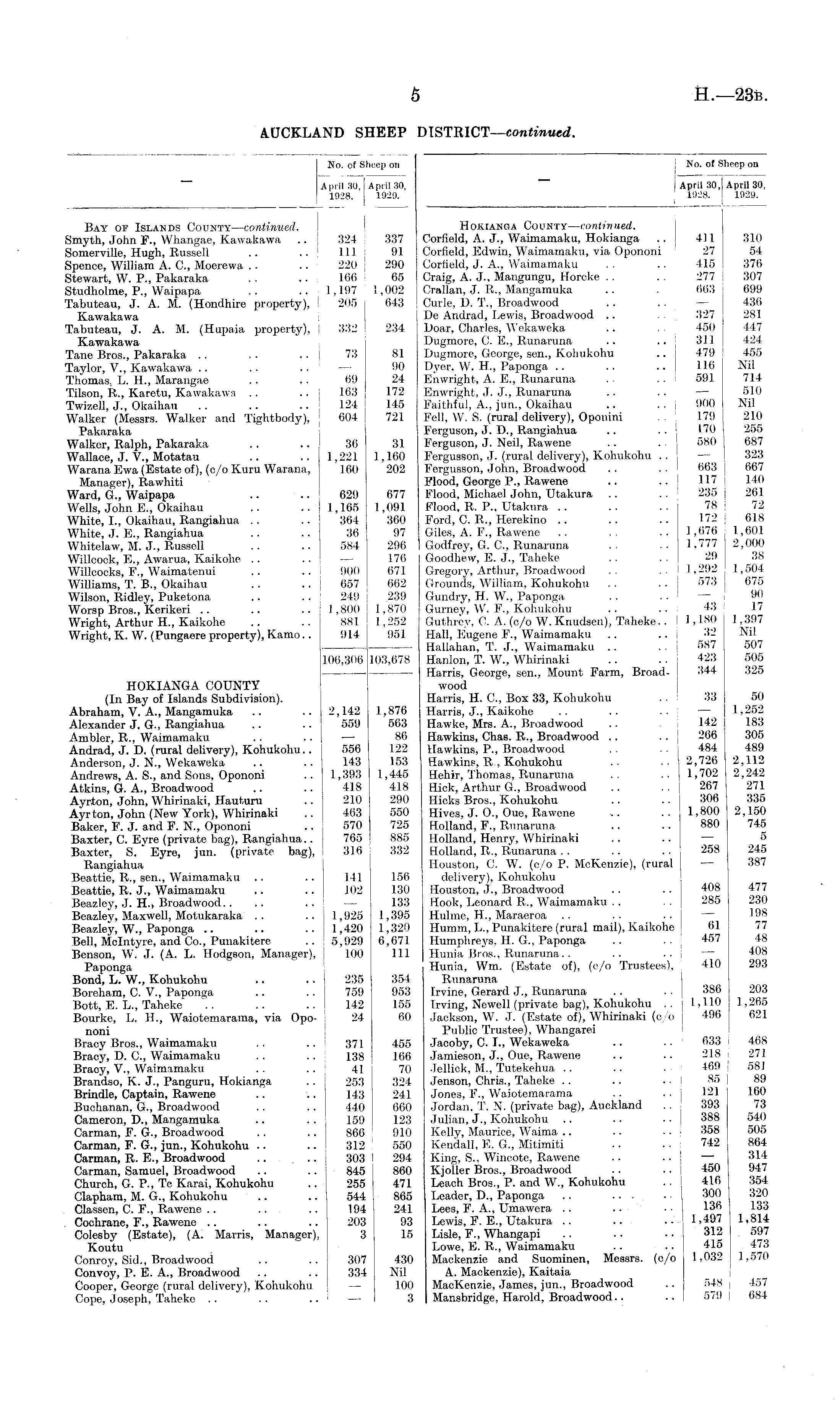 | No. of Sheep on j April 30, April 30, 1928. 1929. | HoiaANGA County—continued. Corfield, A. J., Waimamaku, Hokianga .. 411 310 Corfield, Edwin, Waimamaku, via Opononi 27 54 Corfield, J. A., Waimamaku . . .. 415 376 Craig, A. J., Mangungu, Horeke .. .. 277 307 Crallan, J. R., Mangamuka .. . 663 699 Curie, 1). T., Broadwood .. .. — 436 De Andrad, Lewis, Broadwood .. 327 281 Doar, Charles, Wekaweka .. . 450 447 Dugmore, C. E., Runaruna .. .. 311 424 Dugmore, George, sen., Kohukohu .. 479 455 Dyer, W. H., Paponga .. .. .. 116 Nil Enwright, A. E., Runaruna . . .. 591 714 Enwright, J. J., Runaruna .. .. — 510 Faithful, A., jun., Okaihau .. .. [ 900 Ml Fell, W. S. (rural delivery), Oponini . . 179 j 210 Ferguson, J. D., Rangiahua .. .. 170 | 255 Ferguson, J. Neil, Rawene .. . . 580 i 687 Fergusson, J. (rural delivery), Kohukohu .. — I 323 Fergusson, John, Broadwood .. . . 663 j 667 Flood, George P., Rawene .. .. 117 140 Flood, Michael John, Utakura .. .. 235 261 Flood, R. P., Utakura .. .. . • 78 72 Ford, C. R., Herekino .. .. .. 172 j 618 Giles, A. F., Rawene .. .. .. 1,676 j 1,601 Godfrey, G. C., Runaruna .. .. 1,777 2,000 Goodhew, E. J., Taheke .. . . 29 38 Gregory, Arthur, Broadwood . . . . 1,292 1,504 Grounds, William, Kohukohu . . . . 573 675 Gundry, H. W., Paponga .. .. — 90 Gurney, W. F., Kohukohu .. .. 43 17 Guthrev, C. A. (c/o W. Knudsen), Taheke.. 1,180 1,397 Hall, Eugene F., Waimamaku .. .. 32 Ml Hallahan, T. J., Waimamaku .. . . 587 507 Hanlon, T. W., Whirinaki .. .. j 423 505 Harris, George, sen., Mount Farm, Broad- 344 325 wood Harris, H. C., Box 33, Kohukohu . ■ 33 50 Harris, J., Kaikohe .. .. .. j — 1,252 Hawke, Mrs. A., Broadwood .. 142 183 Hawkins, Chas. R., Broadwood .. .. 266 305 Hawkins, P., Broadwood .. 484 489 Hawkins, R, Kohukohu .. •• 2,726 2,112 Hehir, Thomas, Runaruna .. ■■ 1,702 2,242 Hick, Arthur G., Broadwood .. .. 267 271 Hicks Bros., Kohukohu .. .. I 306 335 Hives, J. 0., Oue, Rawene . .. 1,800 2,150 Holland, F., Runaruna .. .. ! 880 745 Holland, Henry, Whirinaki .. .. — 5 Holland, R., Runaruna .. .. .. 258 245 Houston, C. W. (c/o P. McKenzie), (rural j — 387 delivery), Kohukohu Houston, J., Broadwood .. .. 108 477 Hook, Leonard R., Waimamaku . . 285 230 Hulme, H., Maraeroa .. . . .. — 198 Humm, L., Punakitere (rural mail), Kaikohe 61 77 Humphreys, H. G., Paponga .. . ■ 457 48 Hunia Bros., Runaruna.. .. .. — 408 Hunia, Wm. (Estate of), (c/o Trustees), 410 293 Runaruna j Irvine, Gerard J., Runaruna .. .. 386 203 Irving, Newell (private bag), Kohukohu .. 1,110 1,265 Jackson, W. J. (Estate of), Whirinaki (e/o | 496 621 Public Trustee), Whangarei Jacoby, C. I., Wekaweka .. .. 633 . 468 Jamieson, J., Oue, Rawene .. .. j 218 i 271 Jellick, M., Tutekehua .. .. ■ ! 469 ! 581 Jenson, Chris., Taheke .. .. .. j 85 I 89 Jones, F., Waiotemarama .. .. j 121 160 Jordan, T. N. (private bag), Auckland .. 393 73 Julian, J., Kohukohu .. .. ■ • 388 540 Kelly, Maurice, Waima .. .. . • 358 505 Kendall, E. G., Mitimiti .. .. 742 864 King, S., Wincote, Rawene .. .. — 314 Kjoller Bros., Broadwood .. .. 450 i 947 Leach Bros., P. and W., Kohukohu .. 416 354 Leader, D., Paponga .. ... . . 300 320 Lees, F. A., Umawera .. . ■ • ■ 136 133 Lewis, F. E., Utakura .. .. •• 1,497 1,814 Lisle, F., Whangapi .. . • • • 312 597 Lowe, E. R., Waimamaku .. .. 415 473 Mackenzie and Suominen, Messrs. (c/o 1,032 1,570 A. Mackenzie), Kaitaia MacKenzie, James, jun., Broadwood .. 548 ; 457 Mansbridge, Harold, Broadwood.. .. 579 684