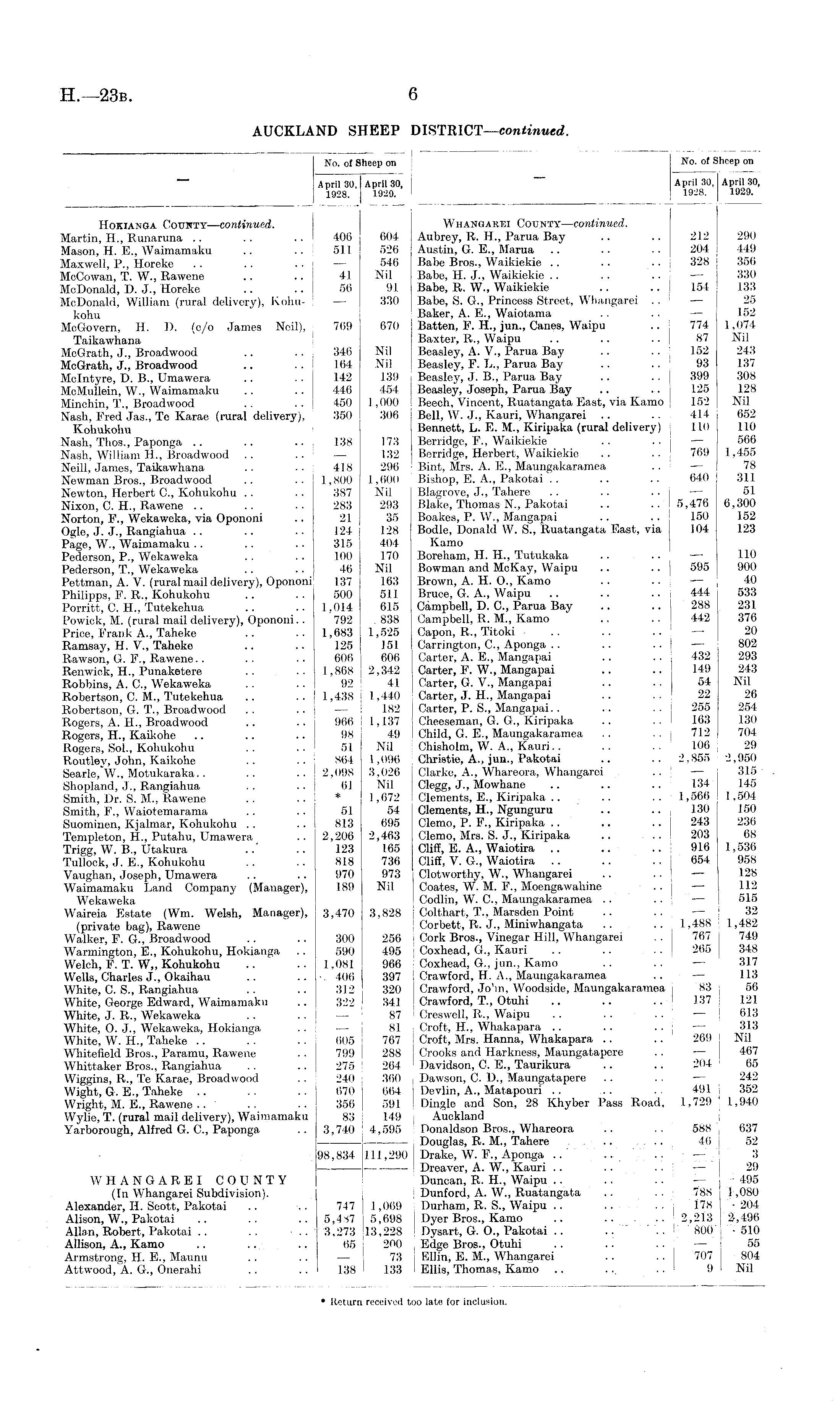 No. of Sheep on No. of Sheep on — April 30,1 April 30, | ~~ April 30, April 30, 1928. 1929. 1 1928. 1929. Hokianga County—continued. Whangarei County—continued. Martin, H., Runaruna .. .. .. 406 604 Aubrey, R. H., Parua Bay .. .. 212 290 Mason, H. E., Waimamaku .. .. 511 526 Austin, G. E., Marua .. .. .. 204 449 Maxwell, P., Horeke .. .. .. — 546 Babe Bros., Waikiekie .. . . .. 328 356 McCowan, T. W., Rawene .. .. 41 Nil Babe, H. J., Waikiekie .. .. .. — 330 McDonald, D. J., Horeke .. .. 56 91 Babe, R. W., Waikiekie .. .. 154 133 McDonald, William (rural delivery), Kohu- — 330 Babe, S. G., Princess Street, Whangarei . . — 25 kohu Baker, A. E., Waiotama . . .. — 152 MeGovern, H. D. (c/o James Neil), 769 670 Batten, F. H., jun., Canes, Waipu .. 774 1,074 Taikawhana Baxter, R., Waipu .. .. .. 87 Nil McGrath, J., Broadwood .. .. 346 Nil Beasley, A. V., Parua Bay .. .. 152 243 McGrath, J., Broad wood .. .. 164 Nil Beasley, F. L., Parua Bay .. .. 93 137 Mclntyre, D. B., Umawera .. . . 142 139 Beasley, J. B., Parua Bay .. . . 399 308 McMullein, W., Waimamaku .. .. 446 454 Beasley, Joseph, Parua Bay .. .. 125 128 Minchin, T., Broadwood .. .. 450 1,000 Beech, Vincent, Ruatangata East, via Kamo 152 Nil Nash, Fred Jas., Te Karae (rural delivery), 350 306 Bell, W. J., Kauri, Whangarei .. .. 414 652 Kohukohu Bennett, L. E. M., Kiripaka (rural delivery) 110 110 Nash, Thos., Paponga .. .. .. 138 173 Berridge, F., Waikiekie .. .. — 566 Nash, William H., Broadwood .. .. j — 132 Berridge, Herbert, Waikiekie .. .. 769 1,455 Neill, James, Taikawhana .. .. I 418 296 Bint, Mrs. A. E., Maungakaramea .. — 78 Newman Bros., Broadwood .. .. 1,800 1,600 Bishop, E. A., Pakotai .. .. .. 640 311 Newton, Herbert C., Kohukohu .. .. 387 Nil Blagrove, J., Tahere .. .. .. —• 51 Nixon, C. H., Rawene .. .. 283 293 Blake, Thomas N., Pakotai .. .. 5,476 6,300 Norton, F., Wekaweka, via Opononi .. 21 35 Boakes, P. W., Mangapai .. .. 150 152 Ogle, J. J., Rangiahua .. .. .. 124 128 Bodle, Donald W. S., Ruatangata East, via ; 104 123 Page, W., Waimamaku .. .. . • 315 404 Kamo Pederson, P., Wekaweka .. .. 100 170 Boreham, H. H., Tutukaka .. .. — 110 Pederson, T., Wekaweka .. .. 46 Nil Bowman and McKay, Waipu .. .. 1 595 900 Pettman, A. V. (rural mail delivery), Opononi 137 163 Brown, A. H. O., Kamo .. .. — , 40 Philipps, F. R., Kohukohu .. .. 500 511 Bruce, G. A., Waipu .. .. ... 444 533 Porritt, C. H., Tutekehua .. .. 1,014 615 Campbell, D. C., Parua Bay .. .. 288 231 Powick, M. (rural mail delivery), Opononi.. 792 838 Campbell, R. M., Kamo .. . . 442 376 Price, Frank A., Taheke .. 1,683 1,525 Capon, R., Titoki .. .. .. 1 — | 20 Ramsay, H. V., Taheke .. .. 125 151 Carrington, C., Aponga .. .. .. j — 802 Rawson, G. F., Rawene.. . ■ . ■ 606 ' 606 Carter, A. E., Mangapai .. .. 432 293 Renwick, H., Punaketere .. .. 1,868 j 2,342 Carter, F. W., Mangapai .. 149 243 Robbins, A. C., Wekaweka .. .. 92 ' 41 Carter, G. V., Mangapai .. . . 54 Nil Robertson, C. M., Tutekehua .. .. 1,438 1,440 Carter, J. H., Mangapai .. .. 22 26 Robertson, G. T., Broadwood .. .. — I 182 Carter, P. S., Mangapai. . .. .. ! 255 254 Rogers, A. H., Broadwood .. .. 966 | 1,137 Cheeseman, G. G., Kiripaka .. .. I 163 130 Rogers, H., Kaikohe .. .. .. 98 49 Child, G. E., Maungakaramea .. .. i 712 704 Rogers, Sol., Kohukohu .. .. 51 Nil Chisholm, W. A., Kauri.. .. .. 106 j 29 Routlev, John, Kaikohe .. .. 864 1,096 Christie, A., jun., Pakotai .. ■ • 2,855 | 2,950 Searle, W., Motukaraka.. .. .. 2,098 3,026 Clarke, A., Whareora, Whangarei .. — 315 Shopland, J., Rangiahua .. .. 61 Nil Clegg, J., Mowhane .. .. .. 134 145 Smith, Dr. S. M., Rawene .. .. * 1,672 Clements, E., Kiripaka .. .. .. 1,566 1,504 Smith, F., Waiotemarama .. .. 51 54 Clements, H., Ngunguru .. .. 130 150 Suominen, Kjalmar, Kohukohu .. .. 813 695 Clemo, P. F., Kiripaka .. .. .. j 243 236 Templeton, H., Putahu, Umawera .. 2,206 2,463 Clemo, Mrs. S. J., Kiripaka .. .. 203 68 Trigg, W. B., Utakura ..' .. 123 165 Cliff, E. A., Waiotira .. .. .. 916 1,536 Tullock, J. E., Kohukohu .. .. 818 736 Cliff, V. G., Waiotira .. .. .. 654 958 Vaughan, Joseph, Umawera .. .. 970 973 Clotworthy, W., Whangarei .. .. j — 128 Waimamaku Land Company (Manager), 189 Nil Coates, W. M. F., Moengawahine .. I — 112 Wekaweka Codlin, W. C., Maungakaramea .. .. — 515 Waireia Estate (Wm. Welsh, Manager), 3,470 3,828 Colthart, T., Marsden Point .. .. j — 32 (private bag), Rawene Corbett, R. J., Miniwhangata . . . . 1,488 1,482 Walker, F. G., Broadwood .. .. 300 256 Cork Bros., Vinegar Hill, Whangarei . . i 767 749 Warmington, E., Kohukohu, Hokianga .. 590 495 Coxhead, G., Kauri .. .. . . 265 348 Welch, F. T. W,, Kohukohu .. .. 1,081 966 Coxhead, G., jun., Kamo .. .. — 317 Wells, Charles J., Okaihau .. .. ■ 406 397 Crawford, H. A., Maungakaramea .. — 113 White, C. S., Rangiahua .. .. 312 320 Crawford, Jo'm, Woodside, Maungakaramea 83 56 White, George Edward, Waimamaku .. 322 341 Crawford, T., Otuhi .. .. .. 137 121 White, J. R., Wekaweka .. .. — 87 Creswell, R., Waipu .. . . .. j — 613 White, 0. J., Wekaweka, Hokianga .. — 81 Croft, H., Whakapara .. .. .. | ■— 313 White, W. H., Taheke .. .. . . 605 767 Croft, Mrs. Hanna, Whakapara .. .. 269 j Nil Whitefield Bros., Paramu, Rawene .. 799 288 Crooks and Harkness, Maungatapcre . . — | 467 Whittaker Bros., Rangiahua .. .. 275 264 Davidson, C. E., Taurikura .. .. 204 1 65 Wiggins, R., Te Karae, Broadwood .. 240 360 Dawson, C. D., Maungatapere .. .. — j 242 Wight, G. E., Taheke .. .. .. 670 664 Devlin, A., Matapouri .. ... .. 491 352 Wright, M. E., Rawene .. .. .. 356 591 Dingle and Son, 28 Khyber Pass Road, 1,729 1,940 Wylie, T. (rural mail delivery), Waimamaku 83 149 Auckland Yarborough, Alfred G. C., Paponga .. 3,740 4,595 Donaldson Bros., Whareora .. .. 588 637 Douglas, R. M., Tahere .. . . 46 52 98,834 111,290 Drake, W. P., Aponga .. • ■ . • ■ — 3 Dreaver, A. W., Kauri .. .. .. — 29 WHANGAREI COUNTY Duncan, 