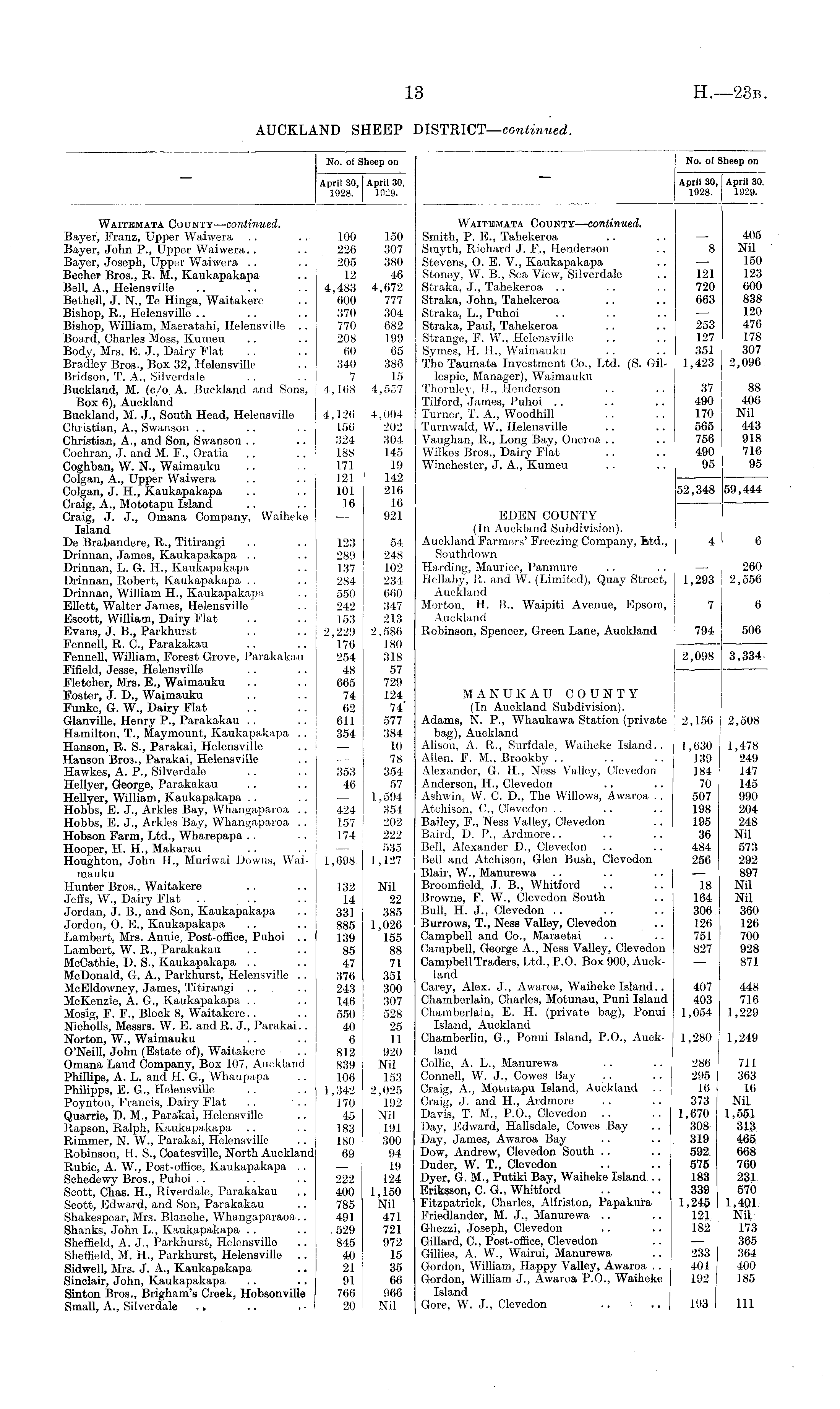 No. of Sheep on April 30, April 30, 1928. 1929. Waitemata County—continued. Smith, P. E., Tahekeroa .. .. — 405 Smyth, Richard J. F., Henderson .. 8 Nil Stevens, 0. E. V., Kaukapakapa .. — 150 Stoney, W. B., Sea View, Silverdale .. 121 123 Straka, J., Tahekeroa .. .. . . 720 600 Straka, John, Tahekeroa .. .. 663 838 Straka, L., Puhoi .. .. .. — 120 Straka, Paul, Tahekeroa .. .. 253 476 Strange, P. W„ Helensville .. .. 127 178 Symes, H. H., Waimauku .. .. 351 307 The Taumata Investment Co., Ltd. (S. Gil- 1,423 2,096 lespie, Manager), Waimauku Thornley, H., Henderson .. .. 37 88 Tilford, James, Puhoi .. .. . . 490 406 Turner, T. A., Woodhill .. 170 Nil Turnwald, W., Helensville .. .. 565 443 Vaughan, 11., Long Bay, Oneroa .. .. 756 918 Wilkes Bros., Dairy Plat . . .. 490 716 Winchester, J. A., Kumeu .. .. 95 95 52,348 59,444 EDEN COUNTY (In Auckland Subdivision). Auckland Farmers' Freezing Company, Ltd., 4 6 Southdown Harding, Maurice, Panmure .. .. — 260 Hellaby, It. and W. (Limited), Quay Street, 1,293 2,556 Auckland Morton, H. B., Waipiti Avenue, Epsom, 7 6 Auckland Robinson, Spencer, Green Lane, Auckland 794 506 2,098 3,334 MANUKAU COUNTY (In Auckland Subdivision). Adams, N. P., Whaukawa Station (private 2,156 2,508 bag), Auckland Alison, A. R., Surf dale, Waiheke Island., j 1,630 1,478 Allen, F. M„ Brookby .. .. .. 139 249 Alexander, G. H„ Ness Valley, Clevedon 184 147 Anderson, IL, Clevedon .. .. 70 145 Ashwin, W. C. D., The Willows, Awaroa .. 507 990 Atchison, C., Clevedon .. .. .. 198 204 Bailey, F., Ness Valley, Clevedon .. 195 248 Baird, D. P., Ardmore.. .. .. j 36 Nil Bell, Alexander D., Clevedon .. .. 484 573 Bell and Atchison, Glen Bush, Clevedon 256 292 Blair, W., Manurewa .. .. .. — 897 Broomfield, J. B., Whitford .. .. I 18 Nil Browne, F. W., Clevedon South .. 164 Nil Bull, H. J., Clevedon .. .. .. 306 360 Burrows, T., Ness Valley, Clevedon .. 126 126 Campbell and Co., Maraetai .. .. 751 700 Campbell, George A., Ness Valley, Clevedon 827 928 Campbell Traders, Ltd., P.O. Box 900, Auck- — 871 land Carey, Alex. J., Awaroa, Waiheke Island.. 407 448 Chamberlain, Charles, Motunau, Puni Island 403 716 Chamberlain, E. H. (private bag), Ponui 1,054 1,229 Island, Auckland Chamberlin, G., Ponui Island, P.O., Auck- 1,280 1,249 land Collie, A. L., Manurewa .. .. 286 711 Connell, W. J., Cowes Bay .. .. 295 363 Craig, A., Motutapu Island, Auckland .. j 16 16 Craig, J. and H., Ardmore .. .. 373 Nil Davis, T. M., P.O., Clevedon .. .. 1,670 1,551 Day, Edward, Hallsdale, Cowes Bay .. 308 313 Day, James, Awaroa Bay .. .. 319 465 Dow, Andrew, Clevedon South .. .. 592 668 Duder, W. T., Clevedon .. .. 575 760 Dyer, G. M., Putiki Bay, Waiheke Island .. 183 231 Eriksson, C. G., Whitford .. .. 339 570 Fitzpatrick, Charles, Alfriston, Papakura 1,245 1,401 Friedlander, M. J., Manurewa .. .. 121 Nil Ghezzi, Joseph, Clevedon .. .. 182 173 Gillard, C., Post-office, Clevedon .. — 365 Gillies, A. W., Wairui, Manurewa .. 233 364 Gordon, William, Happy Valley, Awaroa .. 401 400 Gordon, William J., Awaroa P.O., Waiheke 192 185 Island Gore, W. J., Clevedon .. .. 193 111
