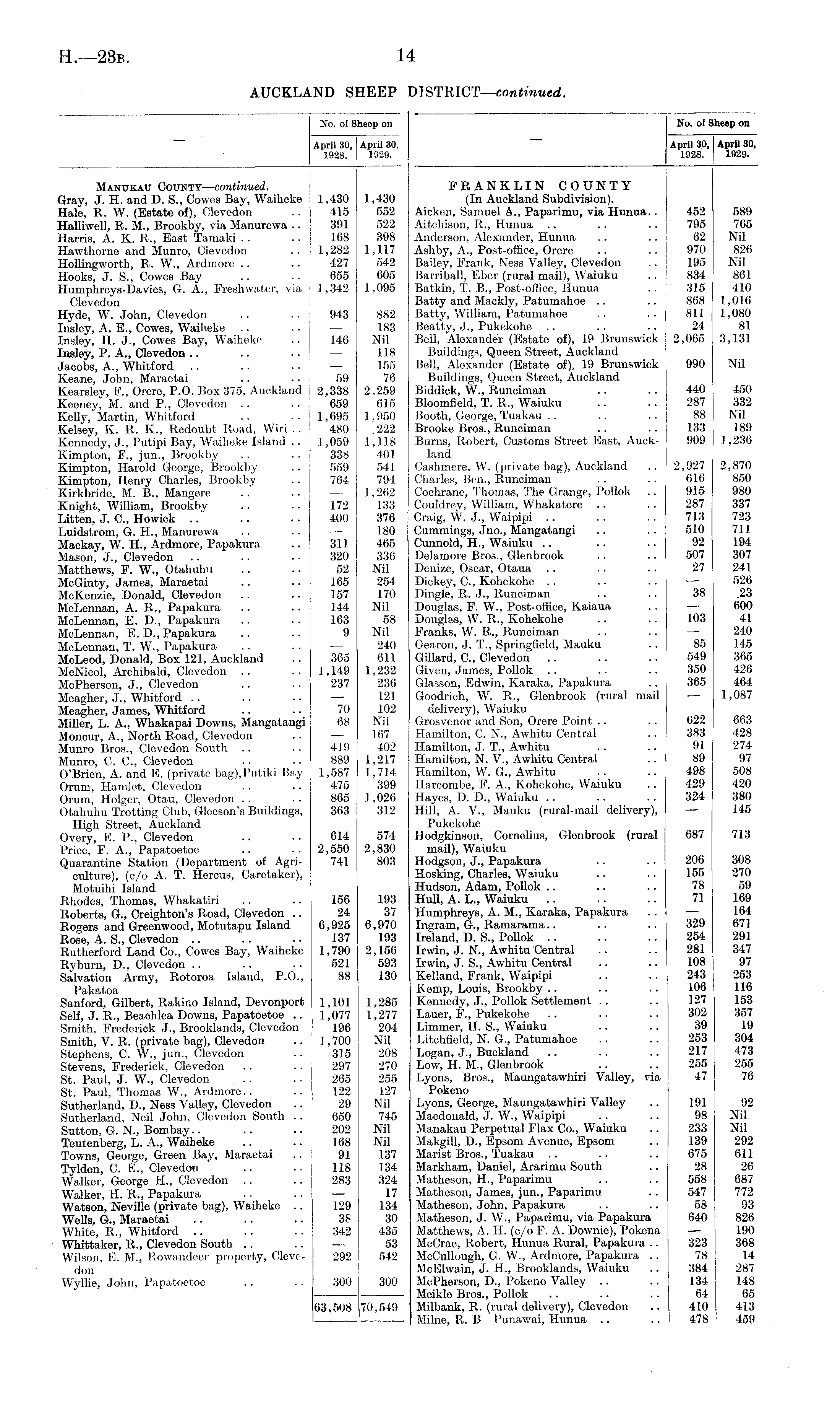 No. of Sheep on April 30, April 30, 1928. 1929. MANUK4.tr County—continued. Gray, J. H. and D. S., Cowes Bay, Waiheke 1,430 1,430 Hale, R. W. (Estate of), Clevedon .. 415 552 Halliwell, R. M., Brookby, via Manurewa .. 391 522 Harris, A. K. R., Bast Tamaki .. . • 168 398 Hawthorne and Munro, Clevedon .. 1,282 1,117 Hollingworth, R. W., Ardmore .. .. 427 542 Hooks, J. S., Cowes Bay .. • • 655 605 Iiumphreys-1 )avies, G. A., Freshwater, via 1,342 1,095 Clevedon Hyde, W. John, Clevedon .. .. 943 882 Insley, A. E., Cowes, Waiheke .. .. — 183 Insley, H. J., Cowes Bay, Waiheke .. 146 Nil Insley, P. A., Clevedon .. . . .. — 118 Jacobs, A., Whitford .. .. .. — 155 Keane, John, Maraetai .. .. 59 76 Kearsley, E., Orere, P.O. Box 375, Auckland j 2,338 2,259 Keeney, M. and P., Clevedon .. .. j 659 615 Kelly, Martin, Whitford .. • • ! 1,695 1,950 Kelsey, K. R. K., Redoubt Road, Wiri .. ! 480 .222 Kennedy, J., Putipi Bay, Waiheke Island .. : 1,059 1,118 Kimpton, E., jun., Brookby .. .. 338 401 Kimpton, Harold George, Brookby .. 559 541 Kimpton, Henry Charles, Brookby .. 764 794 Kirkbride, M. B., Mangere .. .. — 1,262 Knight, William, Brookby .. .. 172 133 Litten, J. C., Howick .. .. .. 400 376 Luidstrom, G. H., Manurewa .. .. — 180 Mackay, W. H., Ardmore, Papakura .. 311 465 Mason, J., Clevedon .. .. .. 320 336 Matthews, E. W., Otahuhu .. .. 52 Nil McGinty, James, Maraetai .. .. 165 254 McKenzie, Donald, Clevedon .. .. 157 170 McLennan, A. R., Papakura .. .. 144 Nil McLennan, E. D., Papakura .. .. 163 58 McLennan, E. D., Papakura .. . ■ 9 Nil McLennan, T. W., Papakura .. .. — 240 McLeod, Donald, Box 121, Auckland .. 365 611 McNicol, Archibald, Clevedon .. .. 1,149 1,232 McPherson, J., Clevedon .. .. 237 236 Meagher, J., Whitford .. .. .. ■— 121 Meagher, James, Whitford .. .. 70 102 Miller, L. A., Whakapai Downs, Mangatangi 68 Nil Moncur, A., North Road, Clevedon .. — 167 Munro Bros., Clevedon South .. .. 419 402 Munro, C. C., Clevedon .. 889 1,217 O'Brien, A. and E. (private bag),Putiki Bay 1,587 1,714 Orum, Hamlet, Clevedon .. .. 475 399 Orum, Holger, Otau, Clevedon .. .. 865 1,026 Otahuhu Trotting Club, Gleeson's Buildings, 363 312 High Street, Auckland Overy, E. P., Clevedon .. .. 614 574 Price, F. A., Papatoetoe .. •• 2,550 2,830 Quarantine Station (Department of Agri- 741 803 culture), (c/o A. T. Hercus, Caretaker), Motuihi Island Rhodes, Thomas, Whakatiri .. .. 156 193 Roberts, G., Creighton's Road, Clevedon .. 24 37 Rogers and Greenwood, Motutapu Island 6,925 6,970 Rose, A. S., Clevedon .. .. .. 137 193 Rutherford Land Co., Cowes Bay, Waiheke 1,790 2,156 Ryburn, D., Clevedon .. .. .. 521 593 Salvation Army, Rotoroa Island, P.O., 88 130 Pakatoa Sanford, Gilbert, Rakino Island, Devonport 1,101 1,285 Self, J. R., Beaohlea Downs, Papatoetoe .. 1,077 1,277 Smith, Frederick J., Brooklands, Clevedon 196 204 Smith, V. R. (private bag), Clevedon .. 1,700 Nil Stephens, C. W., jun., Clevedon .. 315 208 Stevens, Frederick, Clevedon .. .. 297 270 St. Paul, J. W., Clevedon _ .. .. 265 255 St. Paul, Thomas W., Ardmore.. .. 122 127 Sutherland, D., Ness Valley, Clevedon .. 29 Nil Sutherland, Neil John, Clevedon South .. 650 745 Sutton, G. N., Bombay.. .. .. 202 Nil Teutenberg, L. A., Waiheke .. .. 168 Nil Towns, George, Green Bay, Maraetai . . 91 137 Tylden, C. E., Clevedon .. .. 118 134 Walker, George H., Clevedon .. .. 283 324 Walker, H. R., Papakura .. .. — 17 Watson, Neville (private bag), Waiheke .. 129 134 Wells, G., Maraetai .. .. .. 38 30 White, R., Whitford .. .. .. 342 435 Whittaker, R., Clevedon South .. .. ■— 53 Wilson, E. M., Rowandeer property, Cleve- 292 542 don Wyllie, John, Papatoetoe .. .. 300 300 63,508 70,549