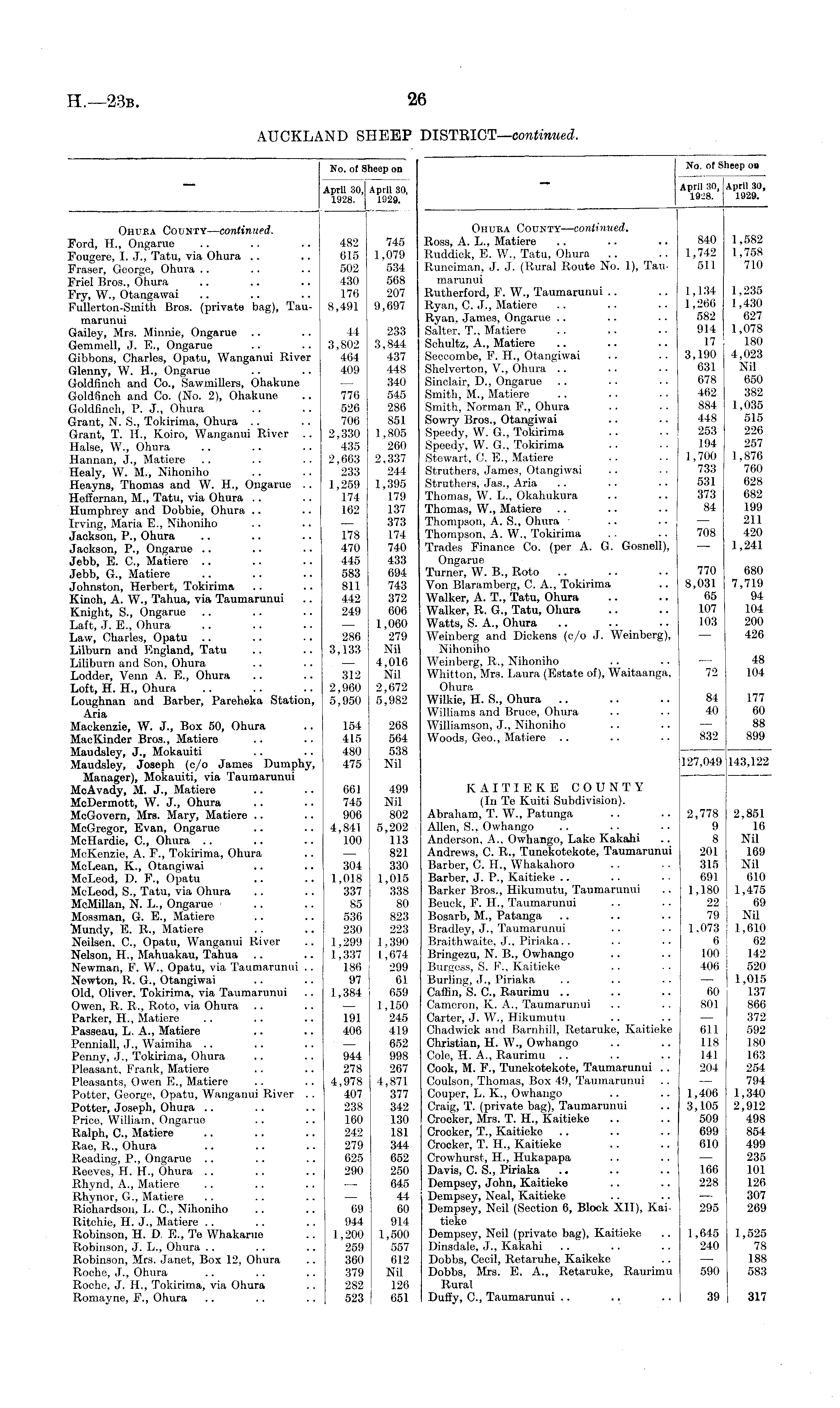 No. of Sheep on April 30, April 30, 1928. 1929. Ohura County—continued. Ford, H., Ongarue .. .. .. 482 745 Fougere, I. J., Tatu, via Ohura .. .. 615 1,079 Fraaer, George, Ohura .. .. .. 502 534 Friel Bros., Ohura .. .. .. 430 568 Fry, W., Otangawai .. .. .. 176 207 Fullerton-Smith Bros, (private bag), Tau- 8,491 9,697 marunui Gailey, Mrs. Minnie, Ongarue .. .. 44 233 Gemmell, J. E., Ongarue .. .. 3,802 3,844 Gibbons, Charles, Opatu, Wanganui River 464 437 Glenny, W. H., Ongarue .. .. 409 448 Goldfinch and Co., Sawmillers, Ohakune : — 340 Goldfinch and Co. (No. 2), Ohakune .. 776 545 Goldfinch, P. J., Ohura .. .. 526 286 Grant, N. S., Tokirima, Ohura .. .. 706 851 Grant, T. H., Koiro, Wanganui River .. 2,330 1,805 Halse, W., Ohura .. .. .. 435 260 Hannan, J., Matiere .. .. .. 2,663 2,337 Healy, W. M., Nihoniho .. .. 233 244 Heayns, Thomas and W. H., Ongarue .. 1,269 1,395 Heffernan, M., Tatu, via Ohura .. .. 174 179 Humphrey and Dobbie, Ohura .. .. 162 137 Irving, Maria E., Nihoniho .. .. ■— 373 Jackson, P., Ohura .. .. .. 178 174 Jackson, P., Ongarue .. .. .. 470 740 Jebb, E. C., Matiere .. .. .. 445 433 Jebb, G., Matiere .. .. .. 583 694 Johnston, Herbert, Tokirima .. .. 811 743 Kinch, A. W., Tahua, via Taumarunui .. 442 372 Knight, S., Ongarue .. .. .. 249 606 Laft, J. E., Ohura .. .. .. — 1,060 Law, Charles, Opatu .. .. .. 286 279 Lilburn and England, Tatu .. .. 3,133 Nil Liliburn and Son, Ohura .. .. — 4,016 Lodder, Venn A. E., Ohura .. .. 312 Nil Loft, H. H., Ohura .. .. .. 2,960 2,672 Loughnan and Barber, Pareheka Station, 5,950 5,982 Mackenzie, W. J., Box 50, Ohura .. 154 268 MacKinder Bros., Matiere .. .. 415 564 Maudsley, J., Mokauiti .. .. 480 538 Maudsley, Joseph (c/o James Dumphy, 475 Nil Manager), Mokauiti, via Taumarunui McAvady, M. J., Matiere .. .. 661 499 McDermott, W. J., Ohura .. .. 745 Nil McGovern, Mrs. Mary, Matiere .. .. 906 802 McGregor, Evan, Ongarue .. .. 4,841 5,202 McHardie, C., Ohura .. .. .. 100 113 McKenzie, A. F., Tokirima, Ohura .. •— 821 McLean, K., Otangiwai .. .. 304 330 McLeod, D. F„ Opatu .. .. 1,018 1,015 McLeod, S., Tatu, via Ohura .. .. 337 338 McMillan, N. L., Ongarue • .. .. 85 80 Mossman, G. E., Matiere .. .. 536 823 Mundy, E. R., Matiere .. .. 230 223 Neilsen. C., Opatu, Wanganui River .. 1,299 1,390 Nelson, H., Mahuakau, Tahua .. .. 1,337 1,674 Newman, F. W., Opatu, via Taumarunui .. 186 299 Newton, R. G., Otangiwai .. .. 97 61 Old, Oliver, Tokirima, via Taumarunui .. 1,384 659 Owen, R. R., Roto, via Ohura .. .. — 1,150 Parker, H., Matiere .. .. .. 191 245 Passeau, L. A., Matiere .. .. 406 419 Penniall, J., Waimiha .. .. .. — 652 Penny, J., Tokirima, Ohura .. .. 944 998 Pleasant, Frank, Matiere .. .. 278 267 Pleasants, Owen E., Matiere .. .. 4,978 4,871 Potter, George, Opatu, Wanganui River .. 407 377 Potter, Joseph, Ohura .. .. .. 238 342 Price, William, Ongarue .. .. 160 130 Ralph, C., Matiere .. .. .. 242 181 Rae, R„ Ohura .. .. .. 279 344 Reading, P., Ongarue .. .. .. 625 652 Reeves, H. H., Ohura .. .. .. 290 250 Rhynd, A., Matiere .. .. .. — 645 Rhynor, G., Matiere .. .. .. — 44 Richardson, L. C., Nihoniho .. .. 69 60 Ritchie, H. J., Matiere .. .. .. 944 914 Robinson, H. D, E., Te Whakarue .. 1,200 1,500 Robinson, J. L., Ohura .. .. .. 259 557 Robinson, Mrs. Janet, Box 12, Ohura .. 360 612 Roche, J., Ohura .. .. .. 379 Nil Roche, J. H., Tokirima, via Ohura .. 282 126 Romayne, F., Ohura .. .. .. 523 651