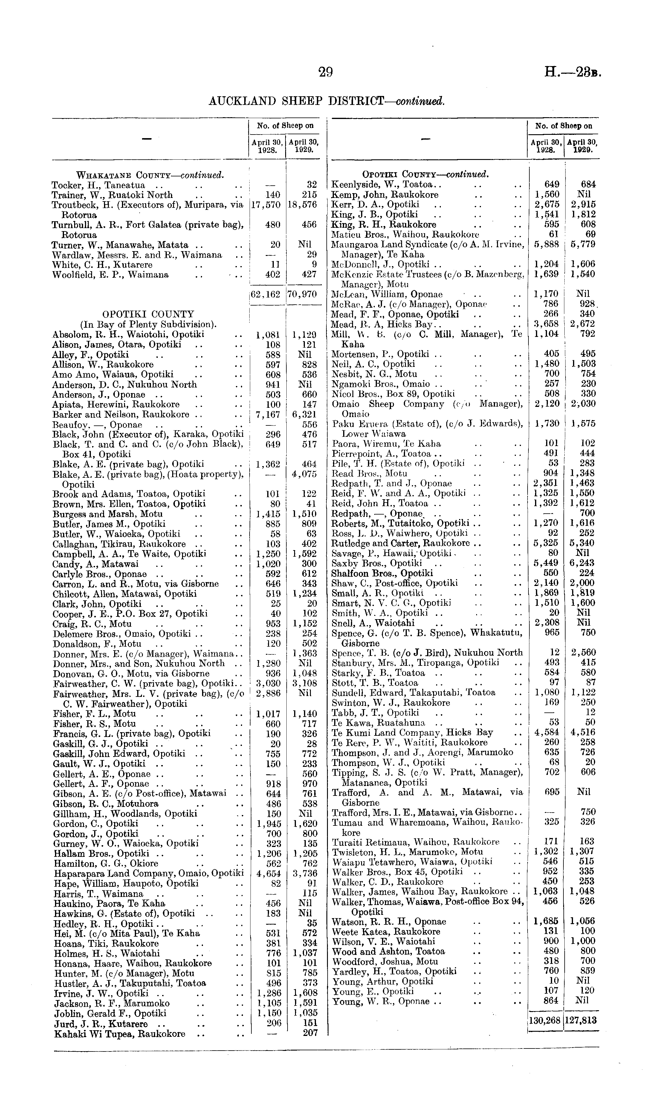 No. of Sheep on April 30, April 30, 1928. 1929. Opotiki County—continued. Keenlyside, W., Toatoa.. .. .. 649 684 Kemp, John, Raukokore .. .. 1,560 Nil Kerr, 1). A., Opotiki .. .. .. 2,675 2,915 King, J. B., Opotiki .. .. .. 1,541 1,812 King, R. H., Raukokore .. .. 595 608 Matieu Bros., Waihou, Raukokore .. 61 69 Maungaroa Land Syndicate (o/o A. M. Irvine, 5,888 5,779 Manager), Te Kaha McDonnell, J., Opotiki .. .. .. 1,204 1,606 McKenzie Estate Trustees (c/o B. Mazenberg, 1,639 1,540 Manager), Motu McLean, William, Oponae • .. • • 1,170 Nil McRae, A. J. (c/o Manager), Oponae .. 786 928. Mead, F. P., Oponae, Opotiki .. .. 266 340 Mead, R. A, Hicks Bay.. .. .. 3,658 2,672 Mill, W. B. (c/o C. Mill, Manager), Te 1,104 792 Kaha Mortensen, P., Opotiki . . .. .. 405 495 Neil, A. 0., Opotiki .. .. .. 1,480 1,503 Nesbit, N. G„ Motu . . .. .. 700 754 Ngamoki Bros., Omaio . . .. ' .. 257 230 Nicol Bros., Box 89, Opotiki .. .. 508 330 Omaio Sheep Company (c/o Manager), 2,120 2,030 Omaio Paku Eruera (Estate of), (c/o J. Edwards), 1,730 1,575 Lower Waiawa Paora, Wiremu, Te Kaha .. .. 101 102 Pierrepoint, A., Toatoa.. .. .. 491 444 Pile, T. H. (Estate of), Opotiki .. • .. 53 283 Read Bros., Motu .. .. ■ ■ 904 1,348 Redpath, T. and J., Oponae .. .. 2,351 1,463 Reid, E. W. and A. A., Opotiki .. .. 1,325 1,550 Reid, John H., Toatoa .. .. .. 1,392 1,612 Redpath, —, Oponae. .. .. .. — 700 Roberts, M., Tutaitoko, Opotiki .. .. 1,270 1,616 Ross, L. I J., Waiwhero, Opotiki .. .. 92 252 Rutledge and Carter, Raukokore .. .. 5,325 5,340 Savage, P., Hawaii," Opotiki - .. •• 80 Nil Saxby Bros., Opotiki .. .. .. 5,449 6,243 Shalfoon Bros., Opotiki .. .. 550 224 Shaw, C., Post-office, Opotiki .. .. 2,140 2,000 Small, A. R., Opotiki .. .. .. 1,869 1,819 Smart, N. V. C. G., Opotiki .. .. 1,510 1,600 Smith, W. A., Opotiki .. .. .. 20 Nil Snell, A., Waiotahi .. .. .. 2,308 Nil Spence, G. (c/o T. B. Spence), Whakatutu, 965 750 Gisborne Spence, T. B. (c/o J. Bird), Nukuhou North 12 2,560 Stanbury, Mrs. M., Tiropanga, Opotiki .. 493 415 Starky, F. B., Toatoa .. .. .. 584 580 Stott, T. B., Toatoa .. .. .. 97 87 Sundell, Edward, Takaputahi, Toatoa .. 1,080 1,122 Swinton, W. J., Raukokore .. .. 169 250 Tabb, J. T., Opotiki .. .. .. — 12 Te Kawa, Ruatahuna . . .. .. 53 50 Te Kumi Land Company, Hicks Bay .. 4,584 4,516 Te Rere, P. W., Waititi, Raukokore .. 260 258 Thompson, J. and J., Aorengi, Marumoko 635 726 Thompson, W. J., Opotiki .. .. 68 20 Tipping, S. J. S. (c/o W. Pratt, Manager), 702 606 Matananea, Opotiki Trafford, A. and A. M., Matawai, via 695 Nil Gisborne Trafford, Mrs. I. E., Matawai, via Gisborne.. ■— 750 Tumau and Wharemoana, Waihou, Rauko- 325 326 kore Turaiti Retimaua, Waihou, Raukokore .. 171 163 Twisleton, H. L., Marumoko, Motu .. 1,302 1,307 Waiapu Tetawhero, Waiawa, Opotiki .. 546 515 Walker Bros., Box 45, Opotiki .. .. 952 335 Walker, C. D., Raukokore .. .. 450 253 Walker, James, Waihou Bay, Raukokore .. 1,063 1,048 Walker, Thomas, Waiawa, Post-office Box 94, 456 526 Opotiki Watson, R. R. H., Oponae .. .. 1,685 1,056 Weete Katea, Raukokore .. .. 131 100 Wilson, V. E., Waiotahi .. .. 900 1,000 Wood and Ashton, Toatoa .. .. 480 800 Woodford, Joshua, Motu .. • . 318 700 Yardley, H., Toatoa, Opotiki .. .. 760 859 Young, Arthur, Opotiki .. .. 10 Nil Young, E., Opotiki .. ... 107 120 Young, W. R., Oponae .. .. .. 864 Nil 130,268 127,813