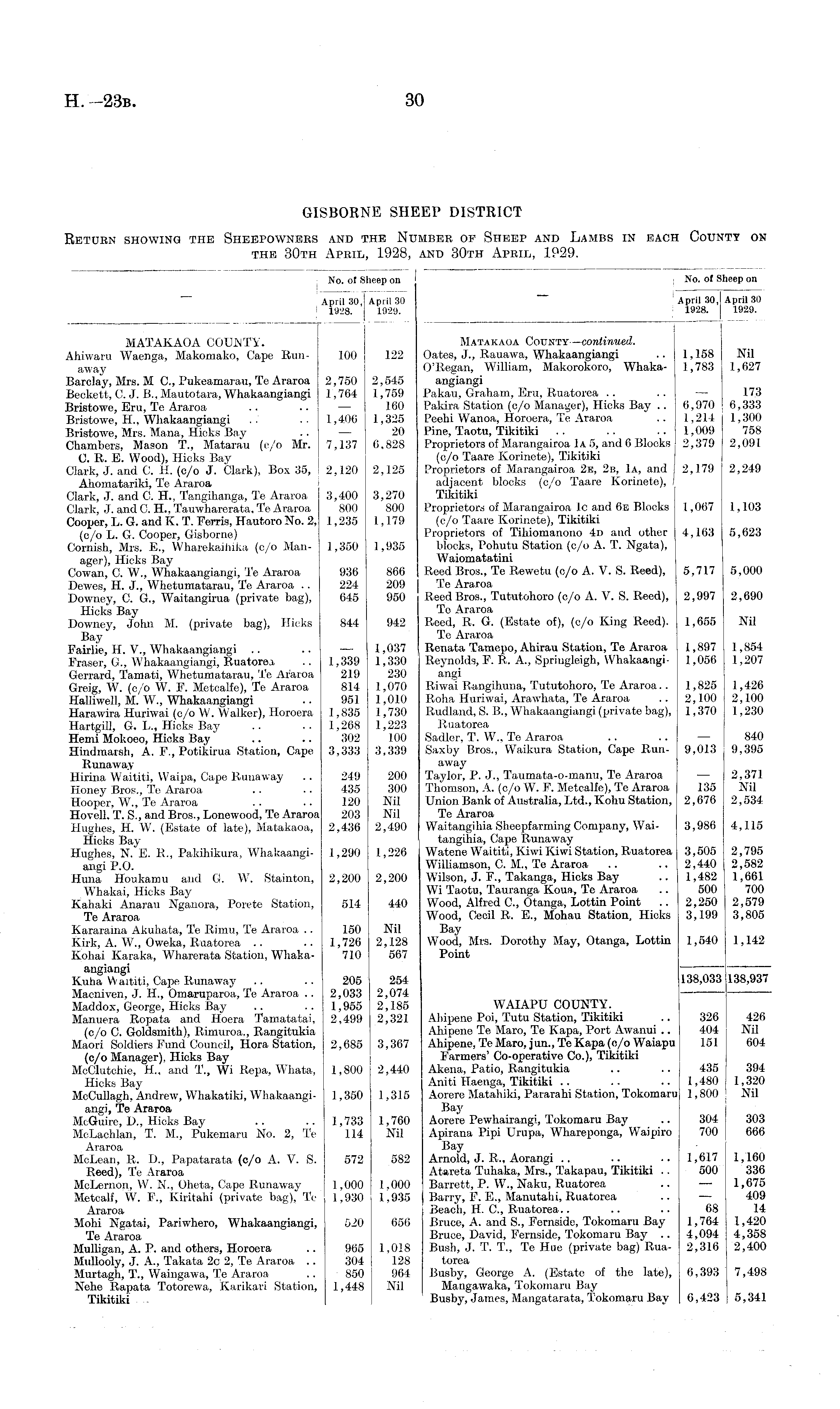 GISBORNE SHEEP DISTRICT Return showing the Sheepowners and the Number of Sheep and Lambs in each County on the 30th April, 1928, and 30th April, 1929.