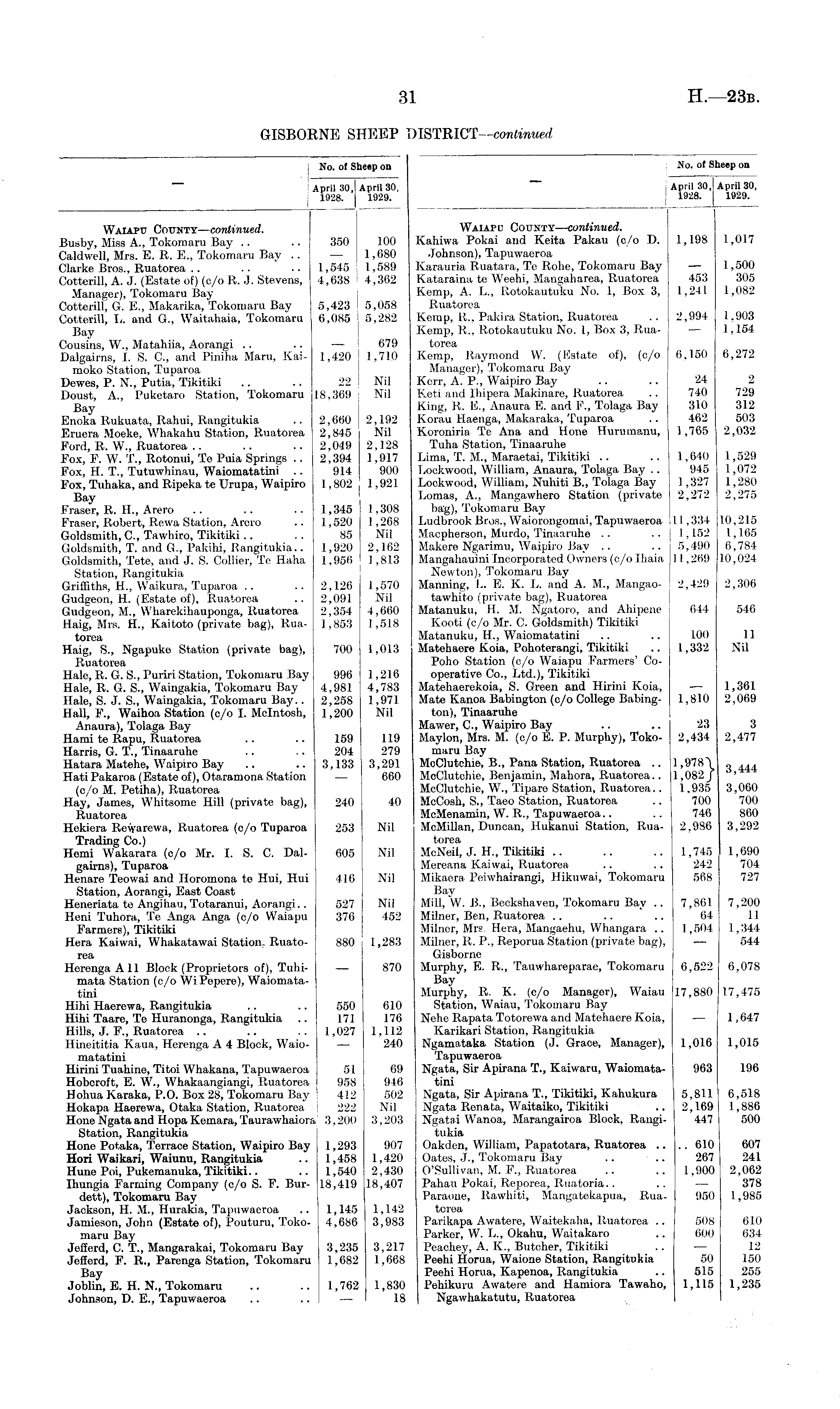| No. of Sheep on April 30, April 30, | 1928. 1929. Waiapu County—cortlinued. Busby, Miss A., Tokomaru Bay .. .. 350 100 Caldwell, Mrs. E. R. E., Tokomaru Bay .. — 1,680 Clarke Bros., Ruatorea .. .. .. 1,545 1,589 Cotterill, A. J. (Estate of) (c/o R. J. Stevens, 4,638 4,362 Manager), Tokomaru Bay Cotterill, G. E., Makarika, Tokomaru Bay 5,423 5,058 Cotterill, L. and G., Waitahaia, Tokomaru 6,085 5,282 Bay Cousins, W., Matahiia, Aorangi .. .. — 679 Dalgairns, I. S. C., and Piniha Maru, Kai- 1,420 1,710 moko Station, Tuparoa Dewes, P. N., Putia, Tikitiki .. .. 22 Nil Doust, A., Puketaro Station, Tokomaru 18,369 Nil Bay Enoka Rukuata, Rahui, Rangitukia .. 2,660 2,192 Eruera Moeke, Whakahu Station, Ruatorea 2,845 Nil Ford, R. W., Ruatorea .. .. .. 2,049 2,128 Fox, F. W. T., Rotonui, Te Puia Springs .. 2,394 1,917 Fox, H. T., Tutuwhinau, Waiomatatini .. 914 900 Fox, Tuhaka, and Ripeka te Urupa, Waipiro 1,802, 1,921 Bay Fraser, R. H., Arero .. .. .. 1,345 1,308 Fraser, Robert, Rewa Station, Arero .. 1,520 1,268 Goldsmith, C., Tawhiro, Tikitiki.. .. 85 Nil Goldsmith, T. and G., Pakihi, Rangitukia.. 1,920 2,162 Goldsmith, Tete, and J. S. Collier, Te Haha 1,956 1,813 Station, Rangitukia Griffiths, H., Waikura, Tuparoa .. .. 2,126 1,570 Gudgeon, H. (Estate of), Ruatorea .. 2,091 Nil Gndgeon, M., Wharekihauponga, Ruatorea 2,354 4,660 Haig, Mrs. H., Kaitoto (private bag), Rua- 1,853 1,518 torea Haig, S., Ngapuke Station (private bag), 700 1,013 Ruatorea Hale, R. G. S., Puriri Station, Tokomaru Bay 996 1,216 Hale, R. G. S., Waingakia, Tokomaru Bay 4,981 4,783 Hale, S. J. S., Waingakia, Tokomaru Bay.. 2,258 1,971 Hall, F., Waihoa Station (e/o I. Mcintosh, 1,200 Nil Anaura), Tolaga Bay Hami te Rapu, Ruatorea .. .. 159 119 Harris, G. T., Tinaaruhe .. .. 204 279 Hatara Matehe, Waipiro Bay .. .. 3,133 3,291 Hati Pakaroa (Estate of), Otaramona Station — 660 (c/o M. Petiha), Ruatorea Hay, James, Whitsome Hill (private bag), 240 40 Ruatorea Hekiera Reiyarewa, Ruatorea (c/o Tuparoa 253 Nil Trading Co.) Hemi Wakarara (c/o Mr. I. S. C. Dal- 605 Nil gairns), Tuparoa Henare Teowai and Horomona te Hui, Hui 416 Nil Station, Aorangi, East Coast Heneriata te Angihau, Totaranui, Aorangi.. 527 Nil Heni Tuhora, Te Anga Anga (c/o Waiapu 376 452 Farmers), Tikitiki Hera Kaiwai, Whakatawai Station.. Ruato- 880 1,283 rea HerengaAll Block (Proprietors of), Tuhi- — 870 mata Station (c/o WiPepere), Waiomatatini Hihi Haerewa, Rangitukia .. .. 550 610 Hihi Taare, Te Huranonga, Rangitukia .. 171 176 Hills, J. F., Ruatorea .. .. .. 1,027 1,112 Hineititia Kaua, Herenga A 4 Block, Waio- — 240 matatini Hirini Tuahine, Titoi Whakana, Tapuwaeroa 51 69 Hobcroft, E. W., Whakaangiangi, Ruatorea 958 946 Hohua Karaka, P.O. Box 28, Tokomaru Bay 412 502 Hokapa Haerewa, Otaka Station, Ruatorea j 222 Nil HoneNgataand Hopa Kemara, Taurawhaiora 3,200 3,203 Station, Rangitukia Hone Potaka, Terrace Station, Waipiro Bay 1,293 907 Hori Waikari, Waiunu, Rangitukia .. 1,458 1,420 Hune Poi, Pukemanuka, Tikitiki.. .. 1,540 2,430 Ihungia Farming Company (c/o S. F. Bur- 18,419 18,407 dett), Tokomaru Bay Jackson, H. M., Hurakia, Tapuwaeroa .. 1,145 1,142 Jamieson, John (Estate of), Pouturu, Toko- 4,686 3,983 maru Bay Jefferd, C. T., Mangarakai, Tokomaru Bay 3,235 3,217 Jefferd, F. R., Parenga Station, Tokomaru 1,682 1,668 Bay Joblin, E. H. N., Tokomaru .. .. 1,762 1,830 Johnson, D. E., Tapuwaeroa .. .. — 18