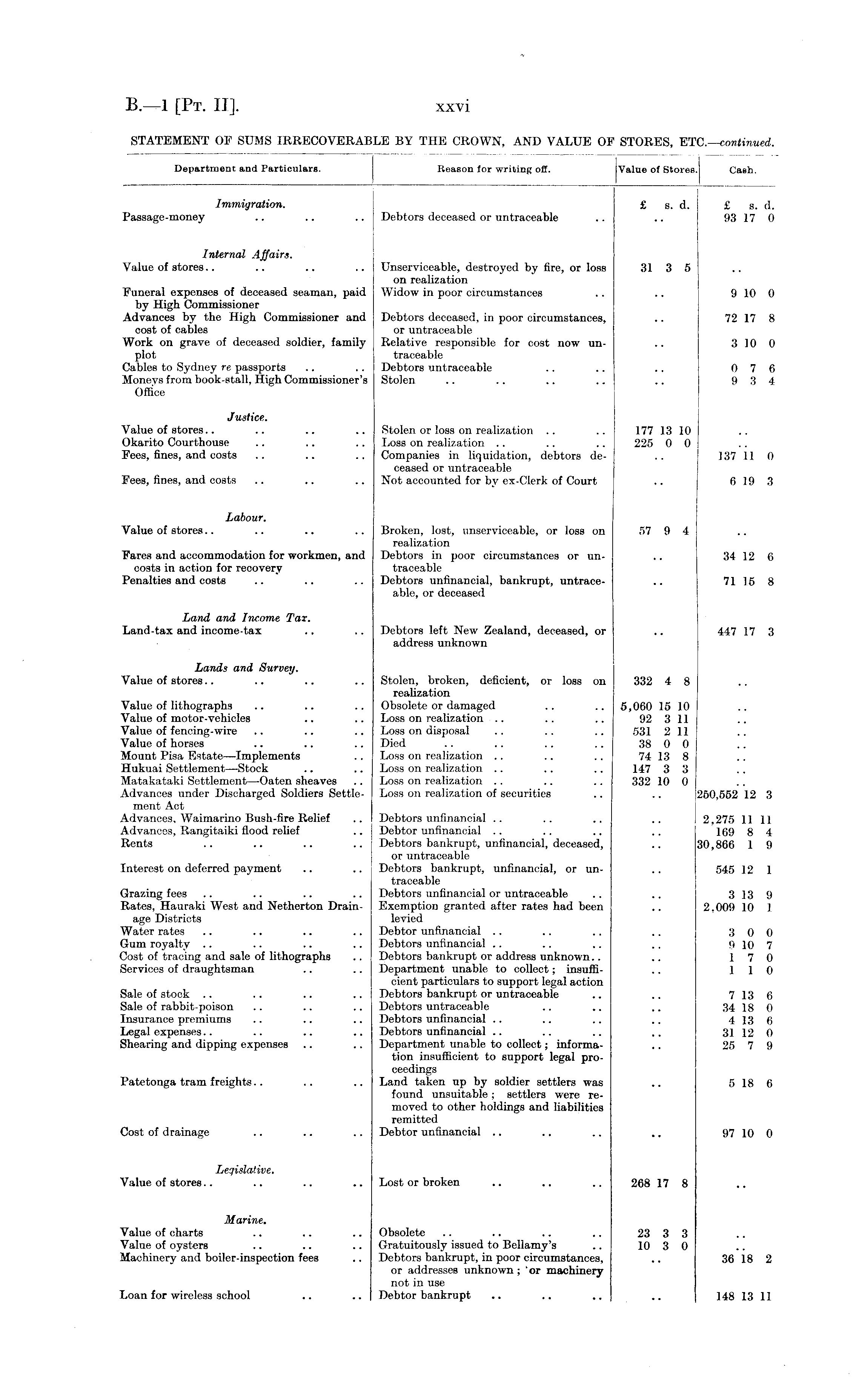 Department and Particulars. Reason for writing off. Value of Stores. Cash. Immigration. £ s. d. £ s. d. Passage-money .. .. .. Debtors deceased or untraceable .. .. 93 17 0 Internal Affairs. Value of stores.. .. .. .. Unserviceable, destroyed by fire, or loss 31 3 5 on realization Funeral expenses of deceased seaman, paid Widow in poor circumstances .. .. 9 10 0 by High Commissioner Advances by the High Commissioner and Debtors deceased, in poor circumstances, .. 72 17 8 cost of cables or untraceable Work on grave of deceased soldier, family Relative responsible for cost now un- .. 3 10 0 plot traceable Cables to Sydney re passports .. .. Debtors untraceable .. .. .. 0 7 6 Moneys from book-stall, High Commissioner's Stolen .. .. .. .. .. 9 3 4 Office Justice. Value of stores.. .. .. .. Stolen or loss on realization .. .. 177 13 10 Okarito Courthouse .. .. .. Loss on realization .. .. .. 225 0 0 Fees, fines, and costs .. .. .. Companies in liquidation, debtors de- .. 137 11 0 ceased or untraceable Fees, fines, and costs .. .. .. Not accounted for by ex-Clerk of Court .. 6 19 3 Labour. Value of stores.. .. .. .. Broken, lost, unserviceable, or loss on 57 9 4 realization Fares and accommodation for workmen, and Debtors in poor circumstances or un- .. 34 12 6 costs in action for recovery traceable Penalties and costs .. .. .. Debtors unfinancial, bankrupt, untrace- .. 71 15 8 able, or deceased Land and Income Tar. Land-tax and income-tax .. .. Debtors left New Zealand, deceased, or .. 447 17 3 address unknown Lands and Survey. Value of stores.. .. .. .. Stolen, broken, deficient, or loss on 332 4 8 realization Value of lithographs .. .. .. Obsolete or damaged .. .. 5,060 15 10 Value of motor-vehicles .. .. Loss on realization .. .. .. 92 3 11 Value of fencing-wire .. .. .. Loss on disposal .. .. .. 531 2 11 Value of horses .. .. .. Died .. .. .. .. 38 0 0 Mount Pisa Estate—Implements .. Loss on realization .. .. .. 74 13 8 Hukuai Settlement—Stock .. .. Loss on realization .. .. .. 147 3 3 Matakataki Settlement—Oaten sheaves .. Loss on realization .. .. .. 332 10 0 Advances under Discharged Soldiers Settle- Loss on realization of securities .. .. 250,552 12 3 ment Act Advances, Waimarino Bush-fire Relief .. Debtors unfinancial .. .. .. .. 2,275 11 11 Advances, Rangitaiki flood relief .. Debtor unfinancial .. .. .. .. 169 8 4 Rents .. .. .. .. Debtors bankrupt, unfinancial, deceased, .. 30,866 1 9 or untraceable Interest on deferred payment .. .. Debtors bankrupt, unfinancial, or un- .. 545 12 1 traceable Grazing fees .. .. .. .. Debtors unfinancial or untraceable .. .. 3 13 9 Rates, Hauraki West and Netherton Drain- Exemption granted after rates had been .. 2.009 10 1 age Districts levied Water rates .. .. .. .. Debtor unfinancial .. .. .. .. 3 0 0 Gum royalty .. .. .. .. Debtors unfinancial .. .. .. .. 9107 Cost of tracing and sale of lithographs .. Debtors bankrupt or address unknown.. .. 17 0 Services of draughtsman .. .. Department unable to collect; insuffi- .. 110 cient particulars to support legal action Sale of stock .. .. .. .. Debtors bankrupt or untraceable .. .. 7 13 6 Sale of rabbit-poison .. .. .. Debtors untraceable .. .. .. 34 18 0 Insurance premiums .. .. .. Debtors unfinancial .. .. .. .. 4136 Legal expenses.. .. .. .. Debtors unfinancial .. .. .. .. 31 12 0 Shearing and dipping expenses .. .. Department unable to collect; informa- .. 25 7 9 tion insufficient to support legal proceedings Pate tonga tram freights.. .. .. Land taken up by soldier settlers was .. 5 18 6 found unsuitable; settlers were removed to other holdings and liabilities remitted Cost of drainage .. .. .. Debtor unfinancial .. .. .. .. 97 10 0 Legislative. Value of stores.. .. .. .. Lost or broken .. .. .. 268 17 8 Marine. Value of charts .. .. .. Obsolete .. .. .. .. 23 3 3 Value of oysters .. .. .. Gratuitously issued to Bellamy's .. 10 3 0 Machinery and boiler-inspection fees .. Debtors bankrupt, in poor circumstances, .. 36 18 2 or addresses unknown ; 'or machinery not in use Loan for wireless school .. .. Debtor bankrupt .. .. .. .. 148 13 11