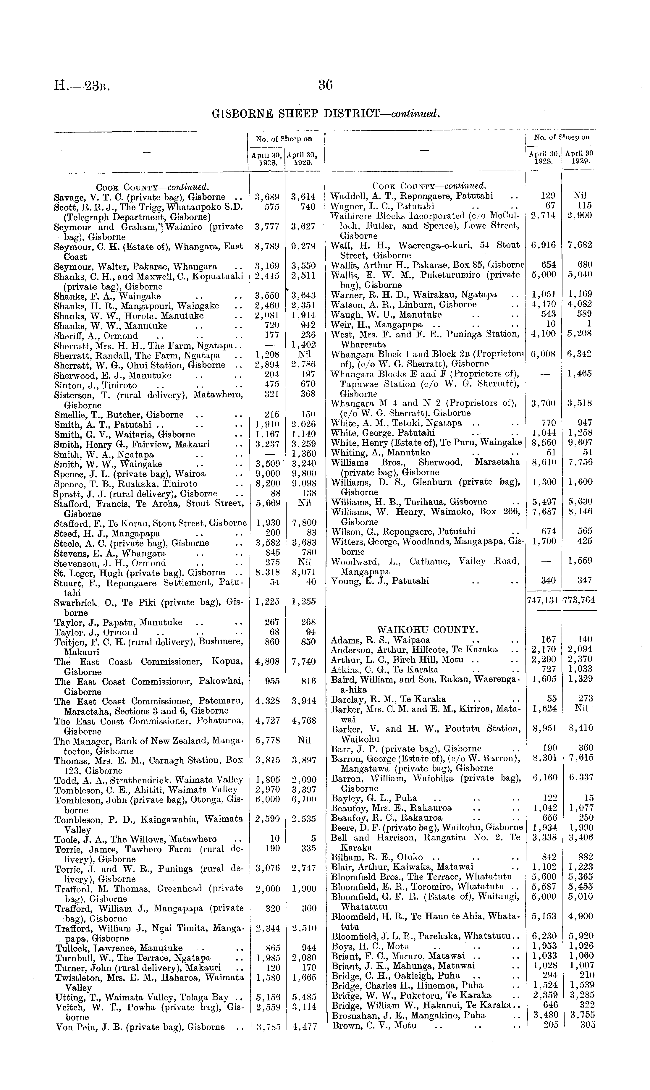 j No. of Sheep on April 30, April 30, | 1928. 1929. Cook County—continued. Waddell, A. T., Repongaere, Patutahi .. 129 Nil Wagner, L. C., Patutahi .. .. 67 115 Waihirere Blocks Incorporated (o/o McCul- 2,714 2,900 loch, Butler, and Spence), Lowe Street, Gisborne Wall, H. H., Waerenga-o-kuri, 54 Stout 6,916 7,682 Street, Gisborne Wallis, Arthur H., Pakarae, Box 85, Gisborne 654 680 Wallis, E. W. M., Puketurumiro (private 5,000 5,040 bag), Gisborne Warner, R. H. D., Wairakau, Ngatapa .. 1,051 1,169 Watson, A. R., Linburn, Gisborne .. 4,470 4,082 Waugh, W. U., Manutuke .. .. 543 589 Weir, H, Mangapapa .. .. .. 10 1 West, Mrs. F. and F. E., Puninga Station, 4,100 5,208 Whangara Block 1 and Block 2b (Proprietors 6,008 6,342 of), (c/o W. G. Sherratt), Gisborne Whangara Blocks E and F (Proprietors of), — 1,465 Tapuwae Station (c/o W. G. Sherratt), Gisborne Whangara M 4 and N 2 (Proprietors of), 3,700 3,518 (c/o W. G. Sherratt), Gisborne White, A. M., Tetoki, Ngatapa .. .. 770 947 White, George, Patutahi .. .. 1,044 1,258 White, Henry (Estate of), Te Puru, Waingake 8,550 9,607 Whiting, A., Manutuke .. .. 51 51 Williams Bros., Sherwood, Maraetaha 8,610 7,756 (private bag), Gisborne Williams, D. S., Glenburn (private bag), 1,300 1,600 Gisborne Williams, H. B., Turihaua, Gisborne .. 5,497 5,630 Williams, W. Henry, Waimoko, Box 266, 7,687 8,146 Gisborne Wilson, G., Repongaere, Patutahi .. 674 565 Witters, George, Woodlands, Mangapapa, Gis- 1,700 425 borne Woodward, L., Cathame, Valley Road, — 1,559 Mangapapa Young, E. J., Patutahi .. .. 340 347 747,131 773,764 WAIKOHU COUNTY. Adams, R. S., Waipaoa .. .. 167 140 Anderson, Arthur, Hillcote, Te Karaka .. 2,170 2,094 Arthur, L. C., Birch Hill, Motu .. .. 2,290 2,370 Atkins, C. G., Te Karaka .. .. 727 1,033 Baird, William, and Son, Rakau, Waerenga- 1,605 1,329 a-hika Barclay, R. M., Te Karaka .. .. 55 273 Barker, Mrs. C. M. and E. M., Kiriroa, Mata- 1,624 Nil wai Barker, V. and H. W., Poututu Station, 8,951 8,410 Waikohu Barr, J. P. (private bag), Gisborne .. 190 360 Barron, George (Estate of), (c/o W. Barron), 8,301 7,615 Mangatawa (private bag), Gisborne Barron, William, Waiohika (private bag), 6,160 6,337 Gisborne Bayley, G. L., Puha .. .. .. 122 15 Beaufoy, Mrs. E., Rakauroa .. .. 1,042 1,077 Beaufoy, R. C., Rakauroa .. .. 656 250 Beere, I). F. (private bag), Waikohu, Gisborne 1,934 1,990 Bell and Harrison, Rangatira No. 2, Te 3,338 3,406 Karaka Bilham, R. E., Otoko .. .. .. 842 882 Blair, Arthur, Kaiwaka, Matawai .. 1,102 1,223 Bloomfield Bros., The Terrace, Whatatutu 5,600 5,365 Bloomfield, E. R., Toromiro, Whatatutu .. 5,587 5,455 Bloomfield, G. F. R. (Estate of), Waitangi, 5,000 5,010 Whatatutu Bloomfield, H. R., Te Hauo te Ahia, Whata- 5,153 4,900 tutu Bloomfield, J. L. R., Parehaka, Whatatutu.. 6,230 5,920 Boys, H. C., Motu .. .. .. 1,953 1,926 Briant, F. C., Mararo, Matawai .. .. 1,033 1,060 Briant, J. K., Mahunga, Matawai .. 1,028 1,007 Bridge, C. H., Oakleigh, Puha .. .. 294 210 Bridge, Charles H., Hinemoa, Puha .. 1,524 1,539 Bridge, W. W., Puketoru, Te Karaka .. 2,359 3,285 Bridge, William W., Hakanui, Te Karaka.. 646 322 Brosnahan, J. E., Mangakino, Puha .. 3,480 3,755 Brown, C. V., Motu .. .. .. 205 305