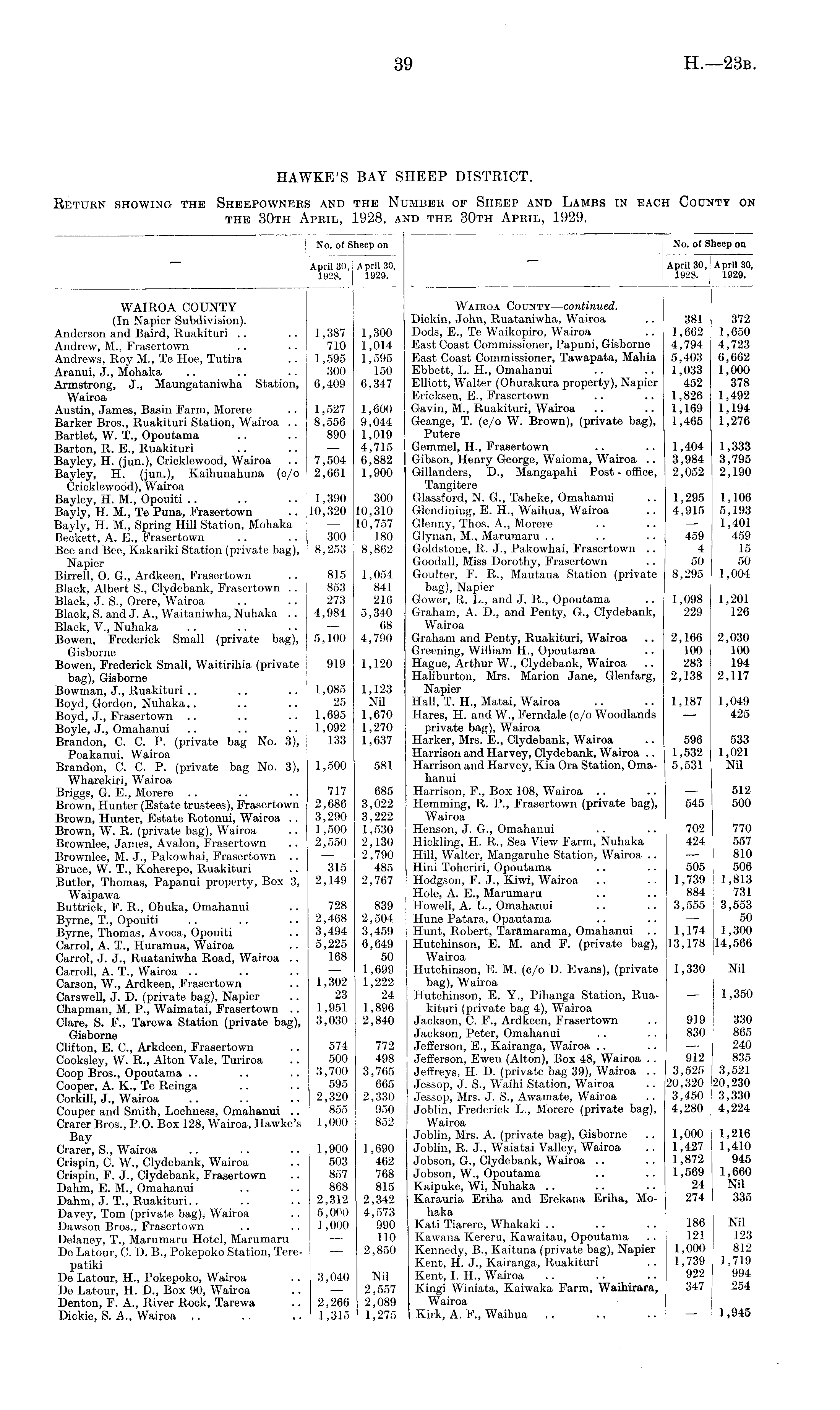 HAWKE'S BAY SHEEP DISTRICT. Return showing the Sheepowners and the Number of Sheep and Lambs in each County on the 30th April, 1928, and the 30th April, 1929.