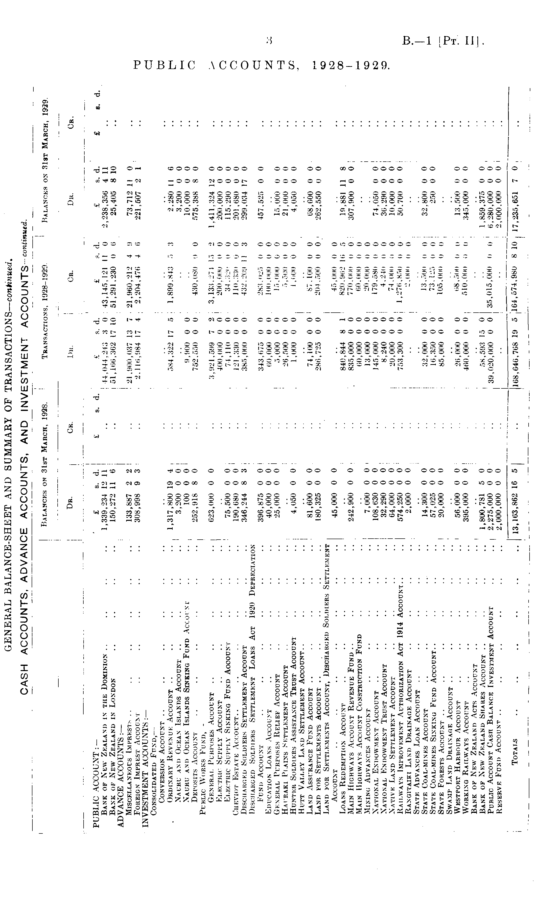1 Balances on 31st March, 1928. j Transactions, 1928-1929. j Balances on 31st March, 1929. Dr. Cr. Dr. Cr. Dr. Or. PUBLIC ACCOUNT: — £ s. d. £ s. d. £ s. d. £ s. d. £ s. d. £ s. d. BANK OF NEW ZEALAND IN THE DOMINION .. .. .. .. 1,339,234 12 11 .. 44,044,243 3 0 43,145,121 11 0 2,238,356 4 11 BANK OF NEW Zealand in LONDON .. .. .. .. 150,272 11 6 .. 51,166,362 17 10 51,291,230 0 6 25,405 8 10 ADVANCE ACCOUNTS Miscellaneous Imprests .. .. .. .. .. .. 133,887 2 2 .. 21,900,037 13 7 21,960,212 4 9 73,712 11 0 Foreign Imprest Account .. .. .. .. .. 308,998 9 3 .. 2,116,984 17 4 2,204,476 4 6 221,507 2 1 INVESTMENT ACCOUNTS Consolidated Eund, — Conversion Account .. .. .. .. .. ... Ordinary Revenue Account .. .. .. .. .. j 1,317,800 19 4 .. 584,322 17 5 1,899,843 5 3 2,280 11 6 Nauru and Ocean Islands Account .. .. .. .. j 3,200 0 0 .. .. .. 3,200 0 0 Nauru and Ocean Islands Sinking Fund Account .. .. 100 0 0 9,900 0 0 .. 10,000 0 0 Deposits Account .. .. .. .. .. .. 252,918 8 0 .. 752,550 0 0 430,080 0 0 575,388 8 0 Public Works Fund, — General Purposes ACCOUNT .. .. .. .. .. 623,000 0 0 .. 3,921,599 7 2 3,133,274 15 2 1,411,324 12 0 Electric Supply ACCOUNT .. .. .. .. .. .. .. 400,000 Q 0 200,000 0 0 200,000 0 0 Electric Supply Sinking Fund Account .. .. .. 75,500 0 0 .. 74,110 0 0 34,320 0 0 115,290 0 0 Cheviot Estate Account.. .. .. .. .. .. 1 190,680 0 0 .. 121,330 0 0 110,330 0 0 201,680 0 0 Discharged Soldiers Settlement Account .. .. .. 346,244 8 3 .. 385,000 0 0 432,209 11 3 299,034 17 0 Discharged Soldiers Settlement Loans Act 1920 Depreciation Fund Account .. .. .. .. .. .. 396,875 0 0 .. 343,675 0 0 283,025 0 0 457,525 0 0 EDUCATION LOANS Account .. .. .. .. .. 40,000 0 0 .. 60,000 0 0 100,000 0 0 General Purposes Relief Account .. .. .. .. j 25,000 0 0 .. 5,000 0 0 15,000 0 0 15,000 0 0 Haijraki Plains Settlement Account .. .. .. .. .. .. 26,500 0 0 5,500 0 0 21,000 0 0 Hunter Soldiers Assistance Trust Account .. .. .. J 4,050 0 0 .. 1,000 0 0 1,000 0 0 4,050 0 0 Hutt Valley Land Settlement Account.. ...... Land ASSURANCE Fund Account .. .. .. .. .. 81,600 0 0 .. 74,100 0 0 87,100 0 0 68,600 0 0 Land for Settlements Account .. ... .. .. .. 180,325 0 0 .. 286,725 0 0 204,500 0 0 262,550 0 0 Land for Settlements Account, Discharged Soldiers Settlement Account .. .. .. .. .. .. .. 45,000 0 0 .. .. 45,000 0 0 Loans Redemption Account .. .. .. .. .. .. .. 840,844 8 1 820,962 16 5 19,881 11 8 Main Highways Account Revenue Fund .. .. .. .. 242,900 0 0 .. . 835,000 0 0 770,000 0 0 307,900 0 0 Main Highways Account Construction Fund .. .. .. .. .. 60,000 0 0 60,000 0 0 Mining Advances Account .. .. .. .. ..I 7,000 0 0 .. 13,000 0 0 20,000 0 0 National Endowment Account .. .. .. .. .. 108,630 0 0 .. 145,000 0 0 179,580 0 0 74,050 0 0 National Endowment Trust Account .. .. .. .. 32,290 0 0 . 8,240 0 0 4,240 0 0 36,290 0 0 Native Land Settlement Account .. .. .. .. 64,000 0 0 .. 20,000 0 0 74,000 0 0 10,000 0 0 Railways Improvement Authorization Act 1914 Account.. .. 574,250 0 0 .. 753,300 0 0 1,276,850 0 0 50,700 0 0 Rangitaiki Land Drainage Account .. .. .. .. 2,000 0 0 .. .. 2,000 0 0 State Advances Loan Account .. .. .. .. State Coal-mines ACCOUNT .. .. .. .. .. 14,300 0 0 .. 32,000 0 0 13,500 0 0 32,800 0 0 State Coal-mines Sinking Fund Account.. .. .. .. 57,025 0 0 16,350 0 0 73,125 0 0 250 0 0 State Forests Account .. .. .. .. .. .. 20,000 0 0 .. 85,000 0 0 105,000 0 0 Swamp Land Drainage Account .. .. • ■ .. Westport Harbour ACCOUNT .. .. .. .. .. 56,000 0 0 26,000 0 0 68,500 0 0 13,500 0 0 Working Railways Account .. .. .. .. .. 395,000 0 0 460,000 0 0 510,000 0 0 345,000 0 0 Bank of New Zealand Acts Account .. .. .. Bank of New Zealand Shares Account .. .. .. .. 1,800,781 5 0 .. 58,593 15 0 1,859,375 0 0 Public Account Cash Balance Investment Account .. .. 2,275,000 0 0 .. 39,020,000 0 0 35,015,000 0 0 6,280,000 0 0 Reserve Fund Account .. .. .. .. .. .. 2,000,000 0 0 .. .. .. 2,000,000 0 0 Totals .. .. .. .. .. .. j 13,163,862 16 5 .. 168,646,768 19 5 164,574,980 8 10 17,235,651 7 0