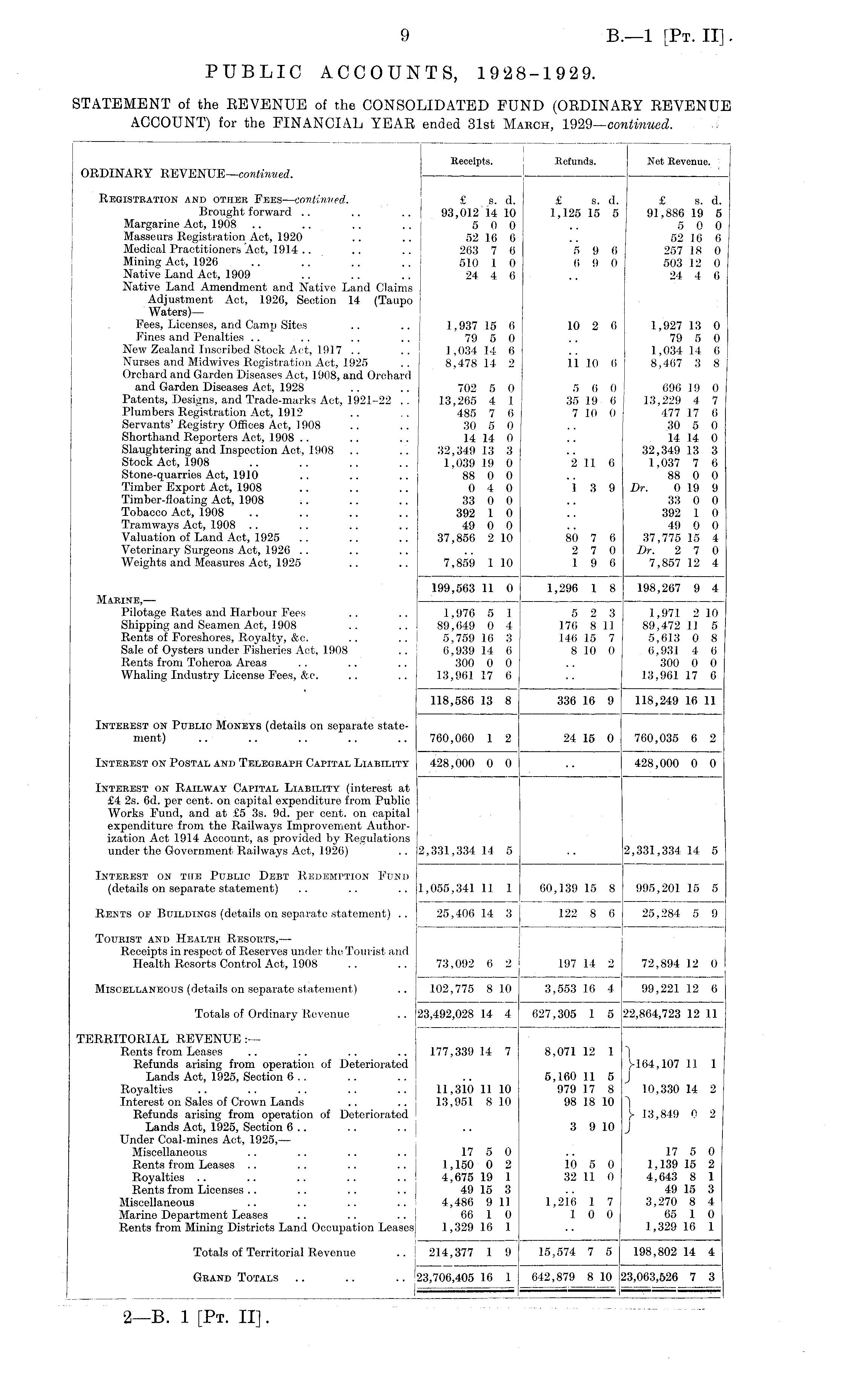 Receipts. Refunds. Net Revenue. ORDINARY REVENUE—continued. Registration and other Fees —continued. £ s. d. £ s. d. £ s. d. Brought forward .. .. .. 93,012 14 10 1,125 15 5 91,886 19 5 Margarine Act, 1908 .. .. .. .. 50 0 .. 500 Masseurs Registration Act, 1920 .. .. 52 16 6 .. 52 16 6 Medical Practitioners Act, 1914 .. .. .. 263 7 6 5 9 6 257 18 0 Mining Act, 1926 .. .. .. .. 510 1 0 6 9 0 503 12 0 Native Land Act, 1909 .. .. .. 24 4 6 .. 24 4 6 Native Land Amendment and Native Land Claims Adjustment Act, 1926, Section 14 (Taupo Waters) — Fees, Licenses, and Camp Sites .. .. 1,937 15 6 10 2 6 1,927 13 0 Fines and Penalties .. .. .. .. 79 5 0 .. 79 5 0 New Zealand Inscribed Stock Act, 1917 .. .. 1,034 14 6 .. 1,034 14 6 Nurses and Midwives Registration Act, 1925 .. 8,478 14 2 11 10 6 8,467 3 8 Orchard and Garden Diseases Act, 1908, and Orchard and Garden Diseases Act, 1928 .. .. 702 5 0 5 6 0 696 19 0 Patents, Designs, and Trade-marks Act, 1921-22 .. 13,265 4 1 35 19 6 13,229 4 7 Plumbers Registration Act, 1912 .. . . 485 7 6 7 10 0 477 17 6 Servants'Registry Offices Act, 1908 .. .. 30 5 0 .. 30 5 0 Shorthand Reporters Act, 1908 .. .. .. 14 14 0 .. 14 14 0 Slaughtering and Inspection Act, 1908 .. . . 32,349 13 3 .. 32,349 13 3 Stock Act, 1908 .. .. .. .. 1,039 19 0 2 11 6 1,037 7 6 Stone-quarries Act, 1910 .. .. .. 88 0 0 .. 88 0 0 Timber Export Act, 1908 .. .. .. 0 4 0 1 3 9 Dr. 0 19 9 Timber-floating Act, 1908 .. .. .. 33 0 0 .. 33 0 0 Tobacco Act, 1908 .. .. .. .. 392 1 0 .. 392 1 0 Tramways Act, 1908 .. . . .. .. 49 0 0 .. 49 0 0 Valuation of Land Act, 1925 .. .. .. 37,856 2 10 80 7 6 37,775 15 4 Veterinary Surgeons Act, 1926 .. .. .. .. 2 7 0 Dr. 2 7 0 Weights and Measures Act, 1925 .. .. 7,859 1 10 1 9 6 7,857 12 4 199,563 11 0 1,296 1 8 198,267 9 4 Marine, — — Pilotage Rates and Harbour Fees .. .. 1,976 5 1 5 2 3 1,971 2 10 Shipping and Seamen Act, 1908 .. .. 89,649 0 4 176 8 11 89,472 11 5 Rents of Foreshores, Royalty, &c. .. .. 5,759 16 3 146 15 7 5,613 0 8 Sale of Oysters under Fisheries Act, 1908 .. 6,939 14 6 8 10 0 6,931 4 6 Rents from Toheroa Areas . . .. .. 300 0 0 .. 300 0 0 Whaling Industry License Fees, &c. .. .. 13,961 17 6 .. 13,961 17 6 118,586 13 8 336 16 9 118,249 16 11 Interest on Public Moneys (details on separate statement) .. .. .. .. .. 760,060 12 24 15 0 760,035 6 2 Interest on Postal and Telegraph Capital Liability 428,000 0 0 .. 428,000 0 0 Interest on Railway Capital Liability (interest at £4 2s. 6d. per cent, on capital expenditure from Public Works Fund, and at £5 3s. 9d. per cent, on capital expenditure, from the Railways Improvement Authorization Act 1914 Account, as provided by Regulations under the Government Railways Act, 1926) .. 2,331,334 14 5 .. 2,331,334 14 5 Interest on the Public Debt Redemption Fund (details on separate statement) .. .. .. 1,055,341 11 1 60,139 15 8 995,201 15 5 Rents of Buildings (details on separate statement) .. 25,406 14 3 122 8 6 25,284 5 9 Tourist and Health Resorts, — Receipts in respect of Reserves under the Tourist and Health Resorts Control Act, 1908 .. .. 73,092 6 2 197 14 2 72,894 12 0 Miscellaneous (details on separate statement) .. 102,775 8 10 3,553 16 4 99,221 12 6 Totals of Ordinary Revenue .. 23,492,028 14 4 627,305 1 5 22,864,723 12 11 TERRITORIAL REVENUE Rents from Leases .. .. .. .. 177,339 14 7 8,071 12 1 1 Refunds arising from operation of Deteriorated J>164,107 11 1 Lands Act, 1925, Section 6. . .. .. .. 5,160 11 5 J Royalties .. .. .. .. .. 11,310 11 10 979 17 8 10,330 14 2 Interest on Sales of Crown Lands .. .. 13,951 8 10 98 18 10 1 Refunds arising from operation of Deteriorated 13,849 0 2 Lands Act, 1925, Section 6 .. .. .. .. 3 9 10 J Under Coal-mines Act, 1925, — Miscellaneous .. .. .. .. 17 5 0 .. 17 5 0 Rents from Leases .. .. .. .. 1,150 0 2 10 5 0 1,139 15 2 Royalties .. .. .. .. .. 4,675 19 1 32 11 0 4,643 8 1 Rents from Licenses .. .. .. .. 49 15 3 .. 49 15 3 Miscellaneous .. .. .. .. 4,486 9 11 1,216 1 7 3,270 8 4 Marine Department Leases .. .. .. 66 10 100 65 10 Rents from Mining Districts Land Occupation Leases 1,329 16 1 .. 1,329 16 1 Totals of Territorial Revenue .. 214,377 1 9 15,574 7 5 198,802 14 4 GRAND Totals .. .. .. 23,706,405 16 1 642,879 8 10 23,063,526 7 3