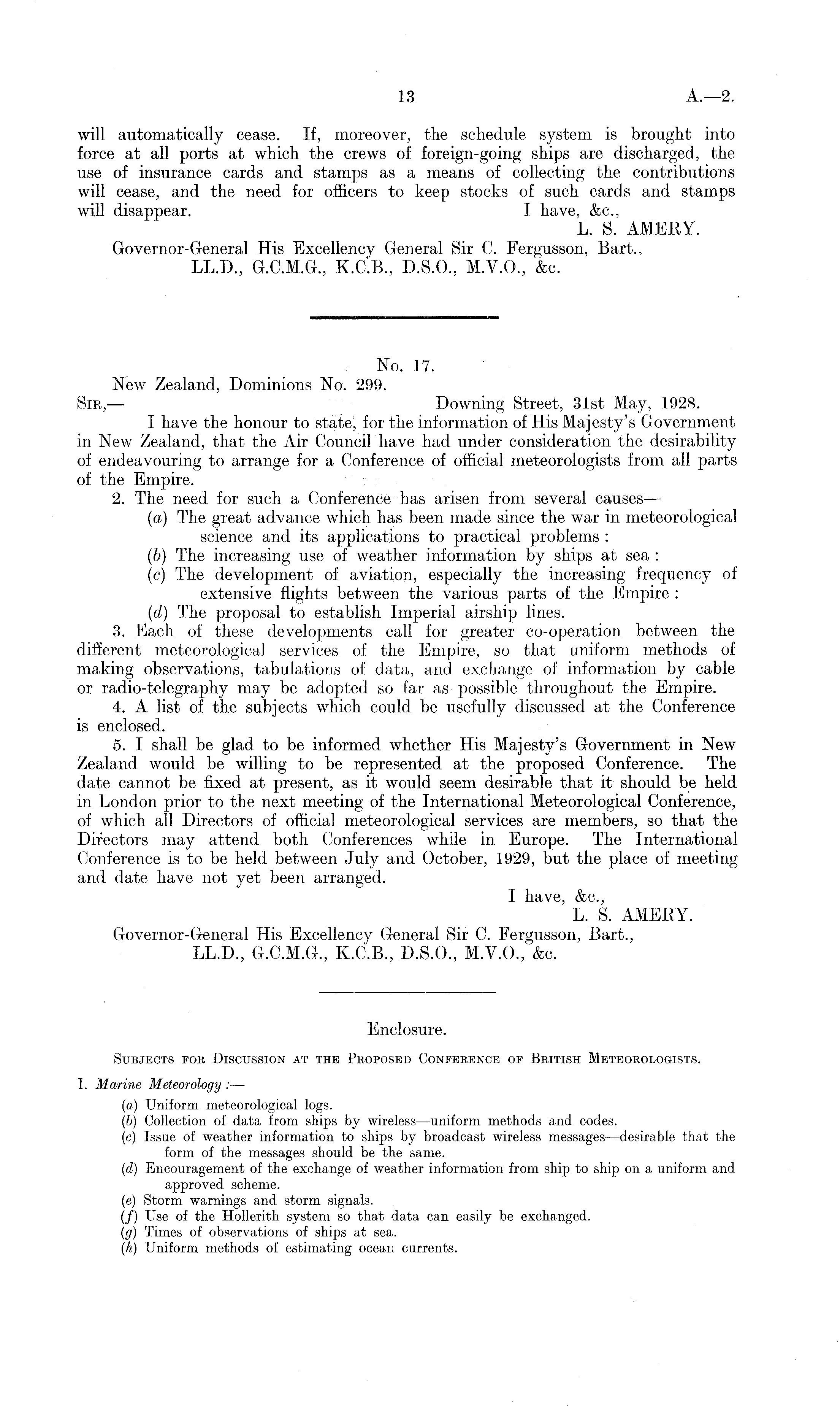 No. 17. New Zealand, Dominions No. 299. Sir, — Downing Street, 31st May, 1928. I have the honour to state, for the information of His Majesty's Government in New Zealand, that the Air Council have had under consideration the desirability of endeavouring to arrange for a Conference of official meteorologists from all parts of the Empire. 2. The need for such a Conference has arisen from several causes — (a) The great advance which has been made since the war in meteorological science and its applications to practical problems : (b) The increasing use of weather information by ships at sea : (c) The development of aviation, especially the increasing frequency of extensive flights between the various parts of the Empire : (d) The proposal to establish Imperial airship lines. 3. Each of these developments call for greater co-operation between the different meteorological services of the Empire, so that uniform methods of making observations, tabulations of data, and exchange of information by cable or radio-telegraphy may be adopted so far as possible throughout the Empire. 4. A list of the subjects which could be usefully discussed at the Conference is enclosed. 5. I shall be glad to be informed whether His Majesty's Government in New Zealand would be willing to be represented at the proposed Conference. The date cannot be fixed at present, as it would seem desirable that it should be held in London prior to the next meeting of the International Meteorological Conference, of which all Directors of official meteorological services are members, so that the Directors may attend both Conferences while in Europe. The International Conference is to be held between July and October, 1929, but the place of meeting and date have not yet been arranged. I have, &c., L. S. AMERY. Governor-General His Excellency General Sir C. Fergusson, Bart., LL.D., G.C.M.G., K.C.8., D.5.0., M.V.0., &c.