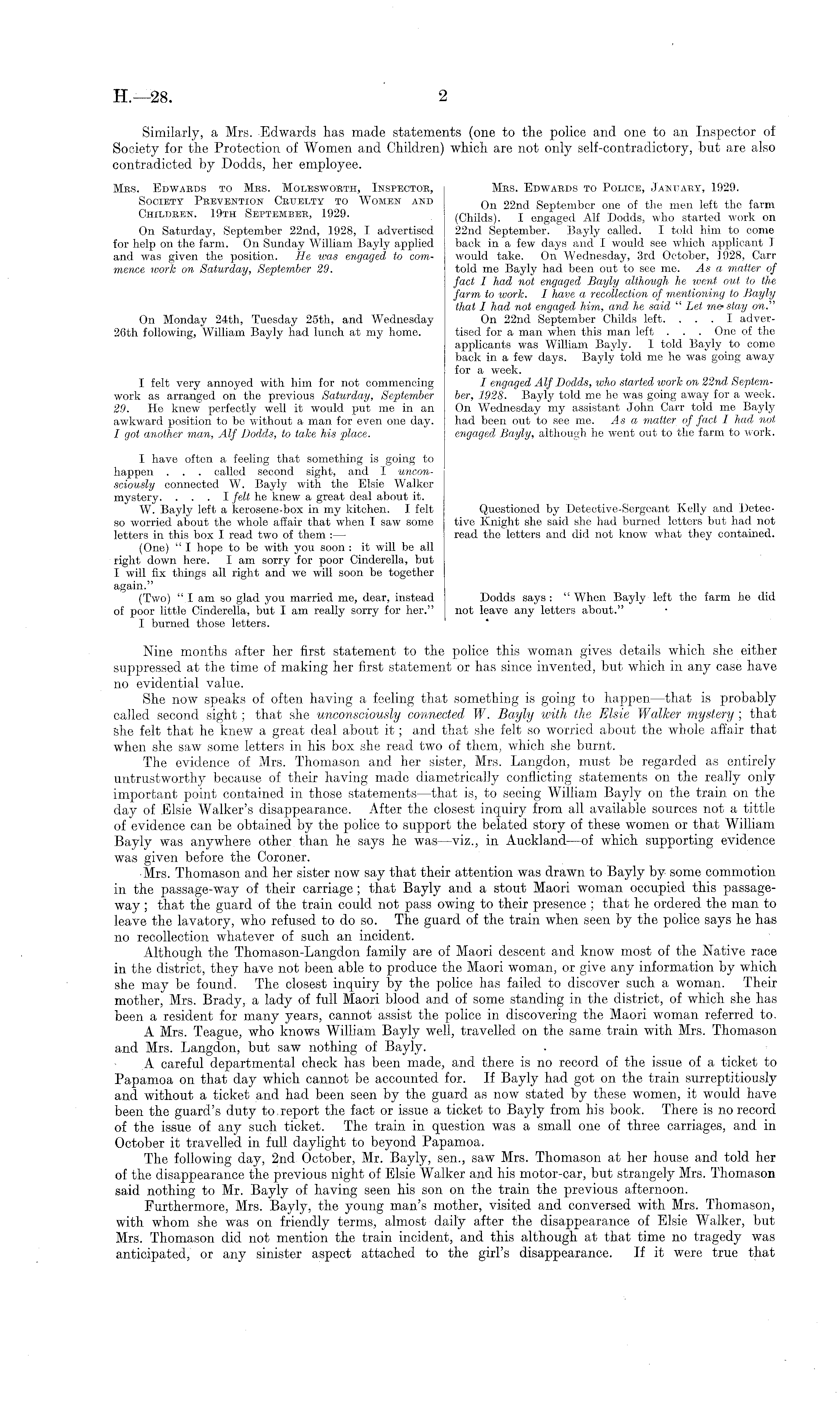 Similarly, a Mrs. Edwards lias made statements (one to the police and one to an Inspector of Society for the Protection of Women and Children) which are not only self-contradictory, but are also contradicted by Dodds, her employee. Mrs. Edwards to Mrs. Moleswoßth, Inspector, Mrs. Edwards to Police, January, 1929. Society Prevention Cruelty to Women and 0n 22nd Septem ber one of the men left the farm Children. 19th September, 1929. (Childs). I engaged Alf Dodds, who started work on On Saturday, September 22nd, 1928, I advertised 22nd September. Bayly called. I told him to come for help on the farm. On Sunday William Bayly applied back in a few days and I would see which applicant I and was given the position. He was engaged to com- would take. On Wednesday, 3rd October, 1928, Carr mence work on Saturday, September 29. told me Bayly had been out to see me. As a matter of fact I had not engaged Bayly although he went out to the farm to work. I have a recollection of mentioning to Bayly that I had not engaged him, and he said " Let m» stay on." On Monday 24th, Tuesday 25th, and Wednesday On 22nd September Childs left. ... I adver26th following, William Bayly had lunch at my home. tised for a man when this man left . . . One of the applicants was William Bayly. I told Bayly to come back in a few days. Bayly told me he was going away for a week. I felt very annoyed with him for not commencing I engaged Alf Dodds, who started work on 22nd Septemwork as arranged on the previous Saturday, September her, 1928. Bayly told me he was going away for a week. 29. He knew perfectly well it would put me in an On Wednesday my assistant John Carr told me Bayly awkward position to be without a man for even one day. had been out to see me. As a matter of fact I had not I got another man, Alf Dodds, to take his place. engaged Bayly, although he went out to the farm to work. I have often a feeling that something is going to happen . . . called second sight, and I unconsciously connected W. Bayly with the Elsie Walker mystery. ... I felt he knew a great deal about it. W. Bayly left a kerosene-box in my kitchen. I felt Questioned by Detective-Sergeant Kelly and Detecso worried about the whole affair that when I saw some tive Knight she said she had burned letters but had not letters in this box I read two of them read the letters and did not know what they contained. (One) " 1 hope to be with you soon : it will be all right down here. lam sorry for poor Cinderella, but I will fix things all right and we will soon be together again." (Two) "I am so glad you married me, dear, instead Dodds says : " When Bayly left the farm he did of poor little Cinderella, but lam really sorry for her." not leave any letters about." I burned those letters. Nine months after her first statement to the police this woman gives details which she either suppressed at the time of making her first statement or has since invented, but which in any case have no evidential value. She now speaks of often having a feeling that something is going to happen —that is probably called second sight; that she unconsciously connected W. Bayly with the Elsie Walker mystery ; that she felt that he knew a great deal about it; and that she felt so worried about the whole affair that when she saw some letters in his box she read two of them, which she burnt. The evidence of Mrs. Thomason and her sister, Mrs. Langdon, must be regarded as entirely untrustworthy because of their having made diametrically conflicting statements on the really only important point contained in those statements —that is, to seeing William Bayly on the train on the day of Elsie Walker's disappearance. After the closest inquiry from all available sources not a tittle of evidence can be obtained by the police to support the belated story of these women or that William Bayly was anywhere other than he says he was —viz., in Auckland —of which supporting evidence was given before the Coroner. Mrs. Thomason and her sister now say that their attention was drawn to Bayly by some commotion in the passage-way of their carriage; that Bayly and a stout Maori woman occupied this passageway ; that the guard of the train could not pass owing to their presence ; that he ordered the man to leave the lavatory, who refused to do so. The guard of the train when seen by the police says he has no recollection whatever of such an incident. Although the Thomason-Langdon family are of Maori descent and know most of the Native race in the district, they have not been able to produce the Maori woman, or give any information by which she may be found. The closest inquiry by the police has failed to discover such a woman. Their mother, Mrs. Brady, a lady of full Maori blood and of some standing in the district, of which she has been a resident for many years, cannot assist the police in discovering the Maori woman referred to. A Mrs. Teague, who knows William Bayly well, travelled on the same train with Mrs. Thomason and Mrs. Langdon, but saw nothing of Bayly. A careful departmental check has been made, and there is no record of the issue of a ticket to Papamoa on that day which cannot be accounted for. If Bayly had got on the train surreptitiously and without a ticket and had been seen by the guard as now stated by these women, it would have been the guard's duty to,report the fact or issue a ticket to Bayly from his book. There is no record of the issue of any such ticket. The train in question was a small one of three carriages, and in October it travelled in full daylight to beyond Papamoa. The following day, 2nd October, Mr. Bayly, sen., saw Mrs. Thomason at her house and told her of the disappearance the previous night of Elsie Walker and his motor-car, but strangely Mrs. Thomason said nothing to Mr. Bayly of having seen his son on the train the previous afternoon. Furthermore, Mrs. Bayly, the young man's mother, visited and conversed with Mrs. Thomason, with whom she was on friendly terms, al