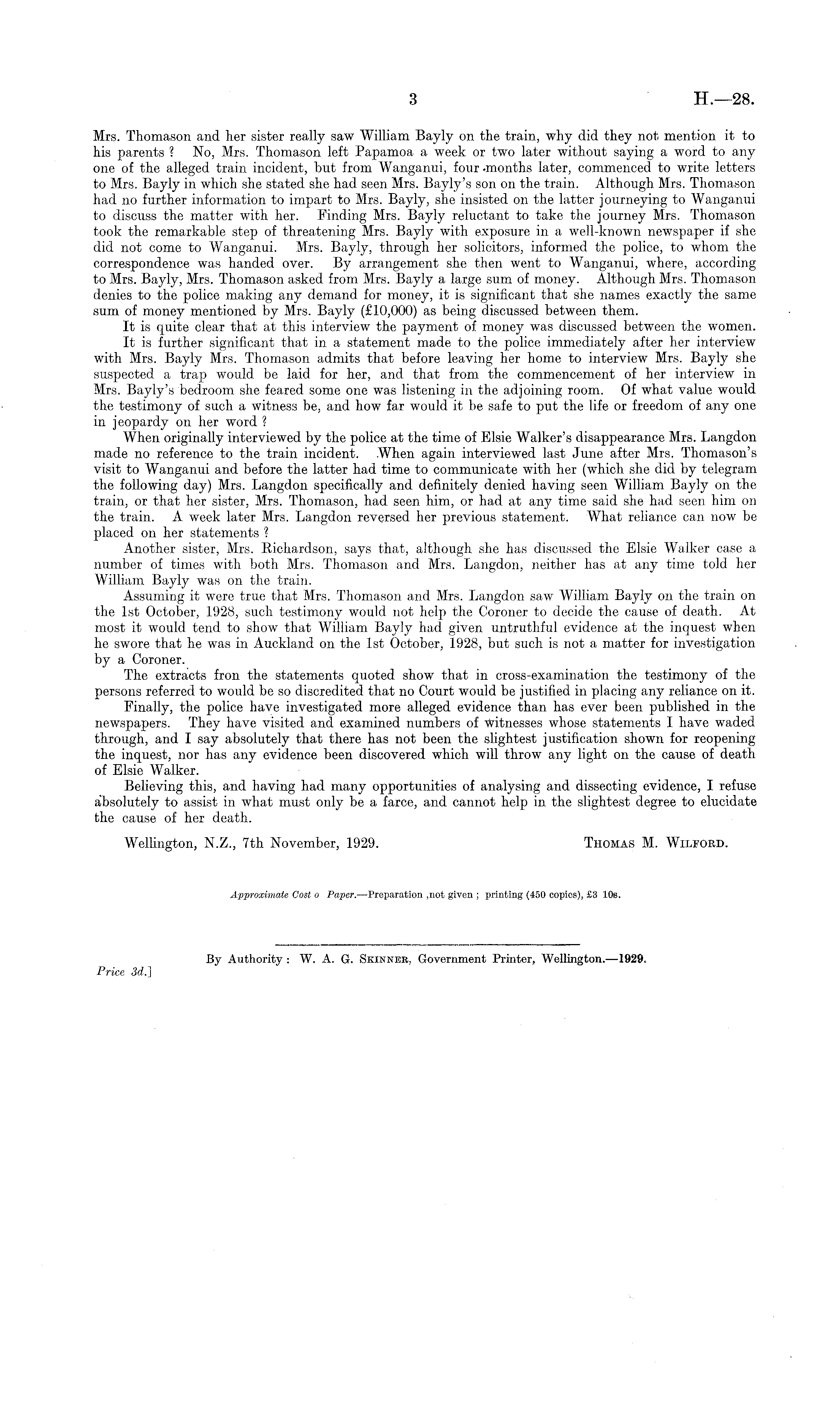 Mrs. Thomason and her sister really saw William Bayly on the train, why did they not mention it to his parents ? No, Mrs. Thomason left Papamoa a week or two later without saying a word to any one of the alleged train incident, but from Wanganui, four-months later, commenced to write letters to Mrs. Bayly in which she stated she had seen Mrs. Bayly's son on the train. Although Mrs. Thomason had no further information to impart to Mrs. Bayly, she insisted on the latter journeying to Wanganui to discuss the matter with her. Finding Mrs. Bayly reluctant to take the journey Mrs. Thomason took the remarkable step of threatening Mrs. Bayly with exposure in a well-known newspaper if she did not come to Wanganui. Mrs. Bayly, through her solicitors, informed the police, to whom the correspondence was handed over. By arrangement she then went to Wanganui, where, according to Mrs. Bayly, Mrs. Thomason asked from Mrs. Bayly a large sum of money. Although Mrs. Thomason denies to the police making any demand for money, it is significant that she names exactly the same sum of money mentioned by Mrs. Bayly (£10,000) as being discussed between them. It is quite clear that at this interview the payment of money was discussed between the women. It is further significant that in a statement made to the police immediately after her interview with Mrs. Bayly Mrs. Thomason admits that before leaving her home to interview Mrs. Bayly she suspected a trap would be laid for her, and that from the commencement of her interview in Mrs. Bayly's bedroom she feared some one was listening in the adjoining room. Of what value would the testimony of such a witness be, and how far would it be safe to put the life or freedom of any one in jeopardy on her word ? When originally interviewed by the police at the time of Elsie Walker's disappearance Mrs. Langdon made no reference to the train incident. When again interviewed last June after Mrs. Thomason's visit to Wanganui and before the latter had time to communicate with her (which she did by telegram the following day) Mrs. Langdon specifically and definitely denied having seen William Bayly on the train, or that her sister, Mrs. Thomason, had seen him, or had at any time said she had seen him on the train. A week later Mrs. Langdon reversed her previous statement. What reliance can now be placed on her statements ? Another sister, Mrs. Richardson, says that, although she has discussed the Elsie Walker case a number of times with both Mrs. Thomason and Mrs. Langdon, neither has at any time told her William Bayly was on the train. Assuming it were true that Mrs. Thomason and Mrs. Langdon saw William Bayly on the train on the Ist October, 1928, such testimony would not help the Coroner to decide the cause of death. At most it would tend to show that William Bayly had given untruthful evidence at the inquest when he swore that he was in Auckland on the Ist October, 1928, but such is not a matter for investigation by a Coroner. The extracts fron the statements quoted show that in cross-examination the testimony of the persons referred to would be so discredited that no Court would be justified in placing any reliance on it. Finally, the police have investigated more alleged evidence than has ever been published in the newspapers. They have visited and examined numbers of witnesses whose statements I have waded through, and I say absolutely that there has not been the slightest justification shown for reopening the inquest, nor has any evidence been discovered which will throw any light on the cause of death of Elsie Walker. Believing this, and having had many opportunities of analysing and dissecting evidence, I refuse absolutely to assist in what must only be a farce, and cannot help in the slightest degree to elucidate the cause of her death. Wellington, N.Z., 7th November, 1929. Thomas M. Wilford.