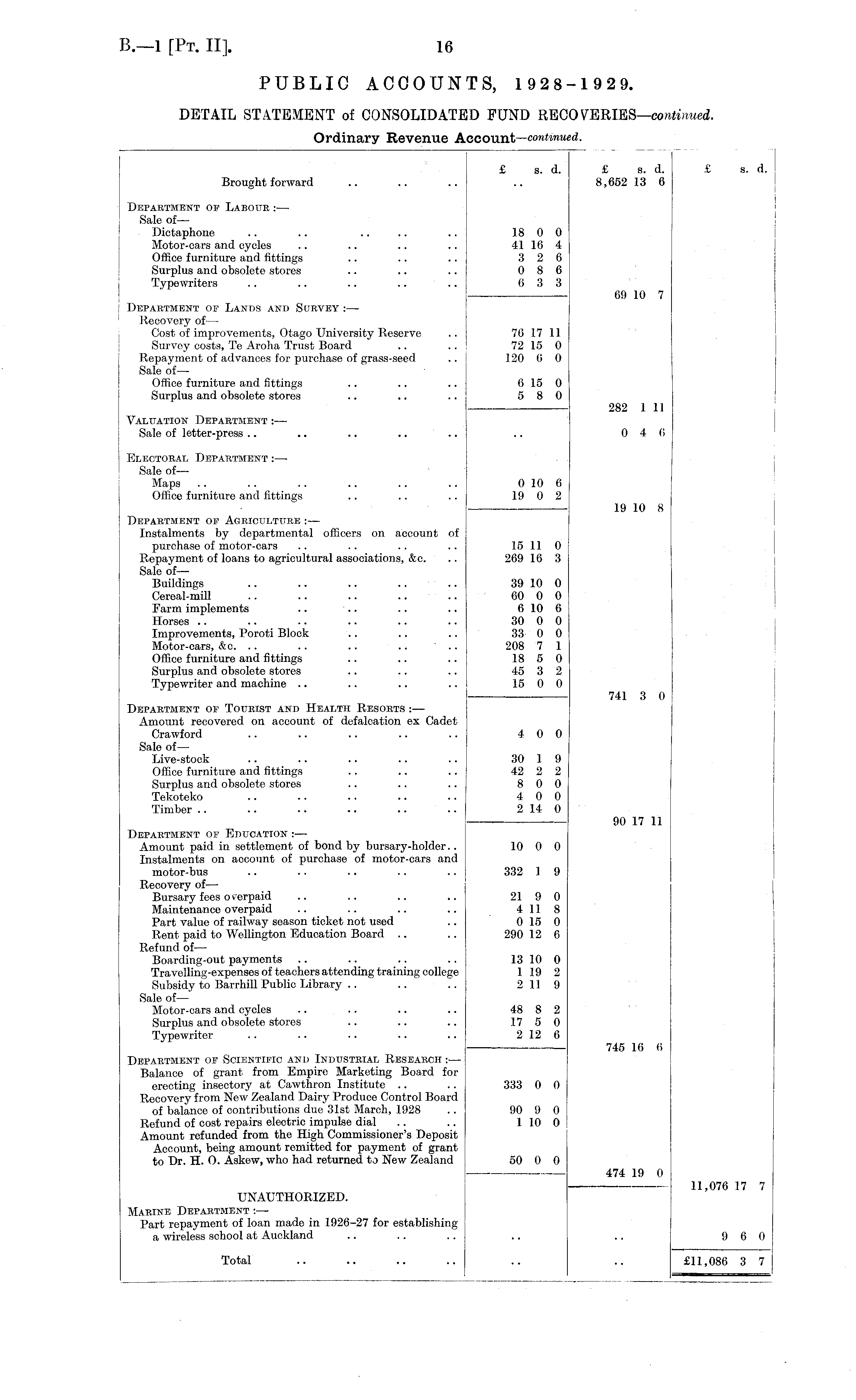 £ s. d. £ s. d. £ s. d. Brought forward .. .. .. .. 8,652 13 6 Department of Labour Sale of— Dictaphone .. .. .. .. .. 18 0 0 Motor-ears and cycles .. .. .. .. 41 16 4 Office furniture and fittings .. .. .. 3 2 6 Surplus and obsolete stores .. .. .. 0 8 6 Typewriters .. .. .. .. .. 633 — 6!) 10 7 : Department of Lands and Survey :— Recovery of— Cost of improvements, Otago University Reserve .. 76 17 11 Survey costs, Te Aroha Trust Board .. .. 72 15 0 Repayment of advances for purchase of grass-seed .. 120 6 0 Sale of— Office furniture and fittings .. .. .. 6 15 0 Surplus and obsolete stores .. .. .. 5 8 0 282 1 11 Valuation Department :—• Sale of letter-press .. .. .. .. .. .. 0 4 0 Electoral Department :— Sale of— Maps .. .. .. .. .. .. 0 10 6 Office furniture and fittings .. .. .. 19 0 2 — 19 10 8 Department of Agriculture : — Instalments by departmental officers on account of purchase of motor-cars .. .. .. .. 15 11 0 Repayment of loans to agricultural associations, &c. .. 269 16 3 Sale of — Buildings .. .. .. .... 39 10 0 Cereal-mill .. .. .. .. .. 60 0 0 Farm implements .. .. .. .. 6 10 6 Horses .. .. .. .. .. .. 30 0 0 Improvements, Poroti Block .. .. .. 33 0 0 Motor-cars, &c. .. .. .. .. .. 208 7 1 Office furniture and fittings .. .. .. 18 5 0 Surplus and obsolete stores .. .. .. 45 3 2 Typewriter and machine .. .. .. .. 15 0 0 741 3 0 Department of Tourist and Health Resorts : — Amount recovered on account of defalcation ex Cadet Crawford .. .. .. .. .. 400 Sale of— Live-stock .. .. .. .. .. 30 1 9 Office furniture and fittings .. .. .. 42 2 2 Surplus and obsolete stores .. .. .. 8 0 0 Tekoteko .. .. .. .. .. 400 Timber .. .. .. .. .. .. 2 14 0 90 17 11 Department of Education : — Amount paid in settlement of bond by bursary-holder.. 10 0 0 Instalments on account of purchase of motor-cars and motor-bus .. .. .. .. .. 332 1 9 Recovery of— Bursary fees o serpaid .. .. .. .. 21 9 0 Maintenance overpaid .. .. .. .. 4118 Part value of railway season ticket not used .. 0 15 0 Rent paid to Wellington Education Board .. .. 290 12 6 Refund of — Boarding-out payments .. .. .. .. 13 10 0 Travelling-expenses of teachers attending training college 1 19 2 Subsidy to Barrhill Public Library .. .. .. 2 11 9 Sale of — Motor-cars and cycles .. .. .. .. 48 8 2 Surplus and obsolete stores .. .. .. 17 5 0 Typewriter .. .. .. .. .. 2 12 6 745 16 6 Department of Scientific and Industrial Research : — Balance of grant from Empire Marketing Board for erecting insectory at Cawthron Institute .. .. 333 0 0 Recovery from New Zealand Dairy Produce Control Board of balance of contributions due 31st March, 1928 .. 90 9 0 Refund of cost repairs electric impulse dial .. .. 1 10 0 Amount refunded from the High Commissioner's Deposit Account, being amount remitted for payment of grant to Dr. H. O. Askew, who had returned to New Zealand 50 0 0 — 474 19 0 11,076 17 7 UNAUTHORIZED. Marine Department :— Part repayment of loan made in 1926-27 for establishing a wireless school at Auckland .. .. .. .. .. 9 6 0 Total .. .. .. .. .. .. £11,086 3 7