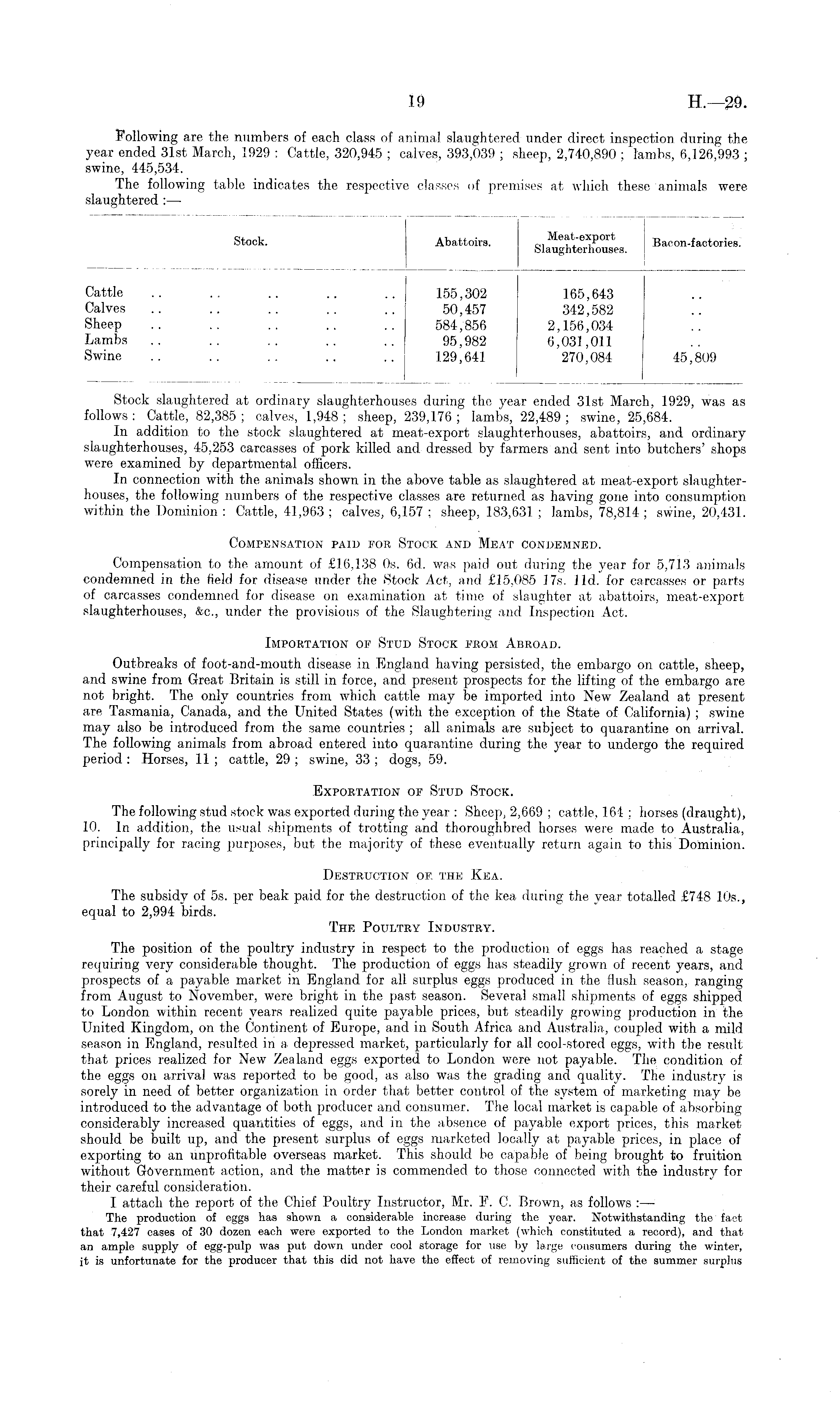 Stock slaughtered at ordinary slaughterhouses during the year ended 31st March, 1929, was as follows : Cattle, 82,385 ; calves, 1,948 ; sheep, 239,176 ; lambs, 22,489 ; swine, 25,684. In addition to the stock slaughtered at meat-export slaughterhouses, abattoirs, and ordinary slaughterhouses, 45,253 carcasses of pork killed and dressed by farmers and sent into butchers' shops were examined by departmental officers. In connection with the animals shown in the above table as slaughtered at meat-export slaughterhouses, the following numbers of the respective classes are returned as having gone into consumption within the Dominion: Cattle, 41,963; calves, 6,157 ; sheep, 183,631. ; lambs, 78,814; swine, 20,431. Compensation paid for Stock and Meat condemned. Compensation to the amount of £16,138 Os. 6d. was paid out during the year for 5,713 animals condemned in the field for disease under the Stock Act, and £15,085 17s. lid. for carcasses or parts of carcasses condemned for disease on examination at time of slaughter at abattoirs, meat-export slaughterhouses, &c., under the provisions of the Slaughtering and Inspection Act. Importation of Stud Stock from Abroad. Outbreaks of foot-and-mouth disease in England having persisted, the embargo on cattle, sheep, and swine from Great Britain is still in force, and present prospects for the lifting of the embargo are not bright. The only countries from which cattle may be imported into New Zealand at present are Tasmania, Canada, and the United States (with the exception of the State of California) ; swine may also be introduced from the same countries ; all animals are subject to quarantine on arrival. The following animals from abroad entered into quarantine during the year to undergo the required period : Horses, 11 ; cattle, 29 ; swine, 33 ; dogs, 59. Exportation of Stud Stock. The following stud stock was exported during the year : Sheep, 2,669 ; cattle, 164 ; horses (draught), 10. In addition, the usual shipments of trotting and thoroughbred horses were made to Australia, principally for racing purposes, but the majority of these eventually return again to this Dominion. Destruction of. the Kea. The subsidy of ss. per beak paid for the destruction of the kea during the year totalled £748 10s., equal to 2,994 birds. The Poultry Industry. The position of the poultry industry in respect to the production of eggs has reached a stage requiring very considerable thought. The production of eggs has steadily grown of recent years, and prospects of a payable market in England for all surplus eggs produced in the flush season, ranging from August to November, were bright in the past season. Several small shipments of eggs shipped to London within recent years realized quite payable prices, but steadily growing production in the United Kingdom, on the Continent of Europe, and in South Africa and Australia, coupled with a mild season in England, resulted in a depressed market, particularly for all cool-stored eggs, with the result that prices realized for New Zealand eggs exported to London were not payable. The condition of the eggs on arrival was reported to be good, as also was the grading and quality. The industry is sorely in need of better organization in order that better control of the system of marketing may be introduced to the advantage of both producer and consumer. The local market is capable of absorbing considerably increased quantities of eggs, and in the absence of payable export prices, this market should be built up, and the present surplus of eggs marketed locally at payable prices, in place of exporting to an unprofitable overseas market. This should be capable of being brought to fruition without Government action, and the matter is commended to those connected with the industry for their careful consideration. I attach the report of the Chief Poultry Instructor, Mr. F. C. Brown, as follows : — The production of eggs has shown a considerable increase during the year. Notwithstanding the fact that 7,427 cases of 30 dozen each were exported to the London market (which constituted a record), and that an ample supply of egg-pulp was put down under cool storage for use by large consumers during the winter, it is unfortunate for the producer that this did not have the effect of removing sufficient of the summer surplus