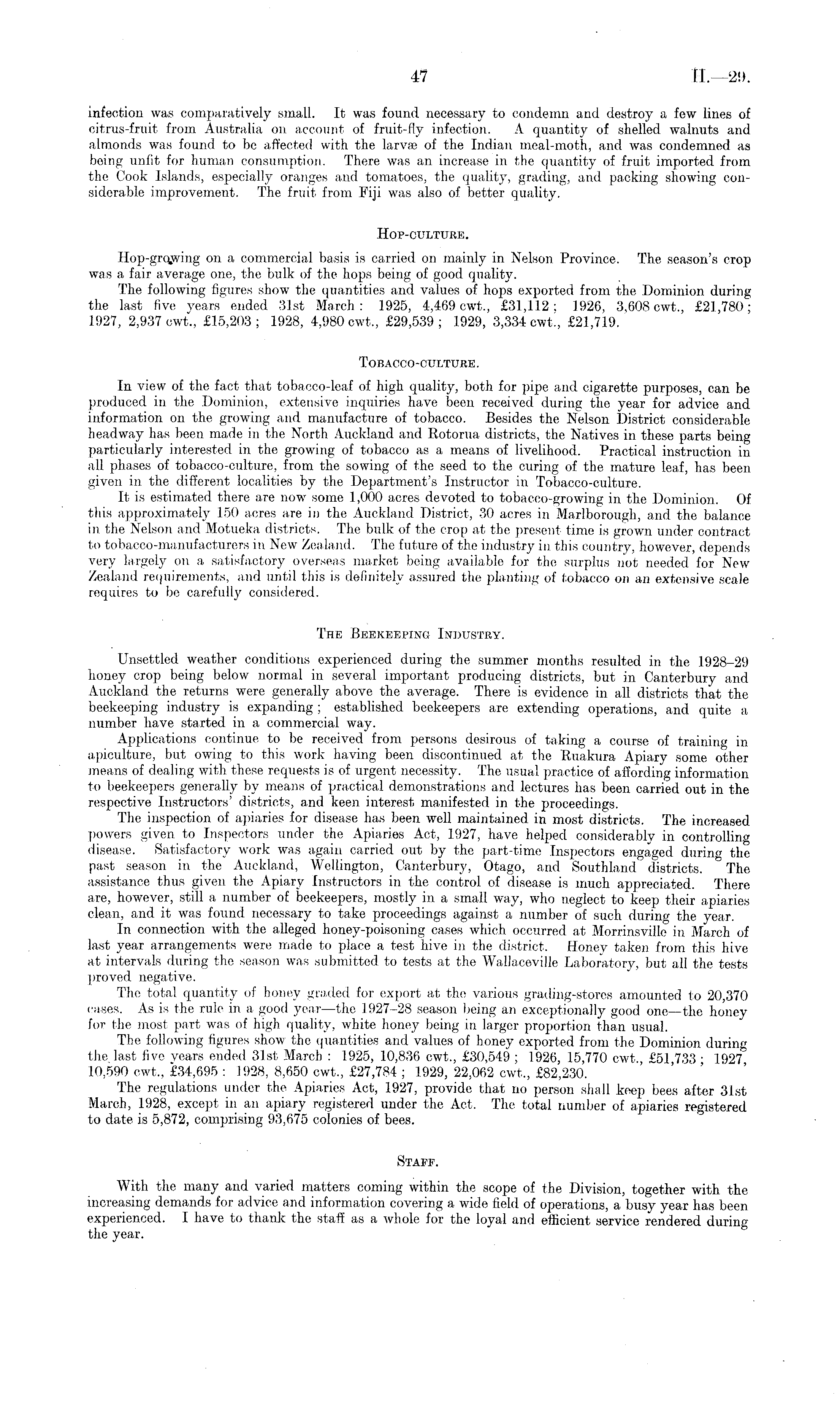 infection was comparatively small. It was found necessary to condemn and destroy a few lines of citrus-fruit, from Australia 011 account of fruit-fly infection. A quantity of shelled walnuts and almonds was found to be affected with the larvae of the Indian meal-moth, and was condemned as being unfit for human consumption. There was an increase in the quantity of fruit imported from the Cook Islands, especially oranges and tomatoes, the quality, grading, and packing showing considerable improvement. The fruit from Fiji was also of better quality. Hop-culture. Hop-grqjving on a commercial basis is carried on mainly in Nelson Province. The season's crop was a fair average one, the bulk of the hops being of good quality. The following figures show the quantities and values of hops exported from the Dominion during the last five years ended 31st March: 1925, 4,469 cwt., £31,112: 1926, 3,608 cwt., £21,780; 1927, 2,937 cwt., £15,203 ; 1928, 4,980 cwt., £29,539 ; 1929, 3,334 cwt, £21,719. Tobacco-culture . In view of the fact that tobacco-leaf of high quality, both for pipe and cigarette purposes, can be produced in the Dominion, extensive inquiries have been received during the year for advice and information on the growing and manufacture of tobacco. Besides the Nelson District considerable headway has been made in the North Auckland and Rotorua districts, the Natives in these parts being particularly interested in the growing of tobacco as a means of livelihood. Practical instruction in all phases of tobacco-culture, from the sowing of the seed to the curing of the mature leaf, has been given in the different localities by the Department's Instructor in Tobacco-culture. It is estimated there are now some 1,000 acres devoted to tobacco-growing in the Dominion. Of this approximately 150 acres are in the Auckland District, 30 acres in Marlborough, and the balance in the Nelson and Motueka districts. The bulk of the crop at the present time is grown under contract to tobacco-manufacturers in New Zealand. The future of the industry in this country, however, depends very largely on a satisfactory overseas market being available for the surplus not needed for New Zealand requirements, and until this is definitely assured the planting of tobacco on an extensive scale requires to be carefully considered. The Beekeeping Industry. Unsettled weather conditions experienced during the summer months resulted in the 1928-29 honey crop being below normal in several important producing districts, but in Canterbury and Auckland the returns were generally above the average. There is evidence in all districts that the beekeeping industry is expanding ; established beekeepers are extending operations, and quite a number have started in a commercial way. Applications continue to be received from persons desirous of taking a course of training in apiculture, but owing to this work having been discontinued at the Ruakura Apiary some other means of dealing with these requests is of urgent necessity. The usual practice of affording information to beekeepers generally by means of practical demonstrations and lectures has been carried out in the respective Instructors' districts, and keen interest manifested in the proceedings. The inspection of apiaries for disease has been well maintained in most districts. The increased powers given to Inspectors under the Apiaries Act, 1927, have helped considerably in controlling disease. Satisfactory work was again carried out by the part-time Inspectors engaged during the past season in the Auckland, Wellington, Canterbury, Otago, and Southland districts. The assistance thus given the Apiary Instructors in the control of disease is much appreciated. There are, however, still a number of beekeepers, mostly in a small way, who neglect to keep their apiaries clean, and it was found necessary to take proceedings against a number of such during the year. In connection with the alleged honey-poisoning cases which occurred at Morrinsville in March of last year arrangements were made to place a test hive in the district. Honey taken from this hive at intervals during the season was submitted to tests at the Wallaceville Laboratory, but all the tests proved negative. The total quantity of honey graded for export at the various grading-stores amounted to 20,370 cases. As is the rule in a good year —the 1927-28 season being an exceptionally good one—the honey for the most part was of high quality, white honey being in larger proportion than usual. The following figures show the quantities and values of honey exported from the Dominion during the last five vears ended 31st March : 1925, 10,836 cwt., £30,549 ; 1926, 15,770 cwt £51 733 • 1927 10,590 cwt, £34,695 ; 1928, 8,650 cwt, £27,784 ; 1929, 22,062 cwt, £82,230. The regulations under the Apiaries Act, 1927, provide that no person shall keep bees after 31st March, 1928, except in an apiary registered under the Act. The total number of apiaries registered to date is 5,872, comprising 93,675 colonies of bees. Staff. With the many and varied matters coming within the scope of the Division, together with the increasing demands for advice and information covering a wide field of operations, a busy year has been experienced. I have to thank the staff as a whole for the loyal and efficient service rendered during the year.