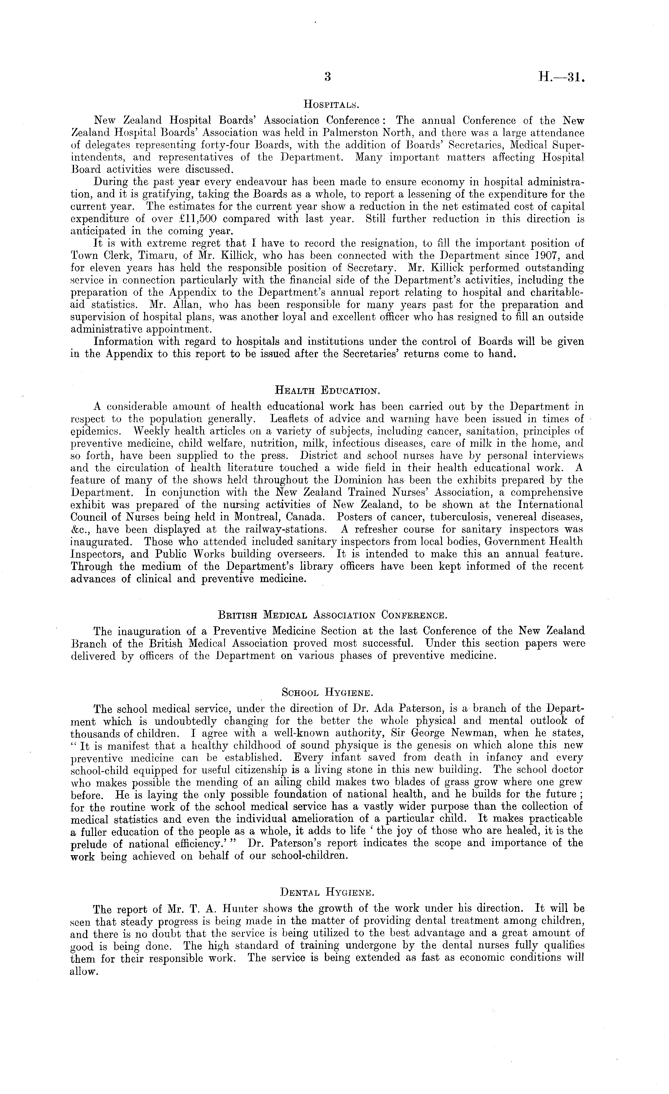 Hospitals. New Zealand Hospital Boards' Association Conference : The annual Conference of the New Zealand Hospital Boards' Association was held in Palmerston North, and there was a large attendance of delegates representing forty-four Boards, with the addition of Boards' Secretaries, Medical Superintendents, and representatives of the Department. Many important matters affecting Hospital Board activities were discussed. During the past year every endeavour has been made to ensure economy in hospital administration, and it is gratifying, taking the Boards as a whole, to report a lessening of the expenditure for the current year. .The estimates for the current year show a reduction in the net estimated cost of capital expenditure of over £11,500 compared with last year. Still further reduction in this direction is anticipated in the coming year. It is with extreme regret that I have to record the resignation, to fill the important position of Town Clerk, Timaru, of Mr. Killick, who has been connected with the Department since 1907, and for eleven years has hold the responsible position of Secretary. Mr. Killick performed outstanding service in connection particularly with the financial side of the Department's activities, including the preparation of the Appendix to the Department's annual report relating to hospital and charitableaid statistics. Mr. Allan, who has been responsible for many years past for the preparation and supervision of hospital plans, was another loyal and excellent officer who has resigned to fill an outside administrative appointment. Information with regard to hospitals and institutions under the control of Boards will be given in the Appendix to this report to be issued after the Secretaries' returns come to hand. Health Education. A considerable amount of health educational work has been carried out by the Department in respect to the population generally. Leaflets of advice and warning have been issued in times of epidemics. Weekly health articles on a variety of subjects, including cancer, sanitation, principles of preventive medicine, child welfare, nutrition, milk, infectious diseases, care of milk in the home, and so forth, have been supplied to the press. District and school nurses have by personal interviews and the circulation of health literature touched a wide field in their health educational work. A feature of many of the shows held throughout the Dominion has- been the exhibits prepared by the Department. In conjunction with the New Zealand Trained Nurses' Association, a comprehensive exhibit was prepared of the nursing activities of New Zealand, to be shown at the International Council of Nurses being held in Montreal, Canada. Posters of cancer, tuberculosis, venereal diseases, &c., have been displayed at the railway-stations. A refresher course for sanitary inspectors was inaugurated. Those who attended included sanitary inspectors from local bodies, Government Health Inspectors, and Public Works building overseers. It is intended to make this an annual feature. Through the medium of the Department's library officers have been kept informed of the recent advances of clinical and preventive medicine. British Medical Association Conference. The inauguration of a Preventive Medicine Section at the last Conference of the New Zealand Branch of the British Medical Association proved most successful. Under this section papers were delivered by officers of the Department on various phases of preventive medicine. School Hygiene. The school medical service, under the direction of Dr. Ada Paterson, is- a- branch of the Department which is undoubtedly changing for the better the whole physical and mental outlook of thousands of children. I agree with a well-known authority, Sir George Newman, when he states, "It is manifest that a healthy childhood of sound physique is the genesis on which alone this new preventive medicine can be established. Every infant saved from death in infancy and every school-child equipped for useful citizenship is a living stone in this new building. The school doctor who makes possible the mending of an ailing child makes two blades of grass grow where one grew before. He is laying the only possible foundation of national health, and he builds for the future ; for the routine work of the school medical service has a vastly wider purpose than the collection of medical statistics and even the individual amelioration of a particular child. It makes practicable a fuller education of the people as a whole, it adds to life ' the joy of those who are healed, it is the prelude of national efficiency.' " Dr. Paterson's report indicates the scope and importance of the work being achieved on behalf of our school-children. Dental Hygiene. The report of Mr. T. A. Hunter shows the growth of the work under his direction. It will be seen that steady progress is being made in the matter of providing dental treatment among children, and there is no doubt that the service is being utilized to the best advantage and a great amount of good is being done. The high standard of training undergone by the dental nurses fully qualifies them for their responsible work. The service is being extended as fast as economic conditions will allow.