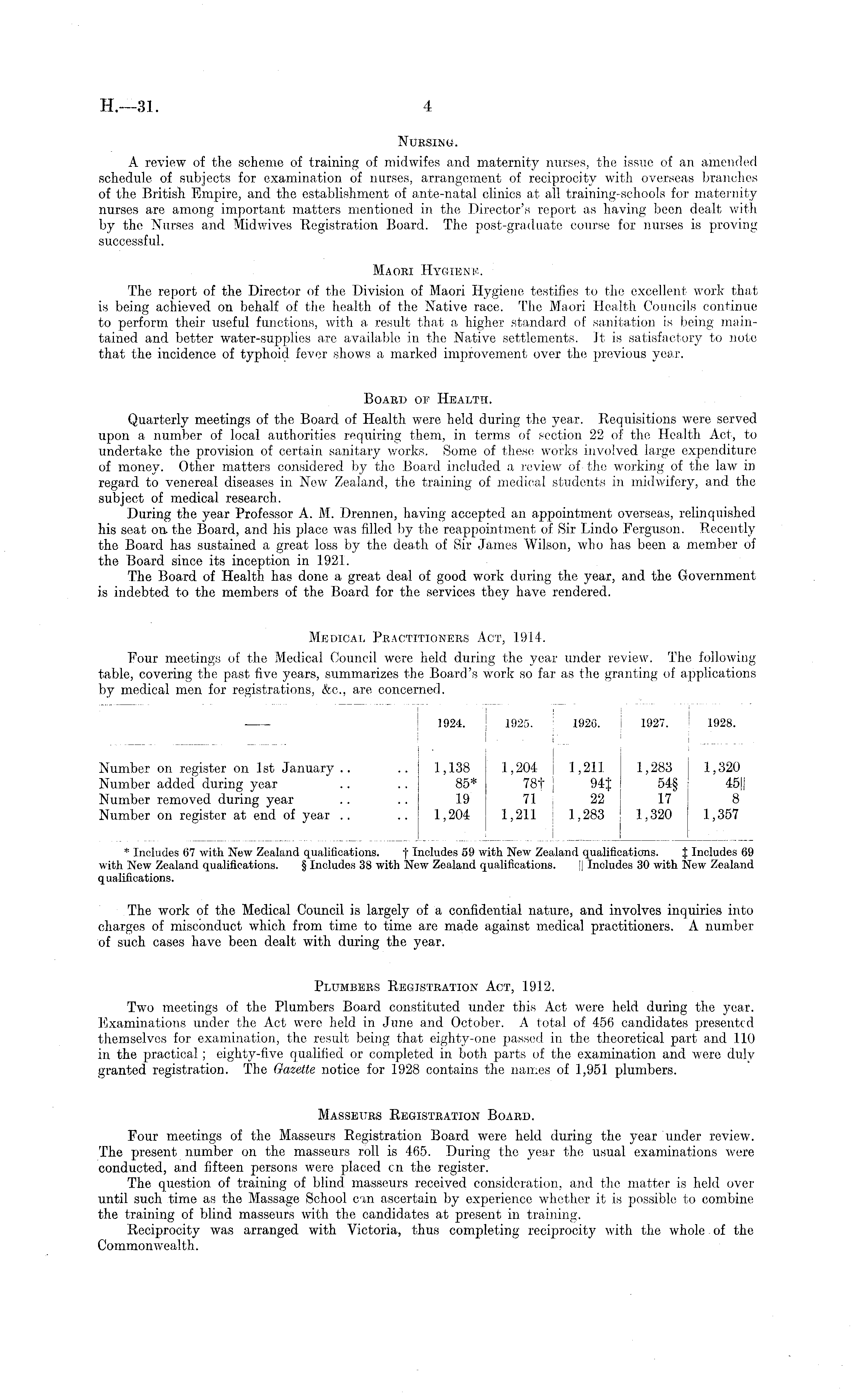Nursing. A review of the scheme of training of midwifes and maternity nurses, the issue of an amended schedule of subjects for examination of nurses, arrangement of reciprocity with overseas branches of the British Empire, and the establishment of ante-natal clinics at all training-schools for maternity nurses are among important matters mentioned in the Director's report as having been dealt with by the Nurses and Midwives Registration Board. The post-graduate course for nurses is proving successful. Maori Hygiene. The report of the Director of the Division of Maori Hygiene testifies to the excellent work that is being achieved on behalf of the health of the Native race. The Maori Health Councils continue to perform their useful functions, with a result that a higher standard of sanitation is being maintained and better water-supplies are available in the Native settlements. It is satisfactory to note that the incidence of typhoid fever shows a marked improvement over the previous year. Board of Health. Quarterly meetings of the Board of Health were held during the year. Requisitions were served upon a number of local authorities requiring them, in terms of section 22 of the Health Act, to undertake the provision of certain sanitary works. Some of these works involved large expenditure of money. Other matters considered by the Board included a review of the working of the law in regard to venereal diseases in New Zealand, the training of medical students in midwifery, and the subject of medical research. During the year Professor A. M. Drennen, having accepted an appointment overseas, relinquished his seat on. the Board, and his place was filled by the reappointment of Sir Lindo Ferguson. Recently the Board has sustained a great loss by the death of Sir James Wilson, who has been a member of the Board since its inception in 1921. The Board of Health has done a great deal of good work during the year, and the Government is indebted to the members of the Board for the services they have rendered. Medical Practitioners Act, 1914. Four meetings of the Medical Council were held during the year under review. The following table, covering the past five years, summarizes the Board's work so far as the granting of applications by medical men for registrations, &c., are concerned.