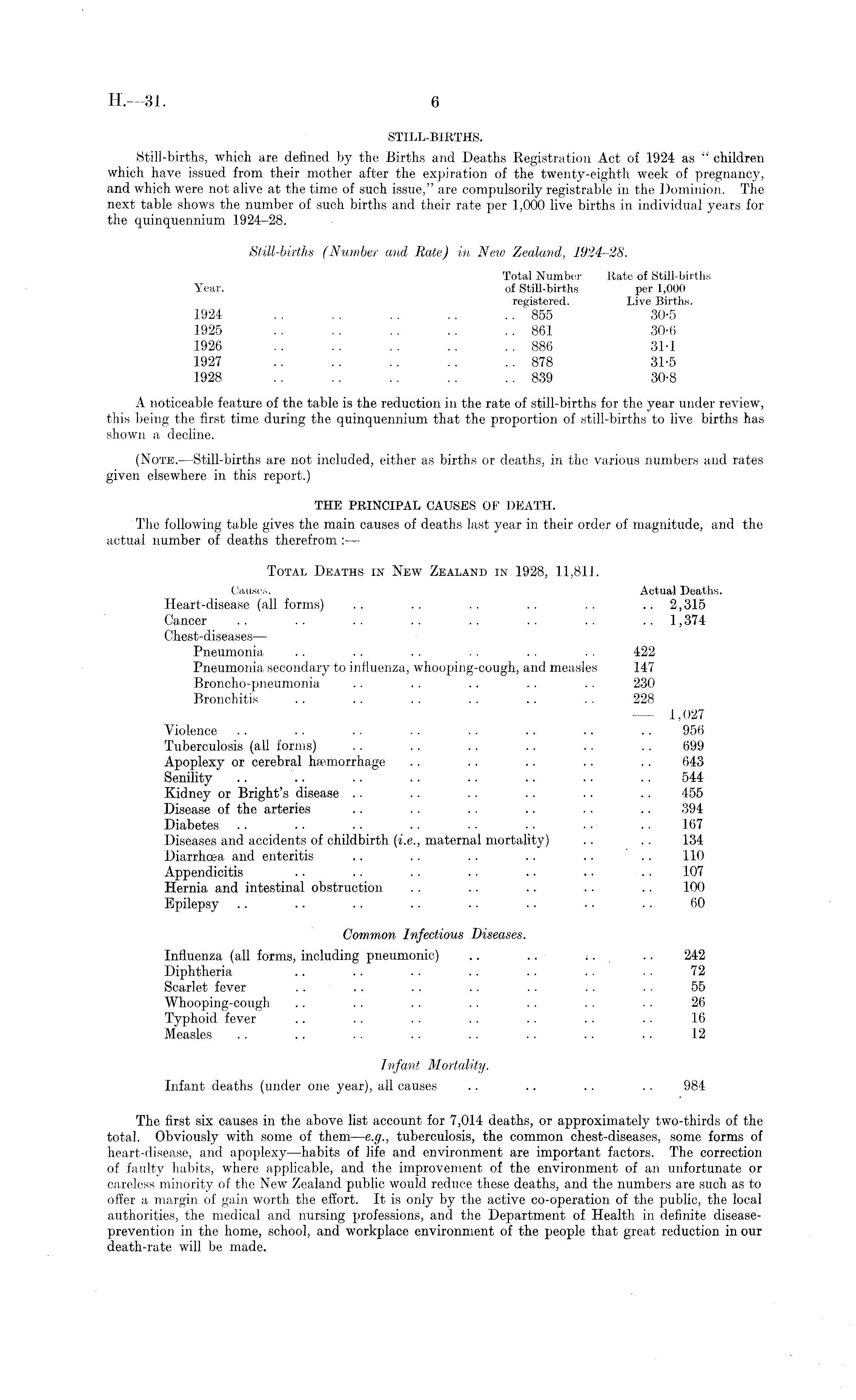 STILL-BIRTHS. Still-births, which are defined by the Births and Deaths Registration Act of 1924 as " children which have issued from their mother after the expiration of the twenty-eighth week of pregnancy, and which were not alive at the time of such issue," are compulsorily registrable in the Dominion. The next table shows the number of such births and their rate per 1,000 live births in individual years for the quinquennium 1924-28. Still-births (Number and Rate) in New Zealand, 1924-28. Total Number Rate of Still-births Year. of Still-births per 1,000 registered. Live Births. 1924 .. .. .. .. .. ' 855 30-5 1925 .. .. . . .. .. 861 30-6 1926 .. .. . . .. .. 886 31-1 1927 .. .. .. .. .. 878 31-5 1928 .. .. .. .. .. 839 30-8 A noticeable feature of the table is the reduction in the rate of still-births for the year under review, this being the first time during the quinquennium that the proportion of still-births to live births has shown a decline. (Note. —Still-births are not included, either as births or deaths, in the various numbers and rates given elsewhere in this report.) THE PRINCIPAL CAUSES OF DEATH. The following table gives the main causes of deaths last year in their order of magnitude, and the actual number of deaths therefrom :— Total Deaths in New Zealand in 1928, 11,811. Causes. Actual Deaths. Heart-disease (all forms) .. .. .. .. .. .. 2,315 Cancer . . . . . . . . . . . . . . 1,374 Chest-diseases — Pneumonia .. .. . . . . . . . . 422 Pneumonia secondary to influenza, whooping-cough, and measles 147 Broncho-pneumonia .. .. .. . . .. 230 Bronchitis .. .. .. . . .. . . 228 1,027 Violence . . .. . . . . . . .. .. .. 956 Tuberculosis (all forms) .. .. .. .. . . .. 699 Apoplexy or cerebral haemorrhage .. .. .. . . . . 643 Senility .. .. .. .. .. .. .. .. 544 Kidney or Bright's disease . . .. . . .. .. .. 455 Disease of the arteries .. . . .. .. .. .. 394 Diabetes .. .. .. .. . . . . . • . . 167 Diseases and accidents of childbirth (i.e., maternal mortality) . . . . 134 Diarrhoea and enteritis .. . . . . .. .. . . 110 Appendicitis .. .. .. . ■ . • . • . ■ 107 Hernia and intestinal obstruction . . .. .. . . .. 100 Epilepsy .. .. .. .. .. .. . • .. 60 Common Infectious Diseases. Influenza (all forms, including pneumonic) .. .. . .. 242 Diphtheria .. .. . . .. . . . . • ■ 72 Scarlet fever . . . . . . . . . . . . . . 55 Whooping-cough .. . . .. . . . . . . . . 26 Typhoid fever .. . . .. .. . . . . . . 16 Measles .. .. .. .. .. .. .. .. 12 Infant Mortality. Infant deaths (under one year), all causes .. .. . . . . 984 The first six causes in the above list account for 7,014 deaths, or approximately two-thirds of the total. Obviously with some of them —e.g., tuberculosis, the common chest-diseases, some forms of heart-disease, and apoplexy —habits of life and environment are important factors. The correction of faulty habits, where applicable, and the improvement of the environment of an unfortunate or careless minority of the New Zealand public would reduce these deaths, and the numbers are such as to offer a margin of gain worth the effort. It is only by the active co-operation of the public, the local authorities, the medical and nursing professions, and the Department of Health in definite diseaseprevention in the home, school, and workplace environment of the people that great reduction in our death-rate will be made.
