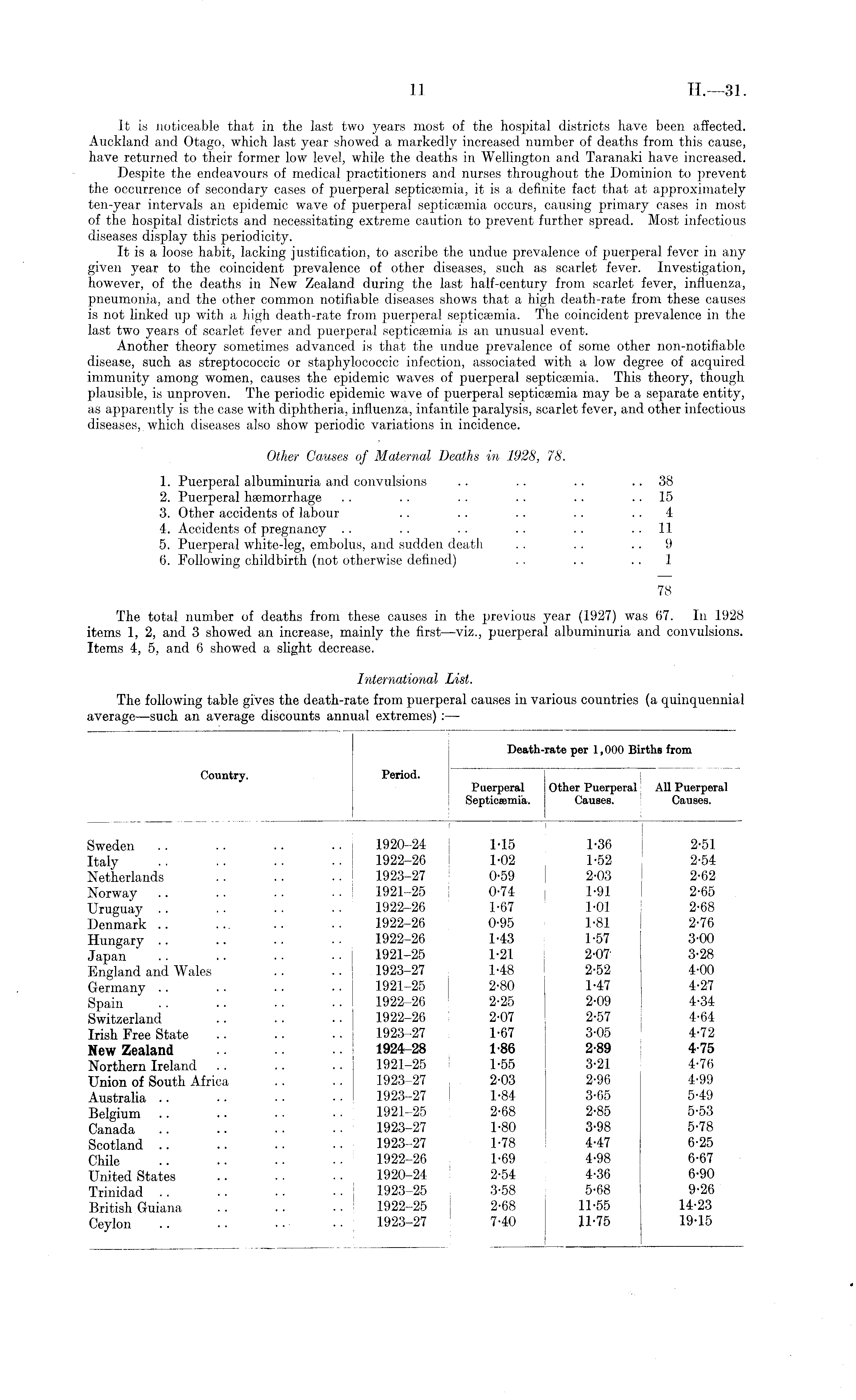It is noticeable that in the last two years most of the hospital districts have been affected. Auckland and Otago, which last year showed a markedly increased number of deaths from this cause, have returned to their former low level, while the deaths in Wellington and Taranaki have increased. Despite the endeavours of medical practitioners and nurses throughout the Dominion to prevent the occurrence of secondary cases of puerperal septicaemia, it is a definite fact that at approximately ten-year intervals an epidemic wave of puerperal septicaemia occurs, causing primary cases in most of the hospital districts and necessitating extreme caution to prevent further spread. Most infectious diseases display this periodicity. It is a loose habit, lacking justification, to ascribe the undue prevalence of puerperal fever in any given year to the coincident prevalence of other diseases, such as scarlet fever. Investigation, however, of the deaths in New Zealand during the last half-century from scarlet fever, influenza, pneumonia, and the other common notifiable diseases shows that a high death-rate from these causes is not linked up with a high death-rate from puerperal septicaemia. The coincident prevalence in the last two years of scarlet fever and puerperal septicemia is an unusual event. Another theory sometimes advanced is that the undue prevalence of some other non-notifiable disease, such as streptococcic or staphylococcic infection, associated with a low degree of acquired immunity among women, causes the epidemic waves of puerperal septicaemia. This theory, though plausible, is unproven. The periodic epidemic wave of puerperal septicaemia may be a separate entity, as apparently is the case with diphtheria, influenza, infantile paralysis, scarlet fever, and other infectious diseases,, which diseases also show periodic variations in incidence. Other Causes of Maternal Deaths in 1928, 78. 1. Puerperal albuminuria and convulsions .. .. .. 38 2. Puerperal haemorrhage . . . . . . . . .. 15 3. Other accidents of labour .. .. .. . . 4 4. Accidents of pregnancy .. . . . . .. . . 11 5. Puerperal white-leg, embolus, and sudden death . . .. 9 6. Following childbirth (not otherwise defined) . . . . .. 1 78 The total number of deaths from these causes in the previous year (1927) was 67. In 1928 items 1, 2, and 3 showed an increase, mainly the first —viz., puerperal albuminuria and convulsions. Items 4, 5, and 6 showed a slight decrease. International List. The following table gives the death-rate from puerperal causes in various countries (a quinquennial average—such an average discounts annual extremes) : —