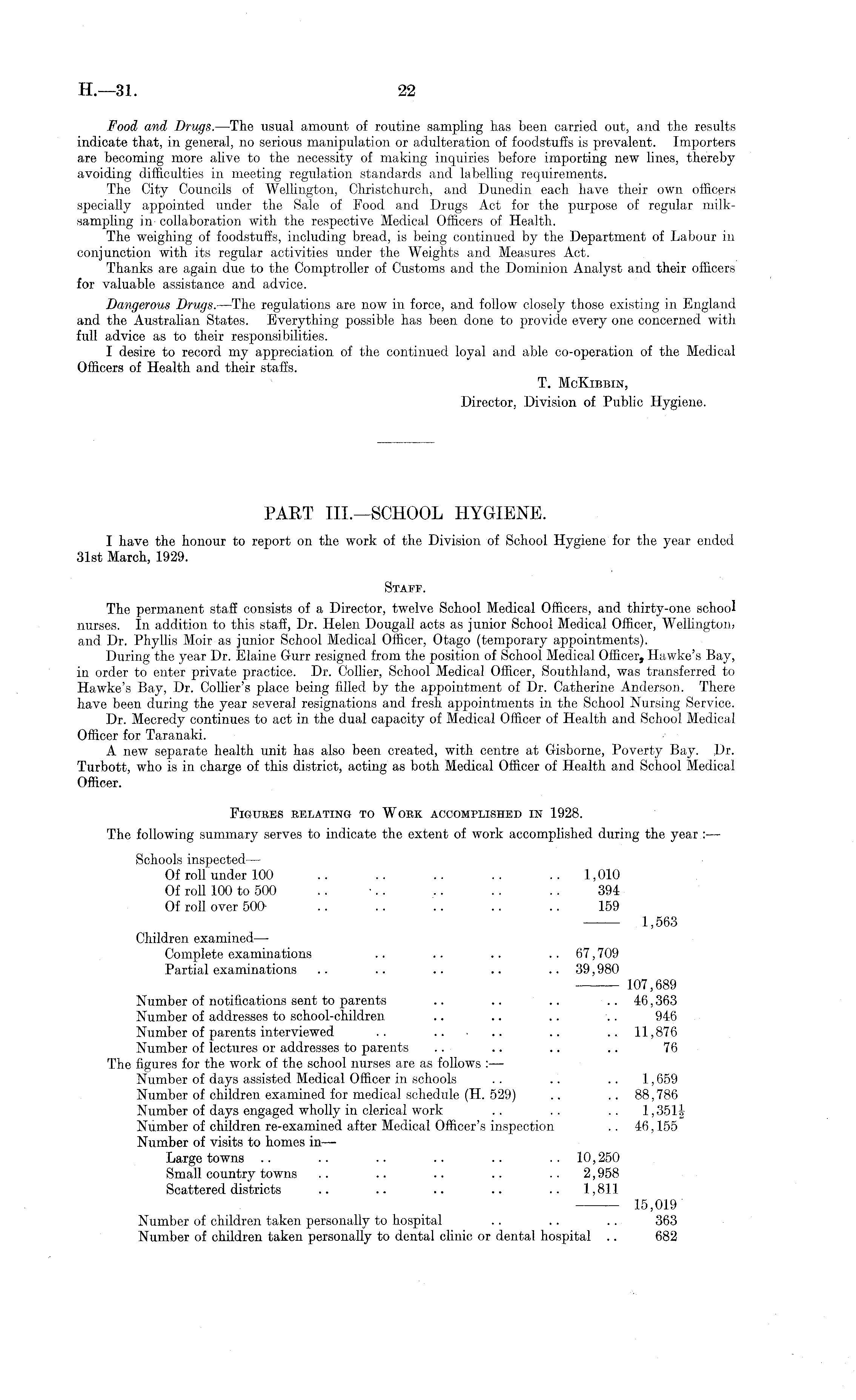 Food and Drugs.—The usual amount of routine sampling has been carried out, and the results indicate that, in general, no serious manipulation or adulteration of foodstuffs is prevalent. Importers are becoming more alive to the necessity of making inquiries before importing new lines, thereby avoiding difficulties in meeting regulation standards and labelling requirements. The City Councils of Wellington, Christchurch, and Dunedin each have their own officers specially appointed under the Sale of Food and Drugs Act for the purpose of regular milksampling in collaboration with the respective Medical Officers of Health. The weighing of foodstuffs, including bread, is being continued by the Department of Labour in conjunction with its regular activities under the Weights and Measures Act. Thanks are again due to the Comptroller of Customs and the Dominion Analyst and their officers for valuable assistance and advice. Dangerous Drugs. —The regulations are now in force, and follow closely those existing in England and the Australian States. Everything possible has been done to provide every one concerned with full advice as to their responsibilities. I desire to record my appreciation of the continued loyal and able co-operation of the Medical Officers of Health and their staffs. T. McKibbin, Director, Division of Public Hygiene. PART lII.—SCHOOL HYGIENE. I have the honour to report on the work of the Division of School Hygiene for the year ended 31st March, 1929. Staff. The permanent staff consists of a Director, twelve School Medical Officers, and thirty-one school nurses. In addition to this staff, Dr. Helen Dougall acts as junior School Medical Officer, Wellington, and Dr. Phyllis Moir as junior School Medical Officer, Otago (temporary appointments). During the year Dr. Elaine G-urr resigned from the position of School Medical Officer, Hawke's Bay, in order to enter private practice. Dr. Collier, School Medical Officer, Southland, was transferred to Hawke's Bay, Dr. Collier's place being filled by the appointment of Dr. Catherine Anderson. There have been during the year several resignations and fresh appointments in the School Nursing Service. Dr. Mecredy continues to act in the dual capacity of Medical Officer of Health and School Medical Officer for Taranaki. A new separate health unit has also been created, with centre at Gisborne, Poverty Bay. Dr. Turbott, who is in charge of this district, acting as both Medical Officer of Health and School Medical Officer. Figures relating to Work accomplished in 1928. The following summary serves to indicate the extent of work accomplished during the year : — Schools inspected — Of roll under 100 .. .. .. . . .. 1,010 Of roll 100 to 500 .. ■.. .. .. .. 394 Of roll over 500 1 .. .. .. .. .. 159 1,563 Children examined —- Complete examinations .. .. .. .. 67,709 Partial examinations .. .. .. .. .. 39,980 107,689 Number of notifications sent to parents .. .. .. .. 46,363 Number of addresses to school-children .. .. .. .. 946 Number of parents interviewed . . .. ■ .. .. 11,876 Number of lectures or addresses to parents .. .. .. .. 76 The figures for the work of the school nurses are as follows : — Number of days assisted Medical Officer in schools .. .. .. 1,659 Number of children examined for medical schedule (H. 529) .. .. 88,786 Number of days engaged wholly in clerical work .. .. .. 1,351| Number of children re-examined after Medical Officer's inspection .. 46,155 Number of visits to homes inLarge towns .. .. .. .. .. .. 10,250 Small country towns .. .. .. .. .. 2,958 Scattered districts .. .. .. .. .. 1,811 15,019 Number of children taken personally to hospital .. .. . . 363 Number of children taken personally to dental clinic or dental hospital .. 682