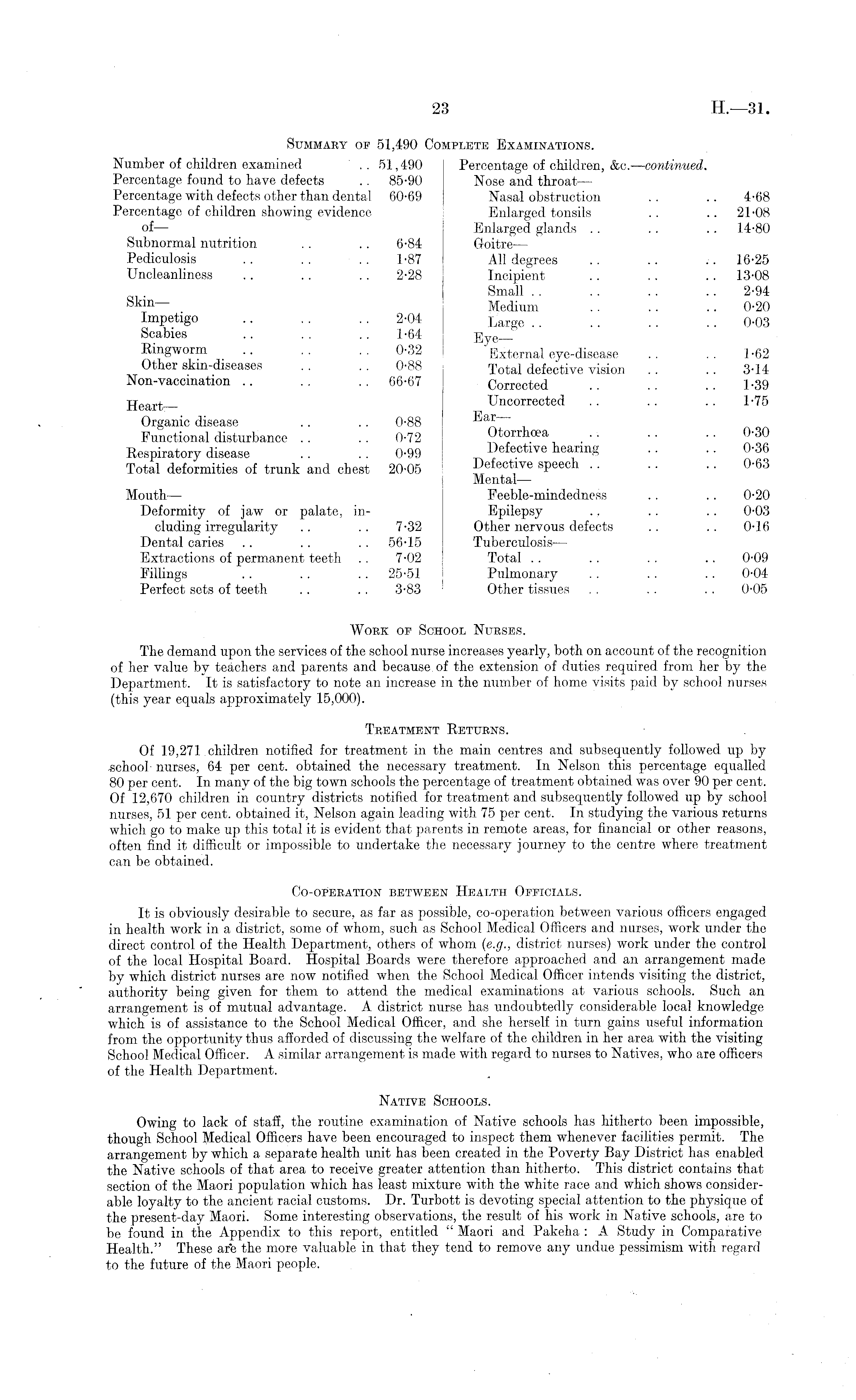Summary op 51,490 Complete Examinations. Number of children examined .. 51,490 Percentage of children, &c. —continued. Percentage found to have defects . . 85-90 Nose and throat — Percentage with defects other than dental 60-69 Nasal obstruction . . .. 4-68 Percentage of children showing evidence Enlarged tonsils . . .. 21-08 of —• Enlarged glands .. .. . . 14-80 Subnormal nutrition . . . . 6-84 Goitre— Pediculosis .. .. .. 1-87 All degrees .. .. .. 16-25 Uncleanliness .. . . . . 2-28 Incipient . . .. . . 13-08 Small . . . . .. .. 2-94 bkm Medium . . . . .. 0-20 Impetigo 2-04 Large 0 -03 Scabies .. .. .. 1-64 ]jy e Ringworm .. . . . . 0-32 External eye-disease . . .. 1-62 Other skin-diseases . . . . 0-88 Total defective vision . . . . 3-14 Non-vaccination .. .. .. 66-67 Corrected .. .. .. 1-39 jj ear t Uncorrected .. .. .. 1-75 Organic disease .. . . 0-88 Functional disturbance .. .. 0-72 Otorrhoea _.. .. .. 0-30 Respiratory disease .. .. 0-99 Defective hearing .. .. 0-36 Total deformities of trunk and chest 20-05 Defective speech . . . . . . 0-63 MentalMouth — Feeble-mindedness .. . . 0-20 Deformity of jaw or palate, in- Epilepsy .. . . .. 0-03 eluding irregularity .. . . 7-32 Other nervous defects .. . . 0-16 Dental caries .. .. . . 56-15 Tuberculosis— Extractions of permanent teeth . . 7-02 Total . . . . .. .. 0-09 Fillings .. . . .. 25-51 Pulmonary .. .. .. 0-04 Perfect sets of teeth .. .. 3-83 Other tissues .. .. .. 0-05 Work of School Nurses. The demand upon the services of the school nurse increases yearly, both on account of the recognition of her value by teachers and parents and because of the extension of duties required from her by the Department. It is satisfactory to note an increase in the number of home visits paid by school nurses (this year equals approximately 15,000). Treatment Returns. Of 19,271 children notified for treatment in the main centres and subsequently followed up by .school nurses, 64 per cent, obtained the necessary treatment. In Nelson this percentage equalled 80 per cent. In many of the big town schools the percentage of treatment obtained was over 90 per cent. Of 12,670 children in country districts notified for treatment and subsequently followed up by school nurses, 51 per cent, obtained it, Nelson again leading with 75 per cent. In studying the various returns which go to make up this total it is evident that parents in remote areas, for financial or other reasons, often find it difficult or impossible to undertake the necessary journey to the centre where treatment can be obtained. Co-operation between Health Officials. It is obviously desirable to secure, as far as possible, co-operation between various officers engaged in health work in a district, some of whom, such as School Medical Officers and nurses, work under the direct control of the Health Department, others of whom (e.g., district nurses) work under the control of the local Hospital Board. Hospital Boards were therefore approached and an arrangement made by which district nurses are now notified when the School Medical Officer intends visiting the district, authority being given for them to attend the medical examinations at various schools. Such an arrangement is of mutual advantage. A district nurse has undoubtedly considerable local knowledge which is of assistance to the School Medical Officer, and she herself in turn gains useful information from the opportunity thus afforded of discussing the welfare of the children in her area with the visiting School Medical Officer. A similar arrangement is made with regard to nurses to Natives, who are officers of the Health Department. Native Schools. Owing to lack of staff, the routine examination of Native schools has hitherto been impossible, though School Medical Officers have been encouraged to inspect them whenever facilities permit. The arrangement by which a separate health unit has been created in the Poverty Bay District has enabled the Native schools of that area to receive greater attention than hitherto. This district contains that section of the Maori population which has least mixture with the white race and which shows considerable loyalty to the ancient racial customs. Dr. Turbott is devoting special attention to the physique of the present-day Maori. Some interesting observations, the result of his work in Native schools, are to be found in the Appendix to this report, entitled " Maori and Pakeha : A Study in Comparative Health." These are the more valuable in that they tend to remove any undue pessimism with regard to the future of the Maori people.