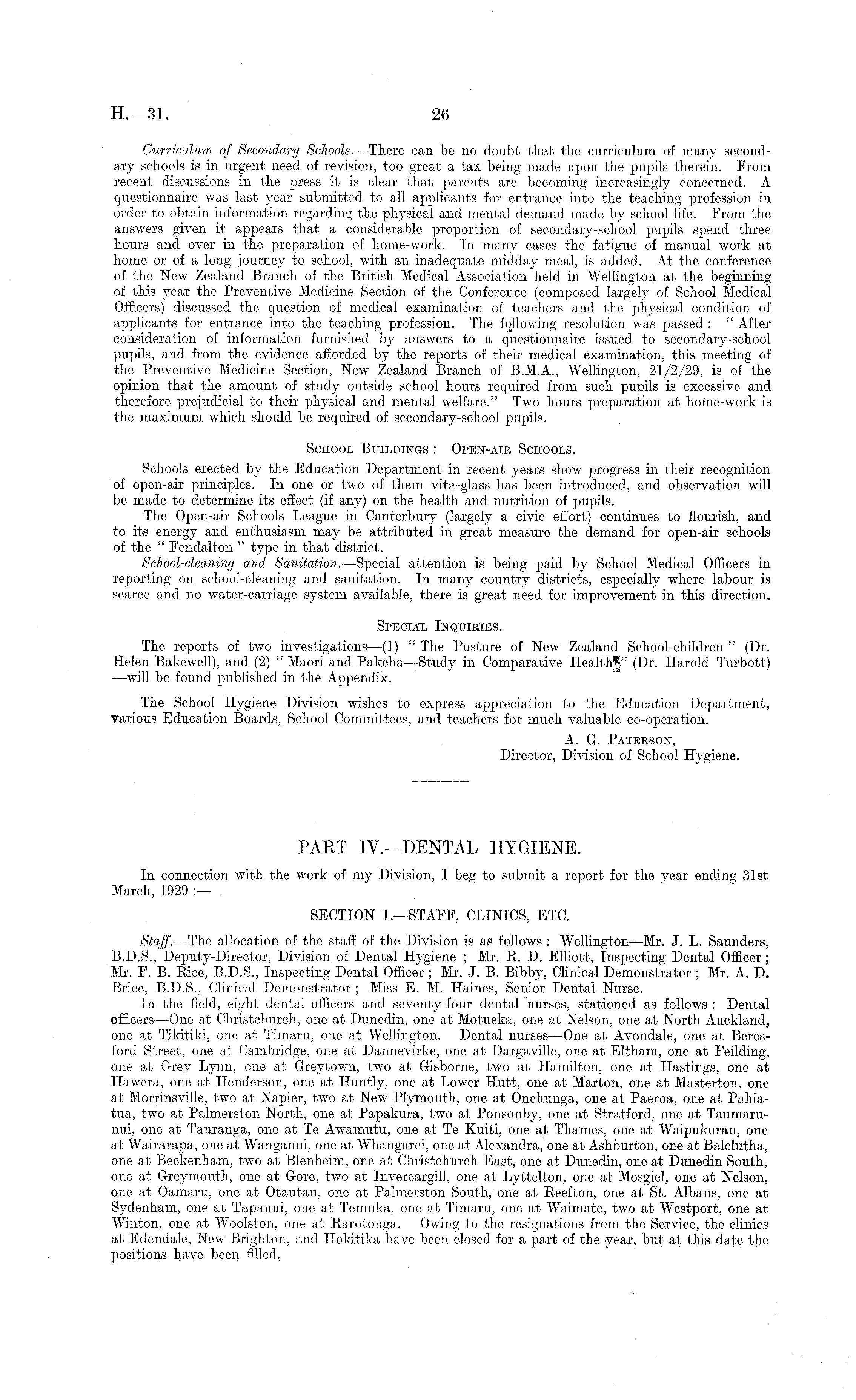 Curriculum of Secondary Schools. —There can be no doubt that the curriculum of many secondary schools is in urgent need of revision, too great a tax being made upon the pupils therein. From recent discussions in the press it is clear that parents are becoming increasingly concerned. A questionnaire was last year submitted to all applicants for entrance into the teaching profession in order to obtain information regarding the physical and mental demand made by school life. From the answers given it appears that a considerable proportion of secondary-school pupils spend three hours and over in the preparation of home-work. In many cases the fatigue of manual work at home or of a long journey to school, with an inadequate midday meal, is added. At the conference of the New Zealand Branch of the British Medical Association held in Wellington at the beginning of this year the Preventive Medicine Section of the Conference (composed largely of School Medical Officers) discussed the question of medical examination of teachers and the physical condition of applicants for entrance into the teaching profession. The following resolution was passed : " After consideration of information furnished by answers to a questionnaire issued to secondary-school pupils, and from the evidence afforded by the reports of their medical examination, this meeting of the Preventive Medicine Section, New Zealand Branch of 8.M.A., Wellington, 21/2/29, is of the opinion that the amount of study outside school hours required from such pupils is excessive and therefore prejudicial to their physical and mental welfare." Two hours preparation at home-work is the maximum which should be required of secondary-school pupils. School Buildings : Open-air Schools. Schools erected by the Education Department in recent years show progress in their recognition of open-air principles. In one or two of them vita-glass has been introduced, and observation will be made to determine its effect (if any) on the health and nutrition of pupils. The Open-air Schools League in Canterbury (largely a civic effort) continues to flourish, and to its energy and enthusiasm may be attributed in great measure the demand for open-air schools of the " Fendalton " type in that district. School-cleaning and Sanitation.—Special attention is being paid by School Medical Officers in reporting on school-cleaning and sanitation. In many country districts, especially where labour is scarce and no water-carriage system available, there is great need for improvement in this direction. Specia'l Inquiries. The reports of two investigations—(l) " The Posture of New Zealand School-children " (Dr. Helen Bakewell), and (2) " Maori and Pakeha—Study in Comparative Health!" (Dr. Harold Turbott) -—will be found published in the Appendix. The School Hygiene Division wishes to express appreciation to the Education Department, various Education Boards, School Committees, and teachers for much valuable co-operation. A. G. Paterson, Director, Division of School Hygiene. PABT IV.—DENTAL HYGIENE. In connection with the work of my Division, I beg to submit a report for the year ending 31st March, 1929 : — SECTION I.—STAFF, CLINICS, ETC. Staff. —The allocation of the staff of the Division is as follows : Wellington—Mr. J. L. Saunders, 8.D.5., Deputy-Director, Division of Dental Hygiene ; Mr. B. D. Elliott, Inspecting Dental Officer; Mr. F. B. Rice, 8.D.5., Inspecting Dental Officer ; Mr. J. B. Bibby, Clinical Demonstrator ; Mr. A. D. Brice, 8.D.5., Clinical Demonstrator ; Miss E. M. Haines, Senior Dental Nurse. In the field, eight dental officers and seventy-four dental nurses, stationed as follows : Dental officers —One at Christchurch, one at Dunedin, one at Motueka, one at Nelson, one at North Auckland, one at Tikitiki, one at Tiinaru, one a,t Wellington. Dental nurses —One at Avondale, one at Beresford Street, one at Cambridge, one at Dannevirke, one at Dargaville, one at Eltham, one at Feilding, one at Grey Lynn, one at Grey town, two at Gisborne, two at Hamilton, one at Hastings, one at Hawera, one at Henderson, one at Huntly, one at Lower Hutt, one at Marton, one at Masterton, one at Morrinsville, two at Napier, two at New Plymouth, one at Onehunga, one at Paeroa, one at Pahiatua, two at Palmerston North, one at Papakura, two at Ponsonby, one at Stratford, one at Taumarunui, one at Tauranga, one at Te Awamutu, one at Te Kuiti, one at Thames, one at Waipukurau, one at Wairarapa, one at Wanganui, one at Whangarei, one at Alexandra, one at Ashburton, one at Balclutha, one at Beckenham, two at Blenheim, one at Christchurch East, one at Dunedin, one at Dunedin South, one at Greymouth, one at Gore, two at Invercargill, one at Lyttelton, one at Mosgiel, one at Nelson, one at Oamaru, one at Otautau, one at Palmerston South, one at Reefton, one at St. Albans, one at Sydenham, one at Tapanui, one at Temuka, one at Timaru, one at Waimate, two at Westport, one at Winton, one at Woolston, one at Rarotonga. Owing to the resignations from the Service, the clinics at Edendale, New Brighton, and Hokitika have been closed for a part of the year, but at this date the positions have been filled,