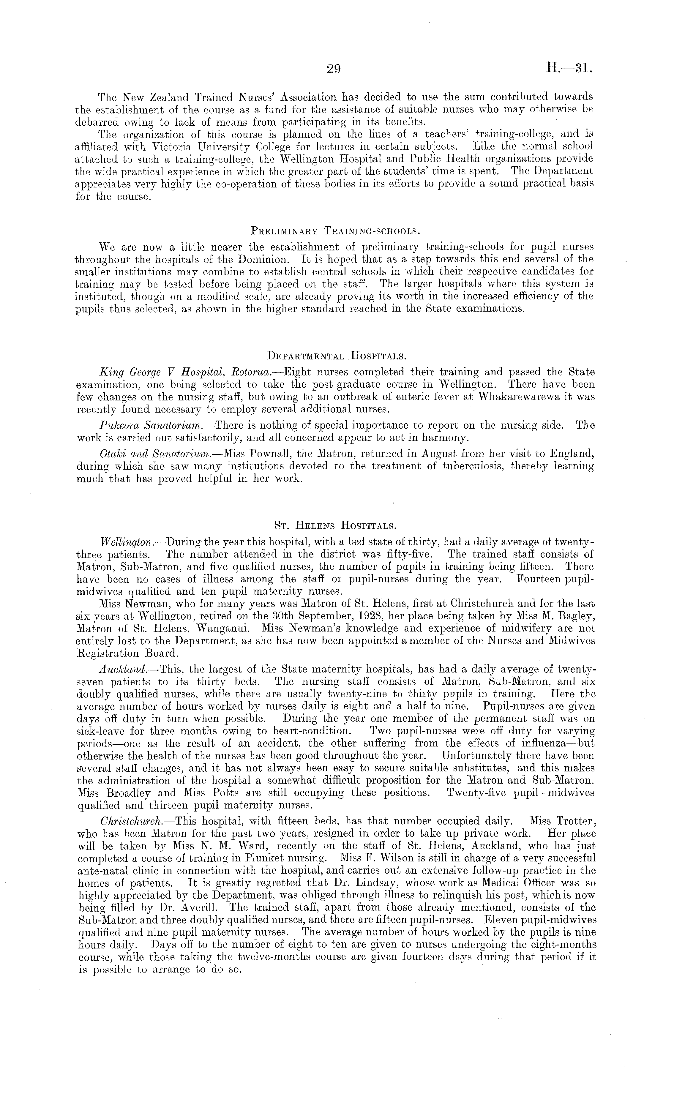 The New Zealand Trained Nurses' Association lias decided to use the sum contributed towards the establishment of the course as a fund for the assistance of suitable nurses who may otherwise be debarred owing to lack of means from participating in its benefits. The organization of this course is planned on the lines of a teachers' training-college, and is affiliated with Victoria University College for lectures in certain subjects. Like the normal school attached to such a training-college, the Wellington Hospital and Public Health organizations provide the wide practical experience in which the greater part of the students' time is spent. The Department appreciates very highly the co-operation of these bodies in its efforts to provide a sound practical basis for the course. Preliminary Training-schools. We are now a little nearer the establishment of preliminary training-schools for pupil nurses throughout the hospitals of the Dominion. It is hoped that as a step towards this end several of the smaller institutions may combine to establish central schools in which their respective candidates for training may be tested before being placed on the staff. The larger hospitals where this system is instituted, though on a modified scale, are already proving its worth in the increased efficiency of the pupils thus selected, as shown in the higher standard reached in the State examinations. Departmental Hospitals. King George V Hospital, Rotorua. —Eight nurses completed their training and passed the State examination, one being selected to take the post-graduate course in Wellington. There have been few changes on the nursing staff, but owing to an outbreak of enteric fever at Whakarewarewa it was recently found necessary to employ several additional nurses. Pukeora Sanatorium.—There is nothing of special importance to report on the nursing side. The work is carried out satisfactorily, and all concerned appear to act in harmony. Otaki and Sanatorium. —Miss Pownall, the Matron, returned in August from her visit to England, during which she saw many institutions devoted to the treatment of tuberculosis, thereby learning much that has proved helpful in her work. St. Helens Hospitals. Wellington. —During the year this hospital, with a bed state of thirty, had a daily average of twentythree patients. The number attended in the district was fifty-five. The trained staff consists of Matron, Sub-Matron, and five qualified nurses, the number of pupils in training being fifteen. There have been no cases of illness among the staff or pupil-nurses during the year. Fourteen pupi.l- - qualified and ten pupil maternity nurses. Miss Newman, who for many years was Matron of St. Helens, first at Christchurch and for the last six years at Wellington, retired on the 30th September, 1928, her place being taken by Miss M. Bagley, Matron of St. Helens, Wanganui. Miss Newman's knowledge and experience of midwifery are not entirely lost to the Department, as she has now been appointed a member of the Nurses and Midwives Registration Board. Auckland.—This, the largest of the State maternity hospitals, has had a daily average of twentyseven patients to its thirty beds. The nursing staff consists of Matron, Sub-Matron, and six doubly qualified nurses, while there are usually twenty-nine to thirty pupils in training. Here the average number of hours worked by nurses daily is eight and a half to nine. Pupil-nurses are given days of! duty in turn when possible. During the year one member of the permanent staff was on sick-leave for three months owing to heart-condition. Two pupil-nurses were off duty for varying periods —one as the result of an accident, the other suffering from the effects of influenza—but otherwise the health of the nurses has been good throughout the year. Unfortunately there have been several staff changes, and it has not always been easy to secure suitable substitutes, and this makes the administration of the hospital a somewhat difficult proposition for the Matron and Sub-Matron. Miss Broadley and Miss Potts are still occupying these positions. Twenty-five pupil - midwives qualified and thirteen pupil maternity nurses. Christchurch. —This hospital, with fifteen beds, has that number occupied daily. Miss Trotter, who has been Matron for the past two years, resigned in order to take up private work. Her place will be taken by Miss N. M. Ward, recently on the staff of St. Helens, Auckland, who has iust completed a course of training in Plunket nursing. Miss F. Wilson is still in charge of a very successful ante-natal clinic in connection with the hospital, and carries out an extensive follow-up practice in the homes of patients. It is greatly regretted that Dr. Lindsay, whose work as Medical Officer was so highly appreciated by the Department, was obliged through illness to relinquish his post, which is now being filled by Dr. Averill. The trained staff, apart from those already mentioned, consists of the Sub-Matron and three doubly qualified nurses, and there are fifteen pupil-nurses. Eleven pupil-midwives qualified and nine pupil maternity nurses. The average number of hours worked by the pupils is nine hours daily. Days off to the number of eight to ten are given to nurses undergoing the eight-months course, while those taking the twelve-months course are given fourteen days during that period if it is possible to arrange to do so.