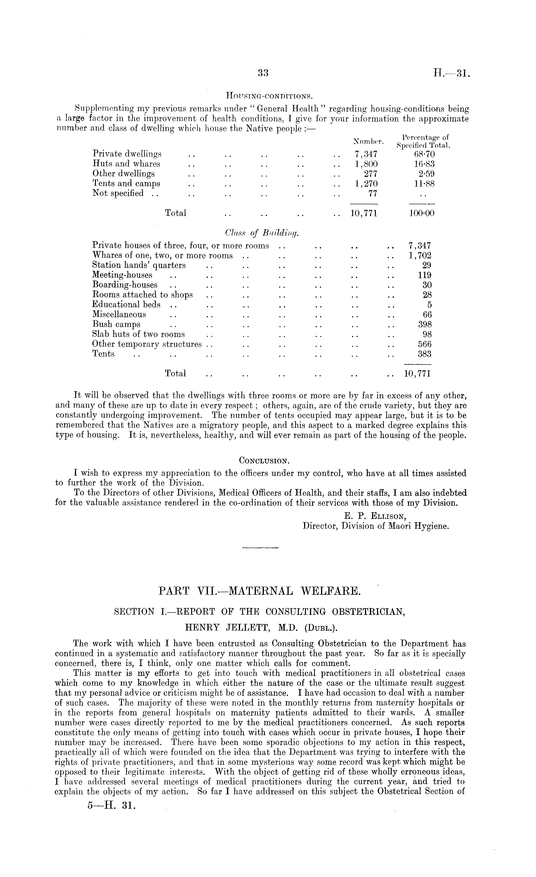 Housing-conditions. Supplementing my previous remarks under " General Health." regarding housing-conditions being a large factor in the improvement of health conditions, I give for your information the approximate number and class of dwelling which house the Native people : — -i Percentage of INlimber. gpecifled To ta]. Private dwellings .. .. .. .. .. 7,347 68-70 Huts and whares .. .. .. .. .. 1,800 16-83 Other dwellings .. .. . . . . . . 277 2-59 Tents and camps .. .. .. .. .. 1,270 11-88 Not specified .. .. .. .. .. .. 77 Total .. .. .. .. 10,771 100-00 Class of Building. Private houses of three, four, or more rooms .. .. .. .. 7,347 Whares of one, two, or more rooms .. .. .. .. .. 1,702 Station hands' quarters .. .. .. .. .. .. 29 Meeting-houses .. .. .. .. .. .. .. 119 Boarding-houses .. .. . . .. .. .. .. 30 Rooms attached to shops .. .. .. .. .. .. 28 Educational beds .. .. .. .. .. .. .. 5 Miscellaneous .. .. .. .. .. .. .. 66 Bush camps .. .. .. .. .. .. .. 398 Slab huts of two rooms .. .. . . .. .. .. 98 Other temporary structures . . . . . . .. .. .. 566 Tents .. " .. .. .. .. .. .. .. 383 Total .. .. .. .. .. .. 10,771 It will be observed that the dwellings with three rooms or more are by far in excess of any other, and many of these are up to date in every respect; others, again, are of the crude variety, but they are constantly undergoing improvement. The number of tents occupied may appear large, but it is to be remembered that the Natives are a migratory people, and this aspect to a marked degree explains this type of housing. It is, nevertheless, healthy, and will ever remain as part of the housing of the people. Conclusion. I wish to express my appreciation to the officers under my control, who have at all times assisted to further the work of the Division. To the Directors of other Divisions, Medical Officers of Health, and their staffs, I am also indebted for the valuable assistance rendered in the co-ordination of their services with those of my Division. E. P. Ellison, Director, Division of Maori Hygiene. PART VII.—MATERNAL WELFARE. SECTION I.—REPORT OF THE CONSULTING OBSTETRICIAN, HENRY JELLETT, M.D. (DUBL.). The work with which I have been entrusted as Consulting Obstetrician to the Department has continued in a systematic and satisfactory manner throughout the past year. So far as it is specially concerned, there is, I think, only one matter which calls for comment. This matter is my efforts to get into touch with medical practitioners in all obstetrical cases which come to my knowledge in which either the nature of the case or the ultimate result suggest that my personal advice or criticism might be of assistance. I have had occasion to deal with a number of such cases. The majority of these were noted in the monthly returns from maternity hospitals or in the reports from general hospitals on maternity patients admitted to their wards. A smaller number were cases directly reported to me by the medical practitioners concerned. As such reports constitute the only means of getting into touch with cases which occur in private houses, I hope their number may be increased. There have been some sporadic objections to my action in this respect, practically all of which were founded on the idea that the Department was trying to interfere with the rights of private practitioners, and that in some mysterious way some record was kept which might be opposed to their legitimate interests. With the object of getting rid of these wholly erroneous ideas, I have addressed several meetings of medical practitioners during the current year, and tried to explain the objects of my action. So far I have addressed on this subject the Obstetrical Section of