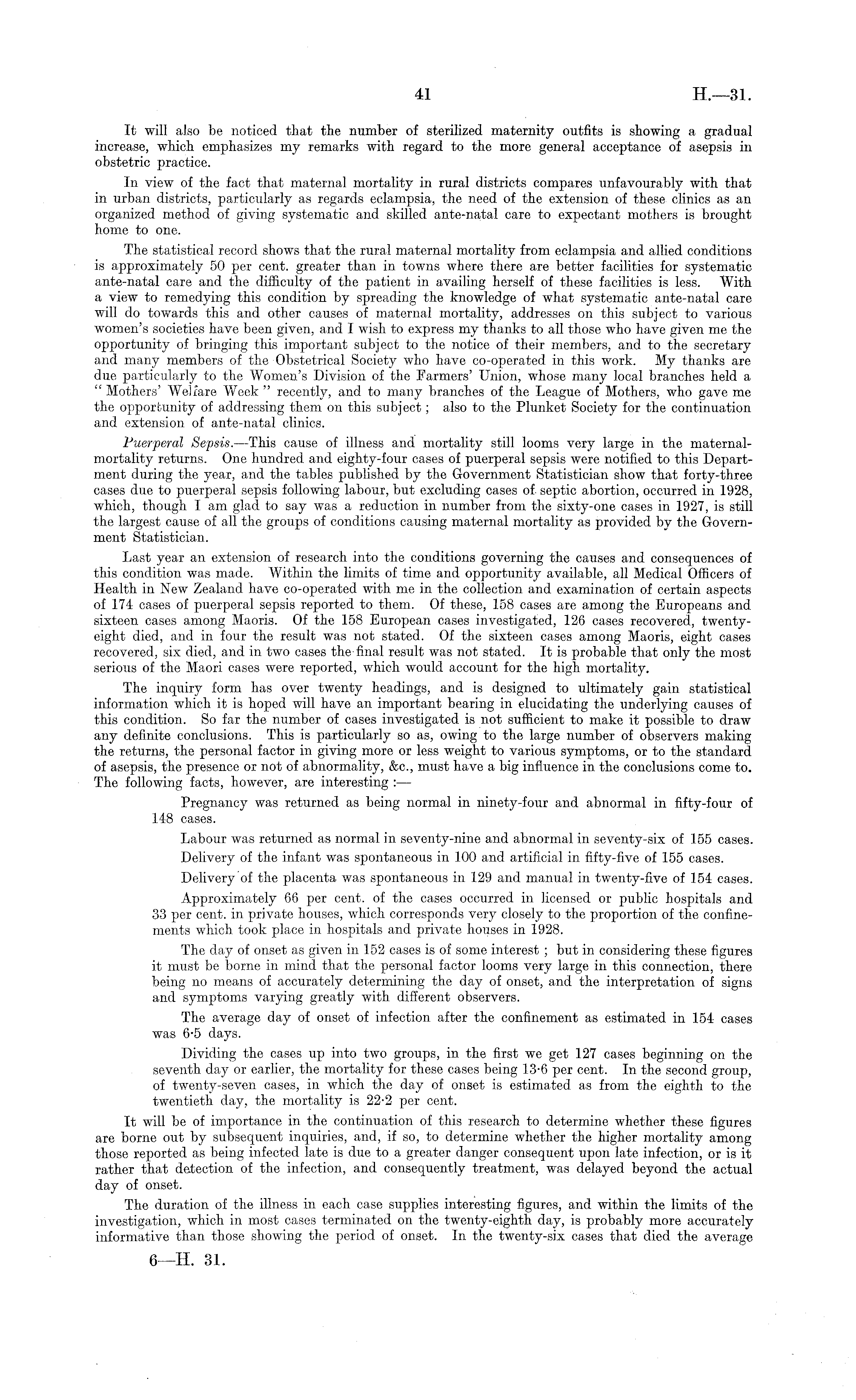 It will also be noticed that tie number of sterilized maternity outfits is showing a gradual increase, which emphasizes my remarks with regard to the more general acceptance of asepsis in obstetric practice. In view of the fact that maternal mortality in rural districts compares unfavourably with that in urban districts, particularly as regards eclampsia, the need of the extension of these clinics as an organized method of giving systematic and skilled ante-natal care to expectant mothers is brought home to one. The statistical record shows that the rural maternal mortality from eclampsia and allied conditions is approximately 50 per cent, greater than in towns where there are better facilities for systematic ante-natal care and the difficulty of the patient in availing herself of these facilities is less. With a view to remedying this condition by spreading the knowledge of what systematic ante-natal care will do towards this and other causes of maternal mortality, addresses on this subject to various women's societies have been given, and I wish to express my thanks to all those who have given me the opportunity of bringing this important subject to the notice of their members, and to the secretary and many members of the Obstetrical Society who have co-operated in this work. My thanks are due particularly to the Women's Division of the Farmers' Union, whose many local branches held a " Mothers' Welfare Week " recently, and to many branches of the League of Mothers, who gave me the opportunity of addressing them on this subject; also to the Plunket Society for the continuation and extension of ante-natal clinics. Puerperal Sepsis. —This cause of illness and mortality still looms very large in the maternalmortality returns. One hundred and eighty-four cases of puerperal sepsis were notified to this Department during the year, and the tables published by the Government Statistician show that forty-three cases due to puerperal sepsis following labour, but excluding cases of septic abortion, occurred in 1928, which, though I am glad to say was a reduction in number from the sixty-one cases in 1927, is still the largest cause of all the groups of conditions causing maternal mortality as provided by the Government Statistician. Last year an extension of research into the conditions governing the causes and consequences of this condition was made. Within the limits of time and opportunity available, all Medical Officers of Health in New Zealand have co-operated with me in the collection and examination of certain aspects of 174 cases of puerperal sepsis reported to them. Of these, 158 cases are among the Europeans and sixteen cases among Maoris. Of the 158 European cases investigated, 126 cases recovered, twentyeight died, and in four the result was not stated. Of the sixteen cases among Maoris, eight cases recovered, six died, and in two cases the final result was not stated. It is probable that only the most serious of the Maori cases were reported, which would account for the high mortality. The inquiry form has over twenty headings, and is designed to ultimately gain statistical information which it is hoped will have an important bearing in elucidating the underlying causes of this condition. So far the number of cases investigated is not sufficient to make it possible to draw any definite conclusions. This is particularly so as, owing to the large number of observers making the returns, the personal factor in giving more or less weight to various symptoms, or to the standard of asepsis, the presence or not of abnormality, &c., must have a big influence in the conclusions come to. The following facts, however, are interesting : — Pregnancy was returned as being normal in ninety-four and abnormal in fifty-four of 148 cases. Labour was returned as normal in seventy-nine and abnormal in seventy-six of 155 cases. Delivery of the infant was spontaneous in 100 and artificial in fifty-five of 155 cases. Delivery of the placenta was spontaneous in 129 and manual in twenty-five of 154 cases. Approximately 66 per cent, of the cases occurred in licensed or public hospitals and 33 per cent, in private houses, which corresponds very closely to the proportion of the confinements which took place in hospitals and private houses in 1928. The day of onset as given in 152 cases is of some interest ; but in considering these figures it must be borne in mind that the personal factor looms very large in this connection, there being no means of accurately determining the day of onset, and the interpretation of signs and symptoms varying greatly with different observers. The average day of onset of infection after the confinement as estimated in 154 cases was 6-5 days. Dividing the cases up into two groups, in the first we get 127 cases beginning on the seventh day or earlier, the mortality for these cases being 13-6 per cent. In the second group, of twenty-seven cases, in which the day of onset is estimated as from the eighth to the twentieth day, the mortality is 22-2 per cent. It will be of importance in the continuation of this research to determine whether these figures are borne out by subsequent inquiries, and, if so, to determine whether the higher mortality among those reported as being infected late is due to a greater danger consequent upon late infection, or is it rather that detection of the infection, and consequently treatment, was delayed beyond the actual day of onset. The duration of the illness in each case supplies interesting figures, and within the limits of the investigation, which in most cases terminated on the twenty-eighth day, is probably more accurately informative than those showing the period of onset. In the twenty-six cases that died the average