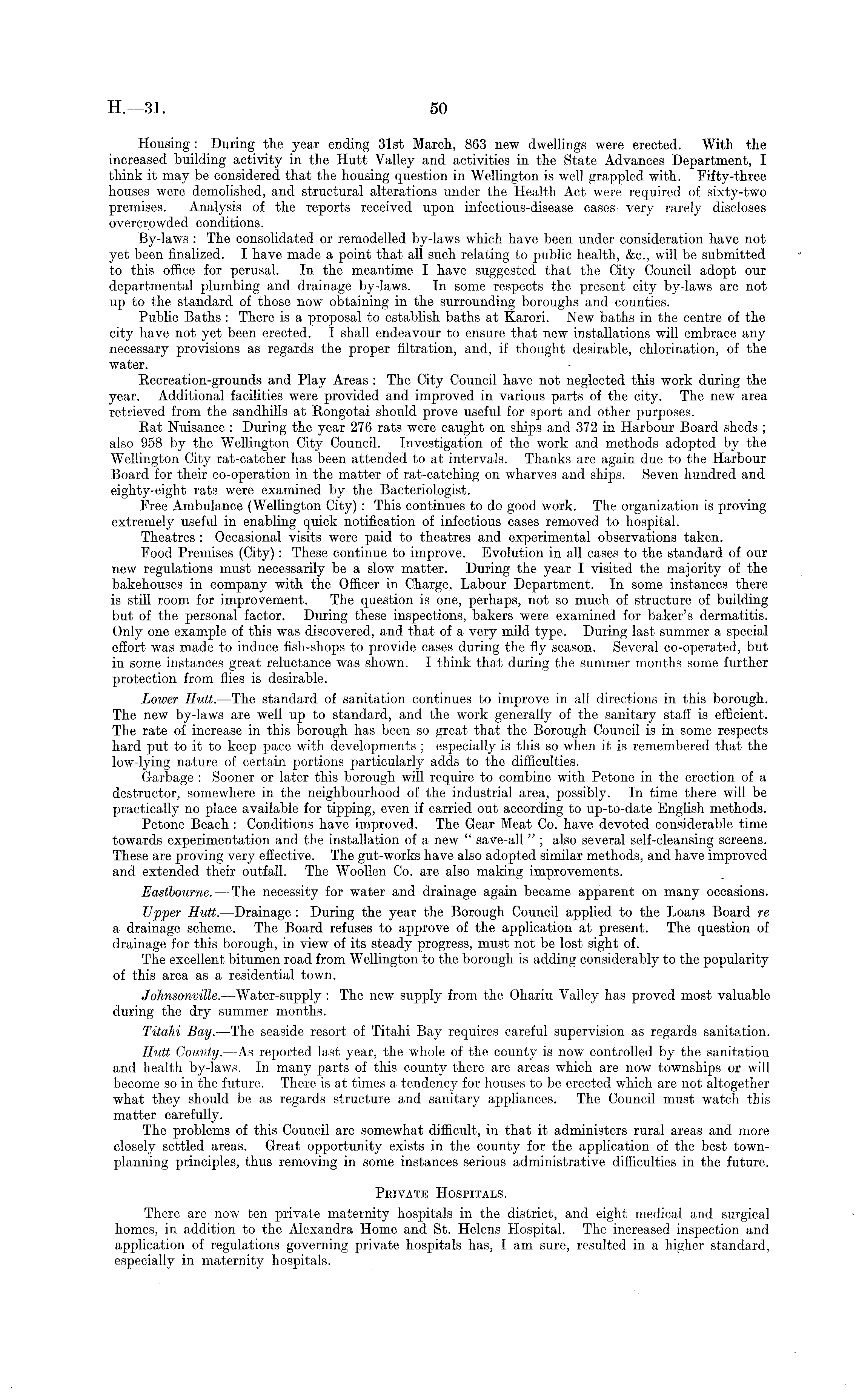 Housing: During the year ending 31st March, 863 new dwellings were erected. With the increased building activity in the Hutt Valley and activities in the State Advances Department, I think it may be considered that the housing question in Wellington is well grappled with. Fifty-three houses were demolished, and structural alterations under the Health Act were required of sixty-two premises. Analysis of the reports received upon infectious-disease cases very rarely discloses overcrowded conditions. By-laws : The consolidated or remodelled by-laws which have been under consideration have not yet been finalized. I have made a point that all such relating to public health, &c., will be submitted to this office for perusal. In the meantime I have suggested that the City Council adopt our departmental plumbing and drainage by-laws. In some respects the present city by-laws are not up to the standard of those now obtaining in the surrounding boroughs and counties. Public Baths : There is a proposal to establish baths at Karori. New baths in the centre of the city have not yet been erected. I shall endeavour to ensure that new installations will embrace any necessary provisions as regards the proper filtration, and, if thought desirable, chlorination, of the water. Recreation-grounds and Play Areas : The City Council have not neglected this work during the year. Additional facilities were provided and improved in various parts of the city. The new area retrieved from the sandhills at Rongotai should prove useful for sport and other purposes. Rat Nuisance : During the year 276 rats were caught on ships and 372 in Harbour Board sheds ; also 958 by the Wellington City Council. Investigation of the work and methods adopted by the Wellington City rat-catcher has been attended to at intervals. Thanks are again due to the Harbour Board for their co-operation in the matter of rat-catching on wharves and ships. Seven hundred and eighty-eight rats were examined by the Bacteriologist. Free Ambulance (Wellington City) : This continues to do good work. The organization is proving extremely useful in enabling quick notification of infectious cases removed to hospital. Theatres : Occasional visits were paid to theatres and experimental observations taken. Food Premises (City): These continue to improve. Evolution in all cases to the standard of our new regulations must necessarily be a slow matter. During the year I visited the majority of the bakehouses in company with the Officer in Charge, Labour Department. In some instances there is still room for improvement. The question is one, perhaps, not so much of structure of building but of the personal factor. During these inspections, bakers were examined for baker's dermatitis. Only one example of this was discovered, and that of a very mild type. During last summer a special effort was made to induce fish-shops to provide cases during the fly season. Several co-operated, but in some instances great reluctance was shown. I think that during the summer months some further protection from flies is desirable. Lower Hutt.—The standard of sanitation continues to improve in all directions in this borough. The new by-laws are well up to standard, and the work generally of the sanitary staff is efficient. The rate of increase in this borough has been so great that the Borough Council is in some respects hard put to it to keep pace with developments ; especially is this so when it is remembered that the low-lying nature of certain portions particularly adds to the difficulties. Garbage : Sooner or later this borough will require to combine with Petone in the erection of a destructor, somewhere in the neighbourhood of the industrial area, possibly. In time there will be practically no place available for tipping, even if carried out according to up-to-date English methods. Petone Beach : Conditions have improved. The Gear Meat Co. have devoted considerable time towards experimentation and the installation of a new " save-all " ; also several self-cleansing screens. These are proving very effective. The gut-works have also adopted similar methods, and have improved and extended their outfall. The Woollen Co. are also making improvements. Eastbourne. — The necessity for water and drainage again became apparent on many occasions. Upper Hutt. —Drainage : During the year the Borough Council applied to the Loans Board re a drainage scheme. The Board refuses to approve of the application at present. The question of drainage for this borough, in view of its steady progress, must not be lost sight of. The excellent bitumen road from Wellington to the borough is adding considerably to the popularity of this area as a residential town. Johnsonville. —Water-supply : The new supply from the Ohariu Valley has proved most valuable during the dry summer months. Titahi Bay.—The seaside resort of Titahi Bay requires careful supervision as regards sanitation. Hutt County. —As reported last year, the whole of the county is now controlled by the sanitation and health by-laws. In many parts of this county there are areas which are now townships or will become so in the future. There is at times a tendency for houses to be erected which are not altogether what they should be as regards structure and sanitary appliances. The Council must watch this matter carefully. The problems of this Council are somewhat difficult, in that it administers rural areas and more closely settled areas. Great opportunity exists in the county for the application of the best townplanning principles, thus removing in some instances serious administrative difficulties in the future. Private Hospitals. There are now ten private maternity hospitals in the district, and eight medical and surgical homes, in addition to the Alexandra Home and St. Helens Hospital. The increased inspection and application of regulations governing private hospitals has, I am sure, resulted in a higher standard, especially in mate