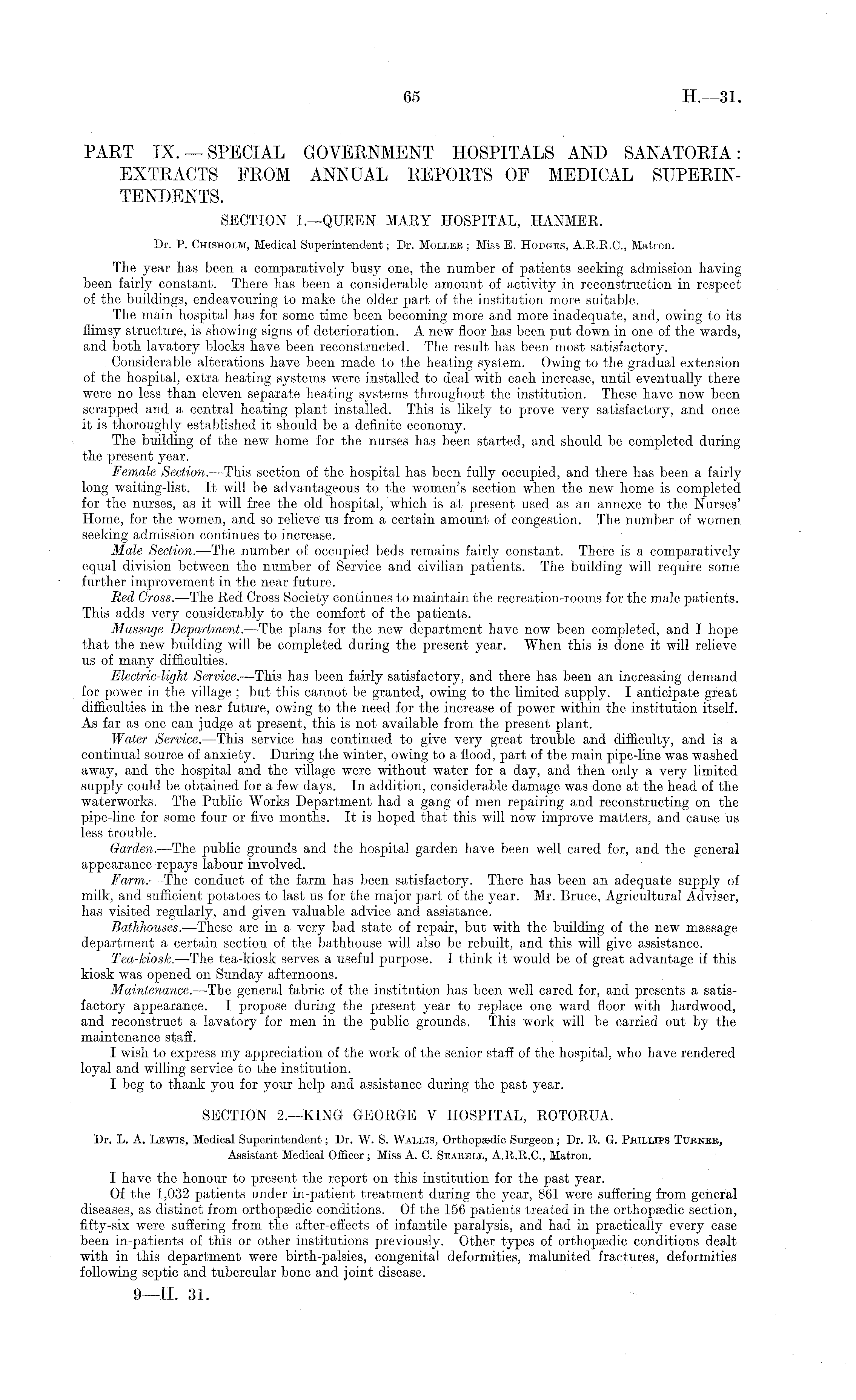 PART IX. —SPECIAL GOVERNMENT HOSPITALS AND SANATORIA: EXTRACTS FROM ANNUAL REPORTS OF MEDICAL SUPERINTENDENTS. SECTION I.—QUEEN MARY HOSPITAL, HANMER. Dr. P. Chisholm, Medical Superintendent; Dr. Moller ; Miss E. Hodges, A.R.R.C., Matron. The year has been a comparatively busy one, the number of patients seeking admission having been fairly constant. There has been a considerable amount of activity in reconstruction in respect of the buildings, endeavouring to make the older part of the institution more suitable. The main hospital has for some time been becoming more and more inadequate, and, owing to its flimsy structure, is showing signs of deterioration. A new floor has been put down in one of the wards, and both lavatory blocks have been reconstructed. The result has been most satisfactory. Considerable alterations have been made to the heating system. Owing to the gradual extension of the hospital, extra heating systems were installed to deal with each increase, until eventually there were no less than eleven separate heating systems throughout the institution. These have now been scrapped and a central heating plant installed. This is likely to prove very satisfactory, and once it is thoroughly established it should be a definite economy. The building of the new home for the nurses has been started, and should be completed during the present year. Female Section.—This section of the hospital has been fully occupied, and there has been a fairly long waiting-list. It will be advantageous to the women's section when the new home is completed for the nurses, as it will free the old hospital, which is at present used as an annexe to the Nurses' Home, for the women, and so relieve us from a certain amount of congestion. The number of women seeking admission continues to increase. Male Section.—The number of occupied beds remains fairly constant. There is a comparatively equal division between the number of Service and civilian patients. The building will require some further improvement in the near future. Red Cross. —The Red Cross Society continues to maintain the recreation-rooms for the male patients. This adds very considerably to the comfort of the patients. Massage Department.—The plans for the new department have now been completed, and I hope that the new building will be completed during the present year. When this is done it will relieve us of many difficulties. Electric-light Service.—This has been fairly satisfactory, and there has been an increasing demand for power in the village ; but this cannot be granted, owing to the limited supply. I anticipate great difficulties in the near future, owing to the need for the increase of power within the institution itself. As far as one can judge at present, this is not available from the present plant. Water Service. —This service has continued to give very great trouble and difficulty, and is a continual source of anxiety. During the winter, owing to a flood, part of the main pipe-line was washed away, and the hospital and the village were without water for a day, and then only a very limited supply could be obtained for a few days. In addition, considerable damage was done at the head of the waterworks. The Public Works Department had a gang of men repairing and reconstructing on the pipe-line for some four or five months. It is hoped that this will now improve matters, and cause us less trouble. Garden. —The public grounds and the hospital garden have been well cared for, and the general appearance repays labour involved. Farm. —The conduct of the farm has been satisfactory. There has been an adequate supply of milk, and sufficient potatoes to last us for the major part of the year. Mr. Bruce, Agricultural Adviser, has visited regularly, and given valuable advice and assistance. Bathhouses.—These are in a very bad state of repair, but with the building of the new massage department a certain section of the bathhouse will also be rebuilt, and this will give assistance. Tea-kiosk.—The tea-kiosk serves a useful purpose. I think it would be of great advantage if this kiosk was opened on Sunday afternoons. Maintenance. —The general fabric of the institution has been well cared for, and presents a satisfactory appearance. I propose during the present year to replace one ward floor with hardwood, and reconstruct a lavatory for men in the public grounds. This work will be carried out by the maintenance staff. I wish to express my appreciation of the work of the senior staff of the hospital, who have rendered loyal and willing service to the institution. I beg to thank you for your help and assistance during the past year. SECTION 2.—KING GEORGE Y HOSPITAL, ROTORUA. Dr. L. A. Lewis, Medical Superintendent; Dr. W. S. Wallis, Orthopaedic Surgeon; Dr. R. G. Phillips Turner, Assistant Medical Officer; Miss A. C. Searell, A.R.R.C., Matron. I have the honour to present the report on this institution for the past year. Of the 1,032 patients under in-patient treatment during the year, 861 were suffering from general diseases, as distinct from orthopaedic conditions. Of the 156 patients treated in the orthopaedic section, fifty-six were suffering from the after-effects of infantile paralysis, and had in practically every case been in-patients of this or other institutions previously. Other types of orthopaedic conditions dealt with in this department were birth-palsies, congenital deformities, malunited fractures, deformities following septic and tubercular bone and joint disease.
