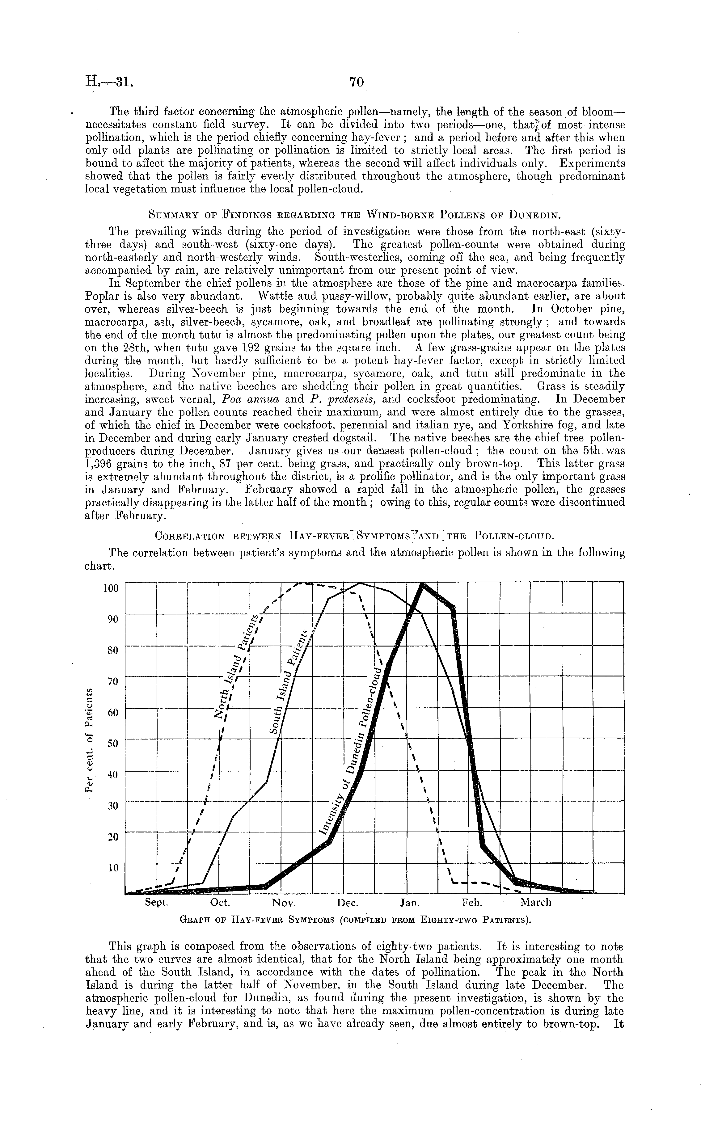 This graph is composed from the observations of eighty-two patients. It is interesting to note that the two curves are almost identical, that for the North Island being approximately one month ahead of the South Island, in accordance with the dates of pollination. The peak in the North Island is during the latter half of November, in the South Island during late December. The atmospheric pollen-cloud for Dunedin, as found during the present investigation, is shown by the heavy line, and it is interesting to note that here the maximum pollen-concentration is during late January and early February, and is, as we have already seen, due almost entirely to brown-top. It