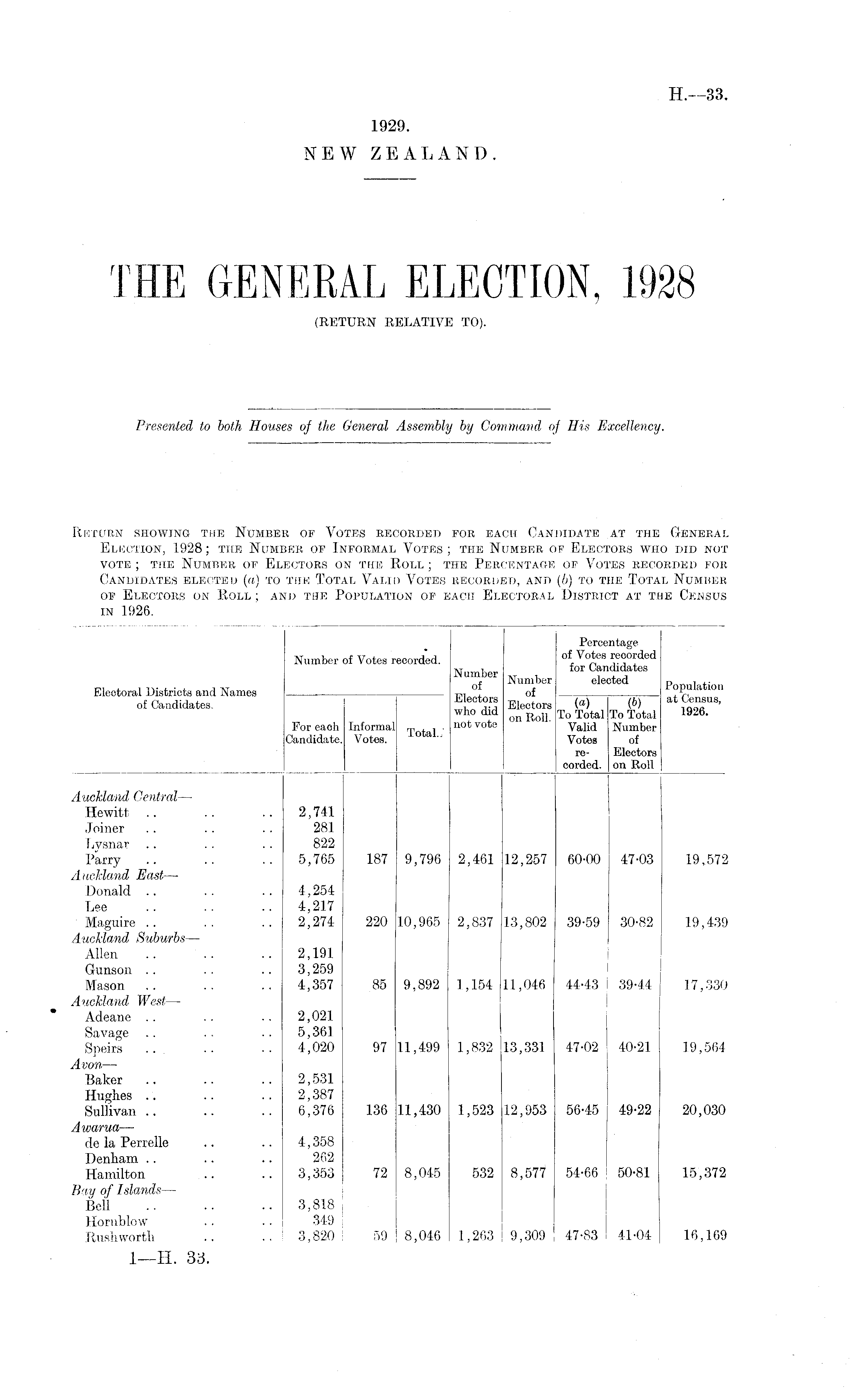 Return showing the Number of Votes recorded for each Candidate at the General Election, 1928; the Number of Informal Votes; the Number of Electors who did not vote; the Number of Electors on the Roll; the Percentage of Votes recorded for Candidates elected (a) to the Total Valid Votes recorded, and (6) to the Total Number of Electors on Roll; and the Population of each Electoral District at the Census in 1926.