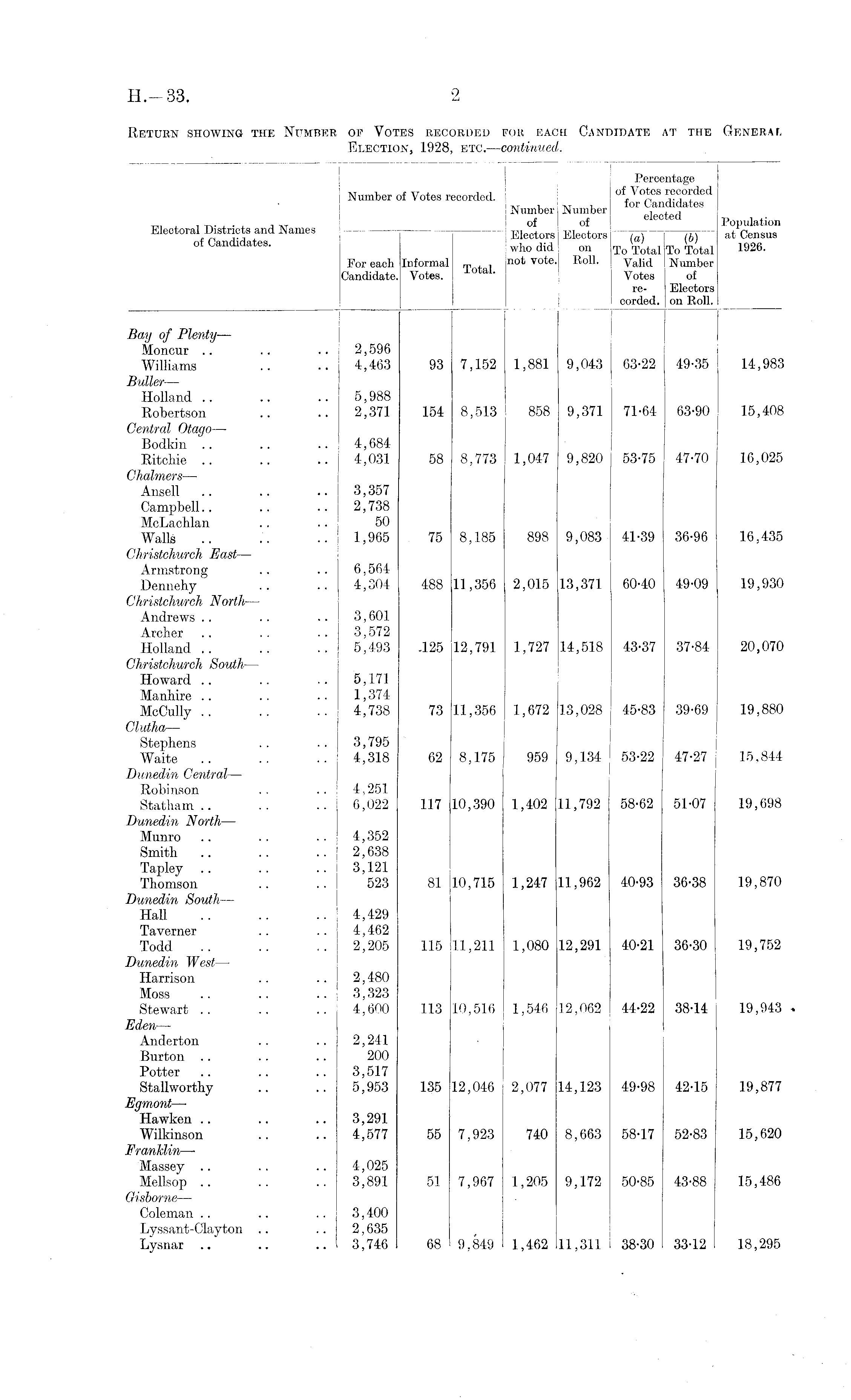 Percentage Number of Votes recorded. 1 of Votes recorded at i, at i. ior Candidates Number Number p i p0t p d i . , ,, of of Population Electoral Districts and Names _ ~ Electors Electors n,V"" at Census of Candidates. : who did on To^talTo^tal 1926. For each Informal m , , n °t vote. Roll. Valid Number Candidate. Votes. ° a ' Votes of re- Electors corded, on Roll. _ . - Bay of Plenty — | Moncur .. .. ..I 2,596 Williams .. .. 4,463 93 7,152 1,881 9,043 63-22 49-35 14,983 Buller — Holland .. .. .. 5,988 Robertson .. .. 2,371 154 8,513 858 9,371 71-64 63-90 15,408 Central Otago— Bodkin .. .. .. 4,684 Ritchie 4,031 58 8,773 1,047 9,820 53-75 47-70 16,025 Chalmers — Ansell .. .. .. 3,357 Campbell.. .. .. 2,738 McLachlan .. .. 50 Walls .. .. ..I 1,965 75 8,185 898 9,083 41-39 36-96 16,435 Christchurch East — Armstrong .. .. [ 6,564 Dennehy .. .. 4,304 488 11,356 2,015 13,371 60-40 49-09 19,930 Christchurch North — Andrews .. .. .. ! 3,601 Archer .. .. .. 3,572 Holland .. .. .. 5,493 125 12,791 1,727 14,518 43-37 37-84 20,070 Christchurch South — Howard .. .. .. 5,171 Manhire .. . . .. 1,374 McCully .. .. .. 4,738 73 11,356 1,672 13,028 45-83 39-69 19,880 Clutha— Stephens .. .. 3,795 Waite .. .. .. 4,318 62 8,175 959 9,134 53-22 47-27 15,844 Dunedin Central — Robinson .. .. 4,251 Statham.. .. .. 6,022 117 10,390 1,402 11,792 58-62 51-07 19,698 Dunedin North— Munro .. .. .. 4,352 Smith .. .. .. 2,638 Tapley .. .. .. 3,121 Thomson .. .. 523 81 10,715 1,247 11,962 40-93 36-38 19,870 Dunedin South — Hall 4,429 Taverner .. .. 4,462 Todd .. .. .. 2,205 115 11,211 1,080 12,291 40-21 36-30 19,752 Dunedin West — Harrison .. .. 2,480 Moss .. .. .. 3,323 Stewart .. .. .. 4,600 113 10,516 1,546 12,062 44-22 38-14 19,943 Eden — Anderton .. .. 2,241 Burton .. .. .. 200 Potter .. .. .. 3,517 Stallworthy .. .. 5,953 135 12,046 2,077 14,123 49-98 42-15 19,877 Egmont —- Hawken .. .. .. 3,291 Wilkinson .. .. 4,577 55 7,923 740 8,663 58-17 52-83 15,620 Franklin—Massey .. .. .. 4,025 Mellsop .. .. .. 3,891 51 7,967 1,205 9,172 50-85 43-88 15,486 Gisborne — Coleman .. .. .. 3,400 Lyssant-Clayton .. .. 2,635 Lysnar .. .. .. 3,746 68 9,849 I 1,462 11,311 38-30 33-12 18,295