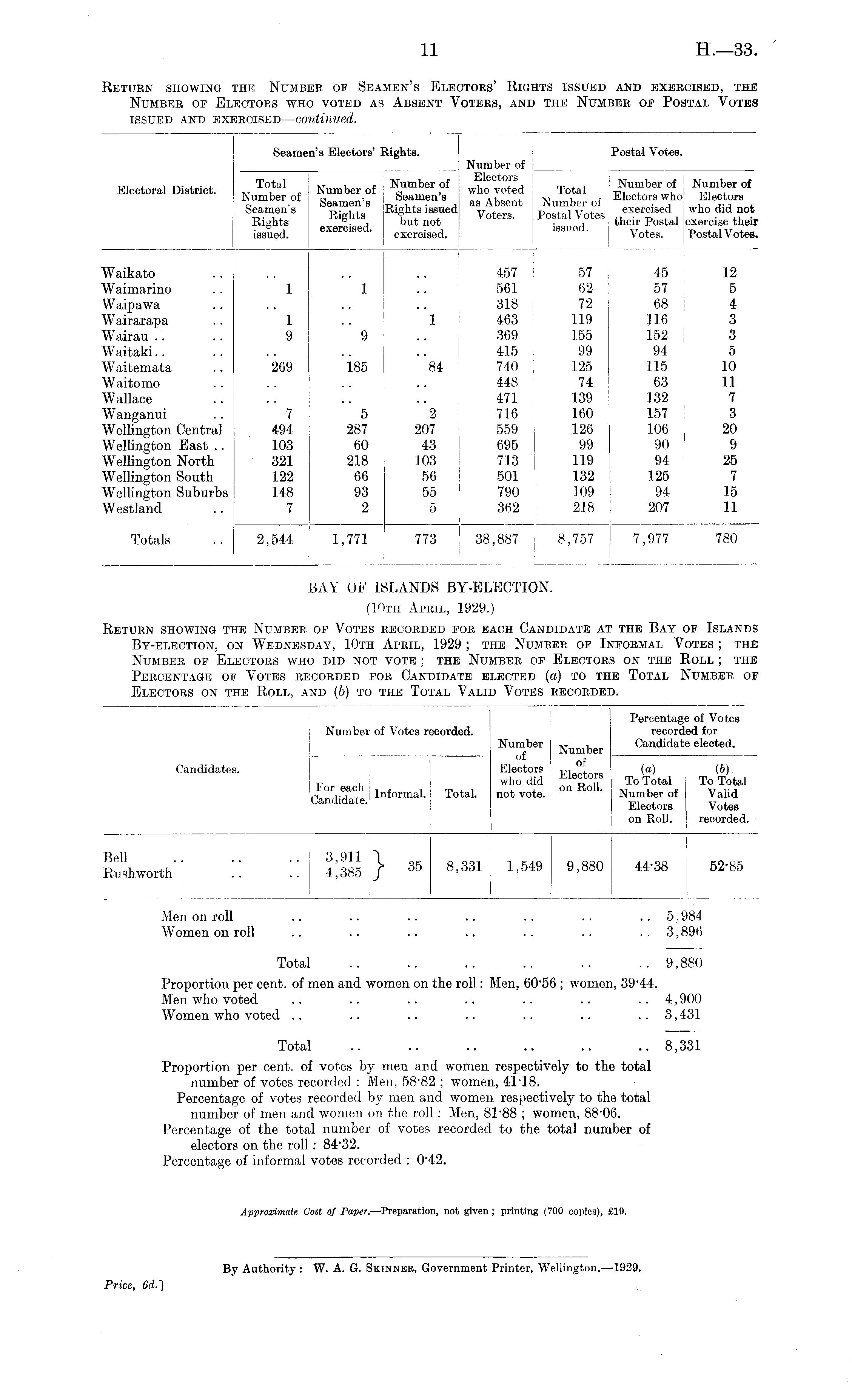 BAY Of ISLANDS BY-ELECTION. (10th April, 1929.) Return showing the Number of Votes recorded for each Candidate at the Bay of Islands By-election, on Wednesday, 10th April, 1929; the Number of Informal Votes; the Number of Electors who did not vote; the Number of Electors on the Roll; the Percentage of Votes recorded for Candidate elected (a) to the Total Number of Electors on the Roll, and (b) to the Total Valid Votes recorded.