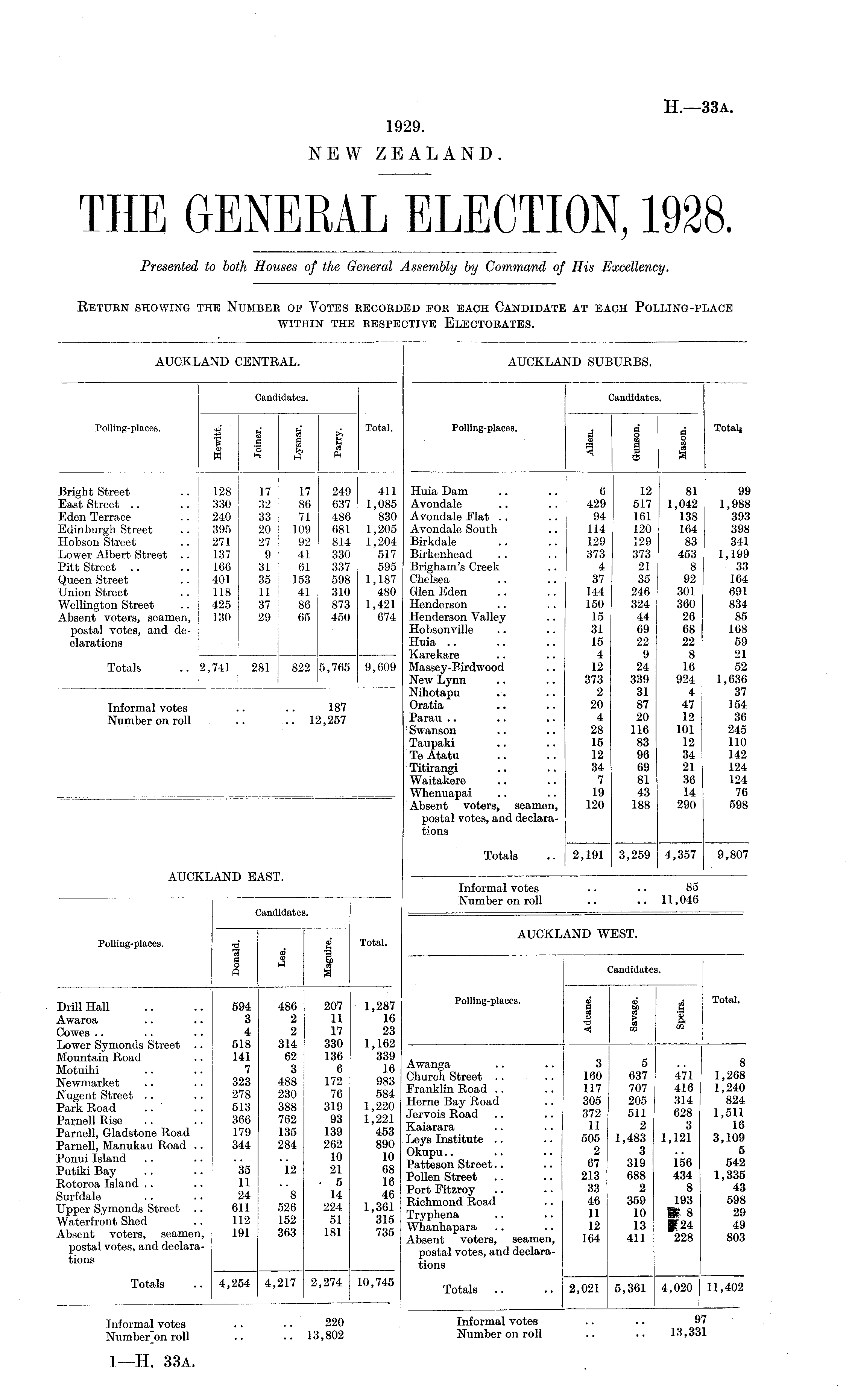 H—33a. 1929. NEW ZEALAND. THE GENERAL ELECTION, 1928. Presented to both Houses of the General Assembly by Command of His Excellency. Return showing the Number of Votes recorded for each Candidate at each Polling-place WITHIN THE RESPECTIVE ELECTORATES. AUCKLAND CENTRAL. AUCKLAND SUBURBS. Candidates. Candidates. Polling-places. -J r. m .• Total. Polling-places. . a -• Total* +2 <d <§ r> fl o S s .a $ S s s ! $ o >, £ q d £ W Hi " cs « Bright Street .. 128 17 17 249 411 Huia Dam .. .. 6 12 81 99 East Street .. ..330 32 86 637 1,085 Avondale .. .. 429 517 1,042 1,988 Eden Terrace .. 240 33 71 486 830 Avondale Flat .. .. 94 161 138 393 Edinburgh Street .. 395 20 109 681 1,205 Avondale South .. 114 120 164 398 Hobson Street .. 271 27 92 814 1,204 Birkdale .. .. 129 129 83 341 Lower Albert Street .. 137 9 41 330 517 Birkenhead .. .. 373 373 453 1,199 Pitt Street .. ..166 31 61 337 595 Brigham's Creek .. 4 21 8 33 Queen Street .. 401 35 153 598 1,187 Chelsea .. .. 37 35 92 164 Union Street .. 118 11 41 310 480 Glen Eden .. .. 144 246 301 691 Wellington Street .. 425 37 86 873 1,421 Henderson .. .. 150 324 360 834 Absent voters, seamen, 130 29 65 450 674 Henderson Valley .. 15 44 26 85 postal votes, and de- Hobsonville .. .. 31 69 68 168 elarations Huia .. .. .. 15 22 22 59 Karekare .. .. 4 9 8 21 Totals .. 2,741 281 822 5,765 9,609 Massey-Rirdwood .. 12 24 16 52 New Lynn .. .. 373 339 924 1,636 Nihotapu .. .. 2 31 4 37 Informal votes .. .. 187 Oratia .. .. 20 87 47 154 Number on roll .. .. 12,257 Parau .. .. .. 4 20 12 36 : Swanson .. .. 28 116 101 245 Taupaki .. .. 15 83 12 110 Te Atatu .. .. 12 96 34 142 Titirangi .. .. 34 69 21 124 Waitakere .. .. 7 81 36 124 ___ _ Whenuapai .. .. 19 43 14 76 Absent voters, seamen, 120 188 290 598 postal votes, and declarations Totals .. 2,191 3,259 4,357 9,807 AUCKLAND EAST. — * Informal votes . • . ■ 85 Number on roll .. .. 11,046 Candidates. == - r-- 7-:r :-7 :===: — AUCKLAND WEST. Polling-places. -d £ Total. a si '§ — fl Candidates. Drill Hall .. .. 594 486 207 1,287 Polling-places. § | „• Total. Awaroa .... 3 2 11 16 £ > & Cowes 4 2 17 23 <! M «= Lower Symonds Street .. 518 314 330 1,162 Mountain Road .. 141 62 136 339 „ _ „ Motuihi .. .. 7 3 6 16 £f an S a „, " " * Jj , * AT ™ 1 4- Q9Q /1QQ 179 QQQ CnurCil StrGGt • . . . 160 Oo7 471 l,^0o JNewmarket .. .. 0Z6 4oo iiz Alf , , 9Ar . •vt . n± i ono noA Franklin Road .. • • 117 707 41o 1,^40 paTRoad :: :: hi Is SIB •• 3 ™ Parnell Rise .. .. 366 762 93 1,221 Jervom Road .. .. 372 511 628 1,511 Parnell, Gladstone Road 179 135 139 453 .. .. 11 f ' Parnell! Manukau Road .. 344 284 262 890 *£ys Institute .. .. 505 1,483 1,121 3,109 Ponui Island .. 10 10 Street!! !67 319 156 542 Putiki Bay .. .. ■ 1- 21 Pollen Street .. .. 213 688 434 1,335 Rotoroa Island.. .. 11 .. • 6 16 p Qrt Fitzroy .. ..33 2 8 43 bur ale •, 'A, . " ri , koa ooa i qai Richmond Road .. 46 359 193 598 Upper Symonds Street .. 611 526 224 1,361 .. .. u 10 p 8 29 Waterfront Shed .. 12 152 51 315 w j^ nh .. .. 12 13 49 Absent voters, seamen, 191 363 181 735 Absent F voters seamen m 4U 228 803 postal votes, and declara- j voteg> and deolara . tlons tions Totals .. 4,254 4,217 2,274 10,745 Totak _ __ 2m 5 361 4 020 11402 Informal votes .. •• 220 Informal votes .. .. 87 Number'on roll .. .. 13,802 I Number on roll .. .. 13,331 1—H. 33A.
