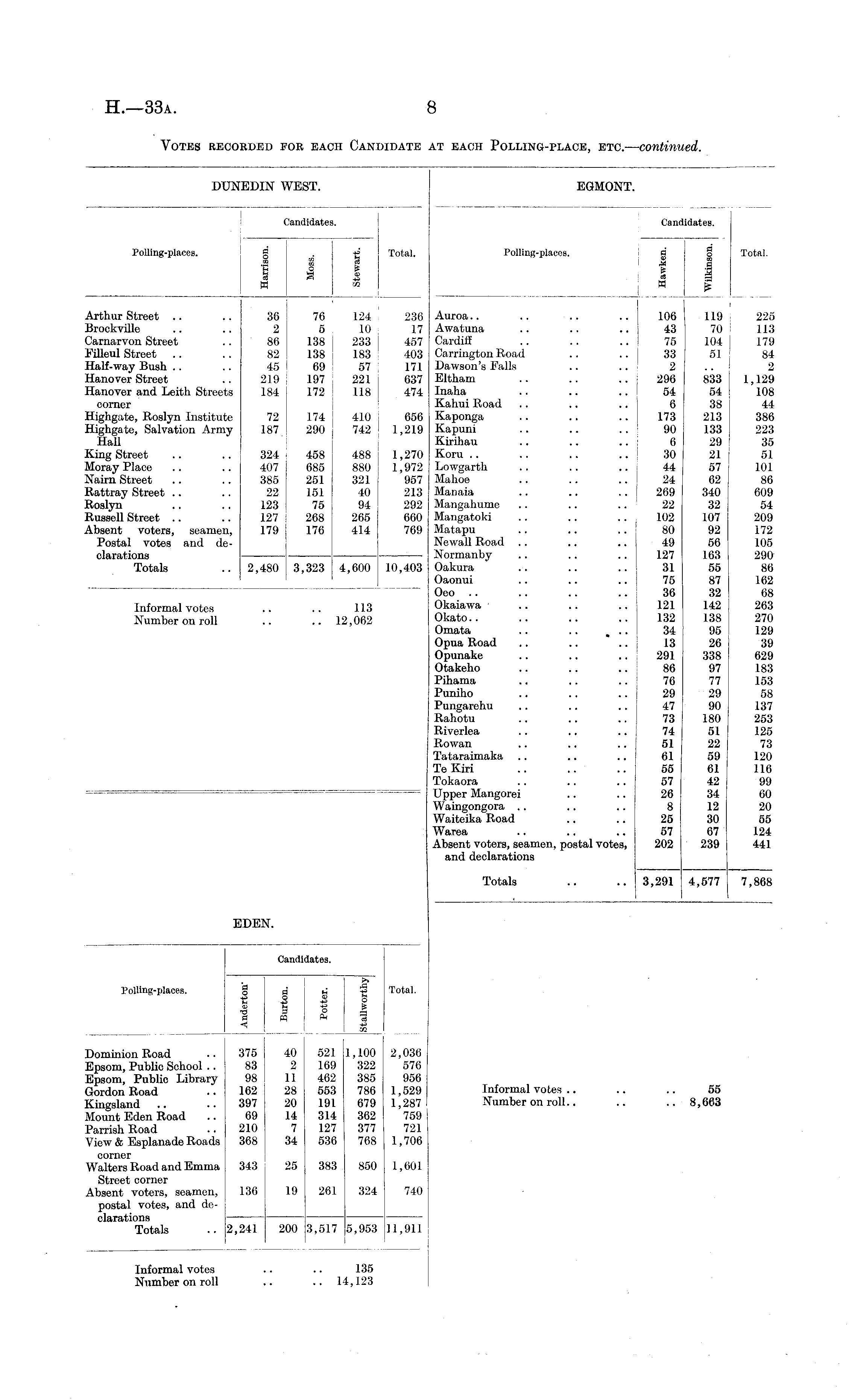 DUNEDIN WEST. EGMONT. Candidates. Candidates. Polling-places. g . -e Total. Polling-places. g o Total. I 8a S j§ a '(-I O is te •>"! 5 g * ! « a W ® H £ Arthur Street .. .. 38 76 124 236 Auroa.. .. .. .. 106 119 225 Brockville .. .. 2 5 10 17 Awatuna .. .. .. 43 70 113 Carnarvon Street .. 86 138 233 457 Cardiff .. .. .. 75 104 179 Filleul Street .. .. 82 138 183 403 Carrington Road .. .. 33 51 84 Half-way Bush .. .. 45 69 57 171 Dawson's Falls .. .. 2 .. 2 Hanover Street .. 219 197 221 637 Eltham .. .. .. 296 833 1,129 Hanover and Leith Streets 184 172 118 474 Inaha .. .. .. 54 54 108 corner Kahui Road .. .. .. 6 38 44 Highgate, Roslyn Institute 72 174 410 656 Kaponga .. .. .. 173 213 386 Highgate, Salvation Army 187 290 742 1,219 Kapuni .. .. .. 90 133 223 Hall Kirihau .. .. .. 6 29 35 King Street .. .. 324 458 488 1,270 Koru .. .. .. .. 30 21 51 Moray Place .. .. 407 685 880 1,972 Lowgarth .. .. .. 44 57 101 Nairn Street .. .. 385 251 321 957 Mahoe .. .. .. 24 62 86 Rattray Street .. .. 22 151 40 213 Manaia .. .. .. 269 340 609 Roslyn .. .. 123 75 94 292 Mangahume .. .. .. 22 32 54 Russell Street .. .. 127 268 265 660 Mangatoki .. .. .. 102 107 209 Absent voters, seamen, 179 176 414 769 Matapu .. .. .. 80 92 172 Postal votes and de- Newall Road .. .. .. 49 56 105 clarations Normanby .. .. .. 127 163 290 Totals .. 2,480 3,323 4,600 10,403 Oakura .. .. .. 31 55 86 Oaonui .. .. .. 75 87 162 Oeo .. .. .. 36 32 68 Informal votes .. .. 113 Okaiawa .. .. .. 121 142 263 Number on roll .. .. 12,062 Okato.. .. .. .. 132 138 270 Omata .. .. ... 34 95 129 Opua Road .. .. .. 13 26 39 Opunake .. .. .. 291 338 629 Otakeho .. .. .. 86 97 183 Pihama .. .. .. 76 77 153 Puniho .. .. .. 29 29 58 Pungarehu .. .. .. 47 90 137 Rahotu .. .. .. 73 180 253 Riverlea .. .. .. 74 51 125 Rowan .. .. .. 51 22 73 Tataraimaka .. .. .. 61 59 120 TeKiri .. .. .. 55 61 116 Tokaora .. .. .. 57 42 99 Upper Mangorei .. .. 26 34 60 Waingongora .. .. .. 8 12 20 Waiteika Road .. .. 25 30 55 Warea .. .. .. 57 67 124 Absent voters, seamen, postal votes, 202 239 441 and declarations Totals .. .. 3,291 4,577 7,868 EDEN. Candidates. . Polling-places. § d n 5 Total. a "fi is > ■§§11 s « a « a Dominion Road .. 375 40 521 1,100 2,036 Epsom, Public School .. 83 2 169 322 576 Epsom, Public Library 98 11 462 385 956 Gordon Road .. 162 28 553 786 1,529 Informal votes .. .. .. 55 Kingsland .. .. 397 20 191 679 1,287 Number on roll.. .. .. 8,6e3 Mount Eden Road .. 69 14 314 362 759 ParrishRoad .. 210 7 127 377 721 View & Esplanade Roads 368 34 536 768 1,706 corner Walters Road and Emma 343 25 383 850 1,601 Street corner Absent voters, seamen, 136 19 261 324 740 postal votes, and declarations Totals .. 2,241 200 3,517 5,953 11,911 Informal votes .. .. 135 Number on roll .. .. 14,123