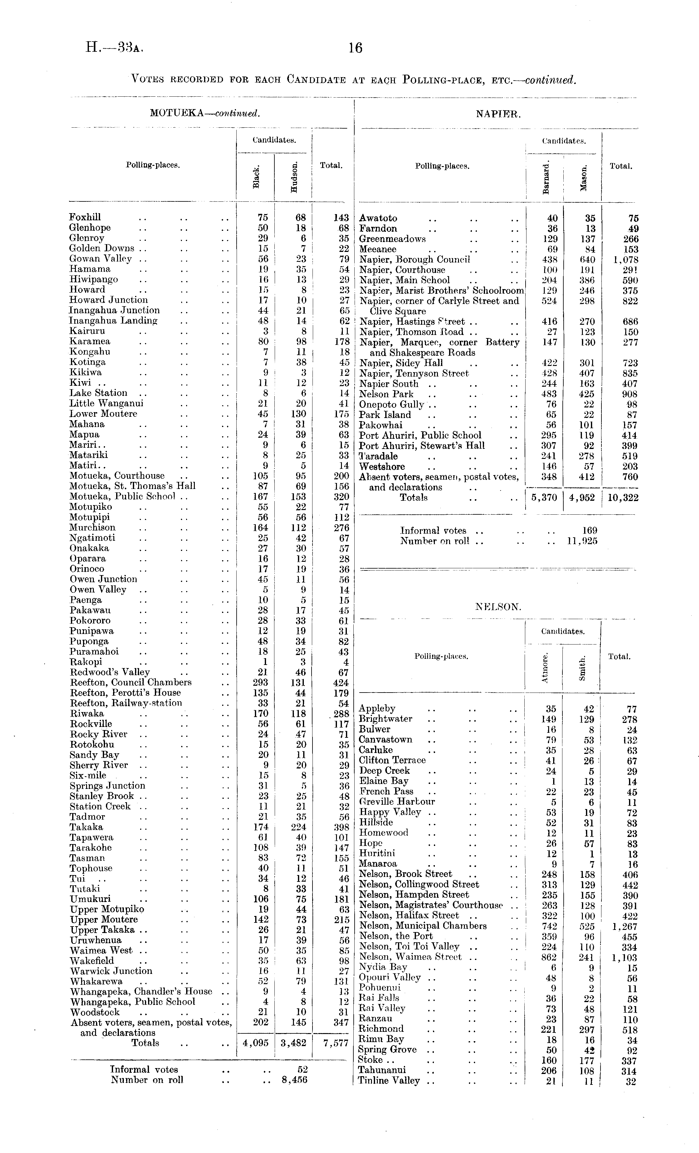 MOTUEKA—continued. NAPIER. Candidates. Candidates. Polling-places. g Total. Polling-places. xs Total. o w | ce ; o a n o 2 * w I I J a Foxhill .. .. .. 75 68 J 43 Awatoto .. .. .. 40 35 75 Glenhope .. .. .. 50 18 68 Farndon .. .. .. 36 13 49 Glenroy .. .. .. 29 6 35 Greenmeadows .. .. 129 137 266 Golden Downs .. . . .. 15 7 22 Meeanee .. .. .. 69 84 153 Gowan Valley .. .. .. 56 23 79 Napier, Borough Council .. 438 640 1,078 Hamama . . . . .. 19 35 54 Napier, Courthouse .. .. 100 191 291 Hiwipango .. .. .. 16 13 29 Napier, Main School .. .. 204 386 590 Howard .. .. .. 15 8 23 Napier, Marist Brothers' Schoolroom 129 246 375 Howard Junction .. .. 17 10 j 27 Napier, comer of Carlyle Street and 524 298 822 Inangahua Junction . . .. 44 21 65 Clive Square Inangahua Landing .. . . 48 14 62 Napier, Hastings Ptreet .. .. 416 270 686 Kairuru .. .. .. 3 8 11 Napier, Thomson Road .. .. 27 123 150 Karamea .. . . .. 80 98 178 Napier, Marquee, corner Battery 147 130 277 Kongahu .. .. .. 7 11 j 18 and Shakespeare Roads Kotinga .. .. .. 7 38 45 Napier, Sidey Hall .. .. 422 301 723 Kikiwa .. .. .. 9 3 12 Napier, Tennyson Street .. 428 407 835 Kiwi .. .. .. .. 11 12 23 Napier South .. .. .. 244 163 407 Lake Station .. . . .. 8 6 14 Nelson Park .. .. .. 483 425 908 Little Wanganui .. .. 21 20 41 Onepoto Gully .. .. .. 76 22 98 Lower Moutere . . .. 45 130 175 Park Island " .. .. .. 65 22 87 Mahana .. . . .. 7 31 38 Pakowhai .. .. .. 56 101 157 Mapua .. . . .. 24 39 63 Port Ahuriri, Public School .. 295 119 414 Mariri.. .. .. .. 9 6 15 Port Ahuriri, Stewart's Hall .. 307 92 399 Matariki .. .. .. 8 25 33 Taradale .. .. .. 241 278 519 Matin.. .. .. .. 9 5 1 14 Westshore .. .. .. 146 57 203 Motueka, Courthouse .. .. 105 95 I 200 Absent voters, seamen, postal votes, 348 412 j 760 Motueka, St. Thomas's Hall . . 87 69 156 and declarations .. Motueka, Public School .. .. 167 153 320 Totals .. .. 5,370 4,952 j 10,322 Motupiko ...... 55 22 77 Motupipi .. .. .. 56 56 112 Murchison .. .. .. 164 112 276 Informal votes .. .. .. 169 Ngatimoti 25 42 67 Number on roll 11,925 Onakaka .. . . .. 27 30 57 Oparara .. .. .. 16 12 28 Orinoco .. .. .. 17 19 36 Owen Junction .. .. 45 11 56 Owen Valley .. .. .. 5 9 14 Paenga .. .. .. 10 5 15 AT „ T Pakawau .. .. .. 28 17 45 NELSON. Pokororo .. .. .. 28 33 61 j — Punipawa .. .. .. 12 19 31 Candidates. Puponga .. . . .. 48 34 82 Puramahoi .. .. .. 18 25 43 • nw. Rakopi . . . . . . 1 3 4 Polling-places. g • Total. Redwood's Valley .... 2.1 46 67 $ S Reefton, Council Chambers .. 293 131 424 Reefton, Perotti's House .. 135 44 179 j — ; Reefton, Railway-station . . 33 21 54 Atmlpbv | „ 77 Riwaka 170 118 288 t P . P ! f 5 , I * 2 " Rockville 56 61 117 " r f htwater 129 2 ™ Rocky River .. .. .. 24 47 71 ® ulwer • • '' " i i*> 8 24 Rotokohu 15 20 35 79 53 132 Sandy Bay .. .. .. 20 11 31 pf-l T " " " , ? on fr Sherrv River 9 *>0 2 9 Clifton Terrace .. .. 41 26 67 Six m le 15 8 23 DeepCreek 24 5 29 Springs Junction " " 31 5 36 ' J3 " Stanlev Brook 23 25 48 1,1:611011 Pass •• •• 22 23 45 Station Creek " " " 11 21 32 Harbour .. .. 5 6 11 Tadmor 21 35 56 Happy Valley 53 19 72 Takaka . . . . 174 224 398 hillside .. .. .. 52 31 83 Tapawera 61 40 101 H° mewood 12 U 28 Taiakohe .. .. .. 108 39 147 • " " " i ?! Tasman .. . . . . 83 72 155 S m '' '' ' ' 12 I Tollhouse 40 11 <il Manaroa •• •• •• 9 7 16 !o Nelson, Brook Street .. .. 248 158 406 Tntow" 8 '!■< J1 Nelson, Collingwood Street .. 313 129 442 TJmukuri 106 75 181 Nelaon > Hampden Street . . 235 155 390 Upper Motupiko' " 19 44 63 Nelson, Magistrates'Courthouse .. 263 128 391 Upper Moutere .. .. 142 73 215 Nekon, Halifax Street .. 322 100 422 Upper Takaka 26 21 47 Nelson, Municipal Chambers .. 742 525 1,267 Uruwhenua 17 39 56 Nebon, the Port .. .. 359 96 455 WaimeaWest 50 35 85 Nekon, Toi Toi Valley .. .. 224 110 334 Wakefield 35 63 98 Nelson, Waimea Street .. .. 862 241 1,103 Warwick Junction .. .. 16 11 27 NyduiBay .. .. .. j 6 9 15 Whakarewa. .. .. .. 52 79 131 Opoun Valley .. .. .. 48 8 56 Whangapeka, Chandler's House .. 9 4 13 ,,°. 1 " " '' 9 2 11 Whangapeka, Public School .. 4 8 12 £ a ! * a s " " " 36 22 58 Woodstock 21 10 31 « a 'Valley 73 48 121 Absent voters, seamen, postal votes, 202 145 347 i:f' 1 ? zau ** ** •• 87 and declarations Richmond 221 297 518 Totals .. .. 4,095 3,482 7,577 R™ 11 Bay •• •• •• 18 16 34 Spring Grove .. .. . . 50 42 92 — Stoke .. .. .. .. 160 177 337 Informal votes .. .. 52 Tahunanui .. .. .. 206 108 314 Number on roll .. .. 8,456 Tinline Valley .. .. .. 21 11 32